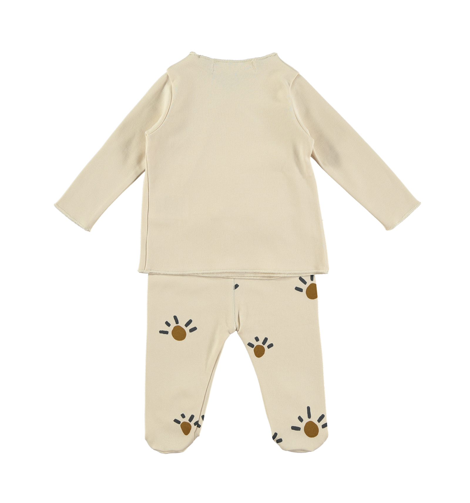 El gipó té un còmode talli quimono que facilita el canvi de roba i s'ajusta amb cintes de cotó, assegurant un ajust suau i sense pressió. La polaina compta amb una cintura alta sense goma, proporcionant major comoditat i evitant marques en la pell del bebè.