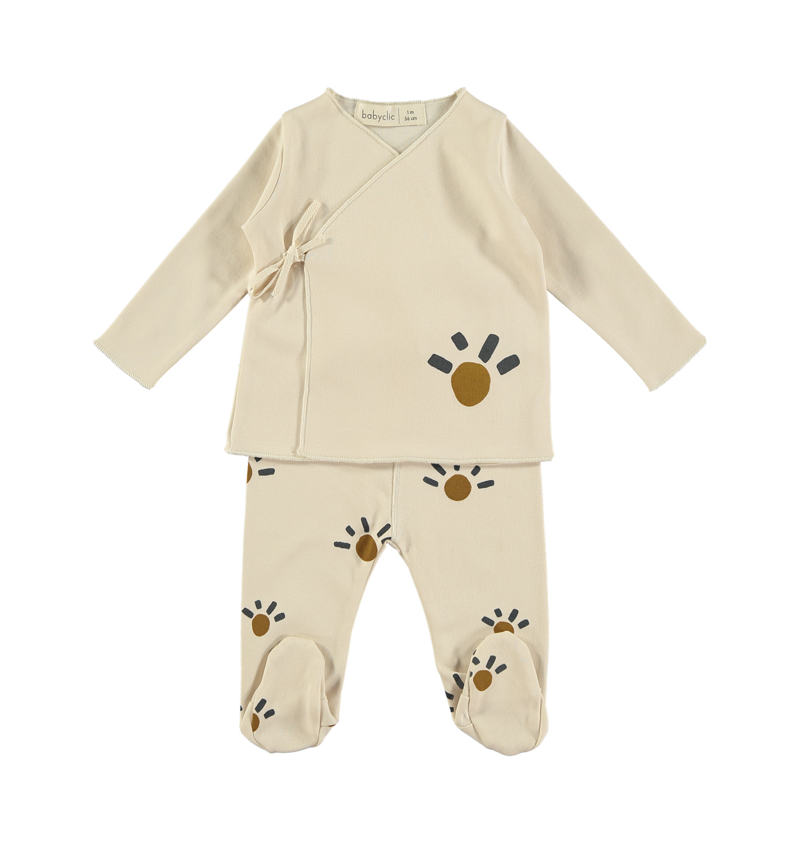 Conjunt de naixement Babyclic en punt interlock 100% cotó orgànic. Inclou un gipó de tall quimono amb tancament de cintes de cotó i una polaina amb cintura alta sense goma per a major comoditat.