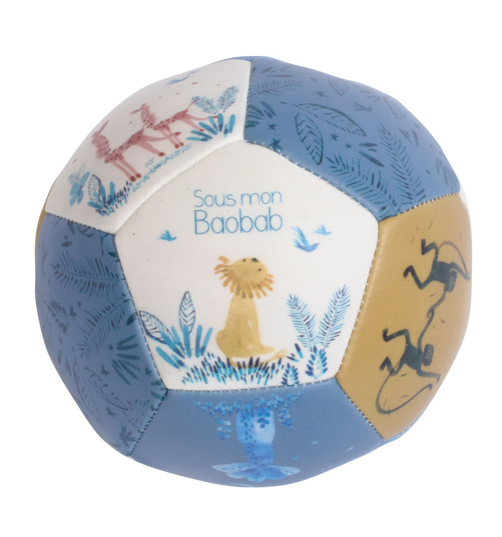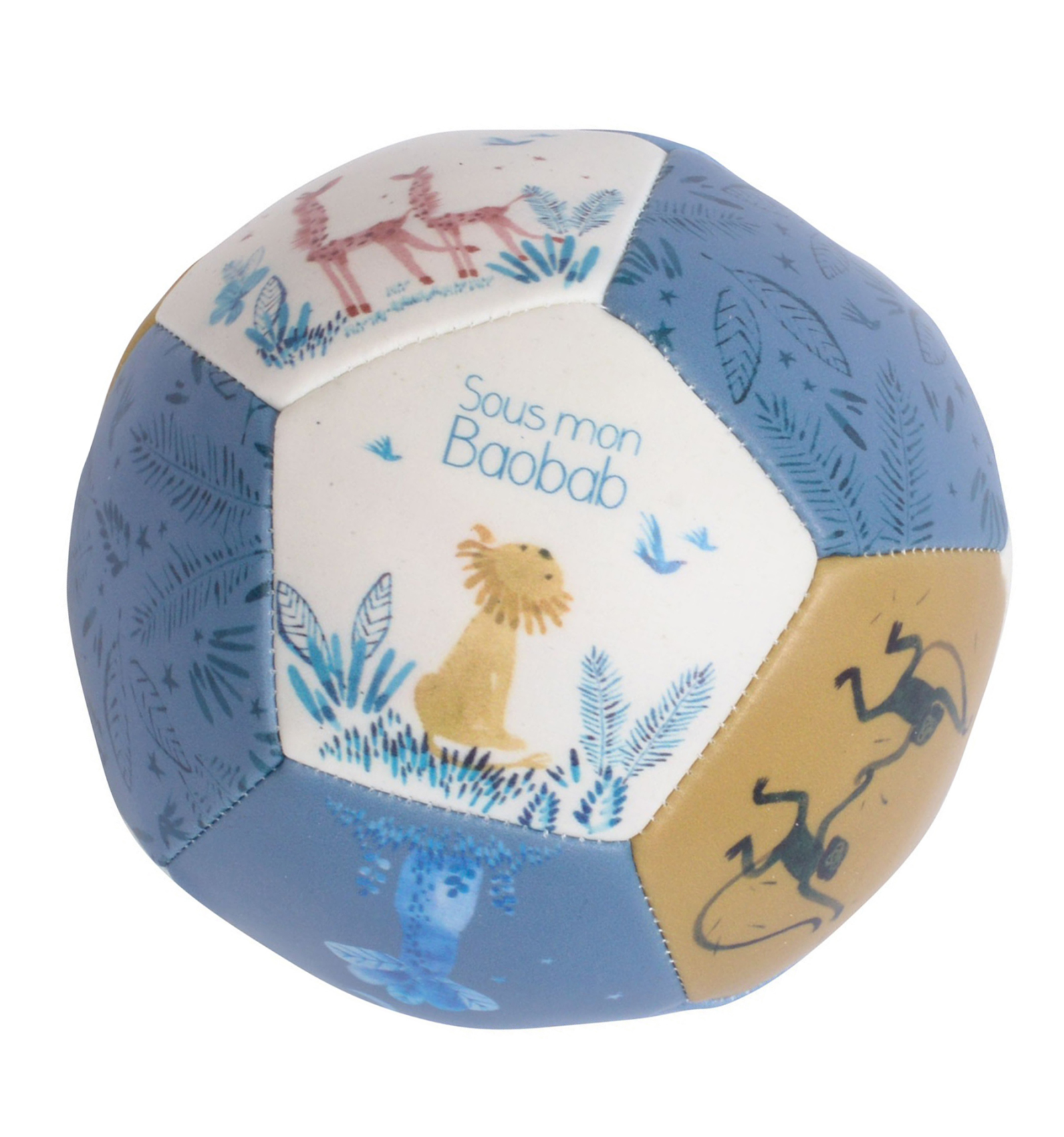 Per a començar a agafar objectes, xutar, tirar,... Una suau i divertida pilota de Moulin Roty amb el lleó Paprika, la girafa Bibiscus i l'elefant Bergamote a la selva. Mides: 10 cm. A partir de 10 mesos.