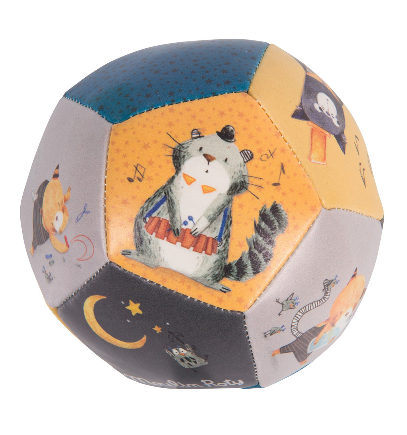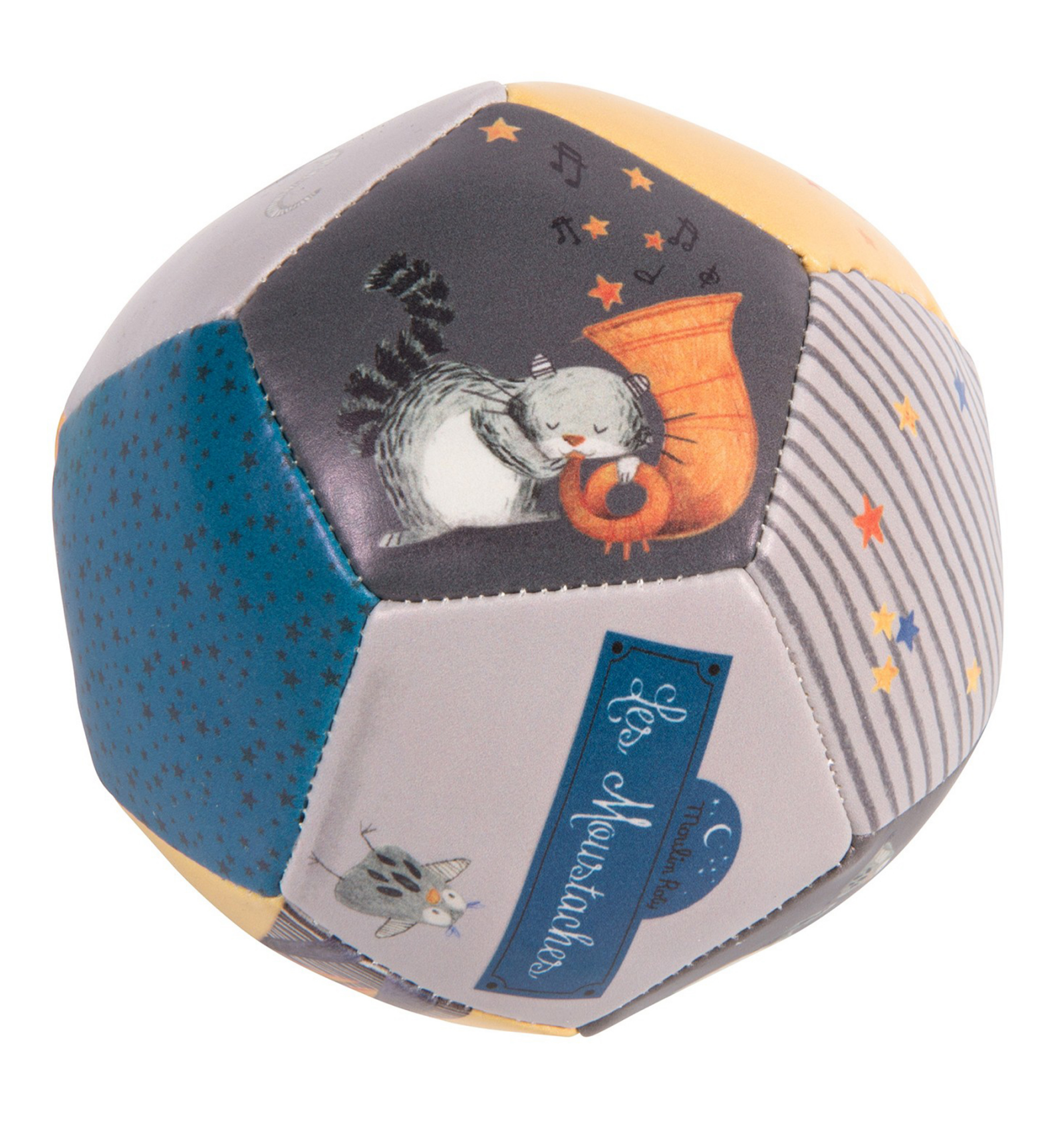 Per a començar a agafar objectes, xutar, tirar,... Una suau i divertida pilota de Moulin Roty amb els gats músics de Els Bigotuts. Mides: 10 cm. A partir de 10 mesos.