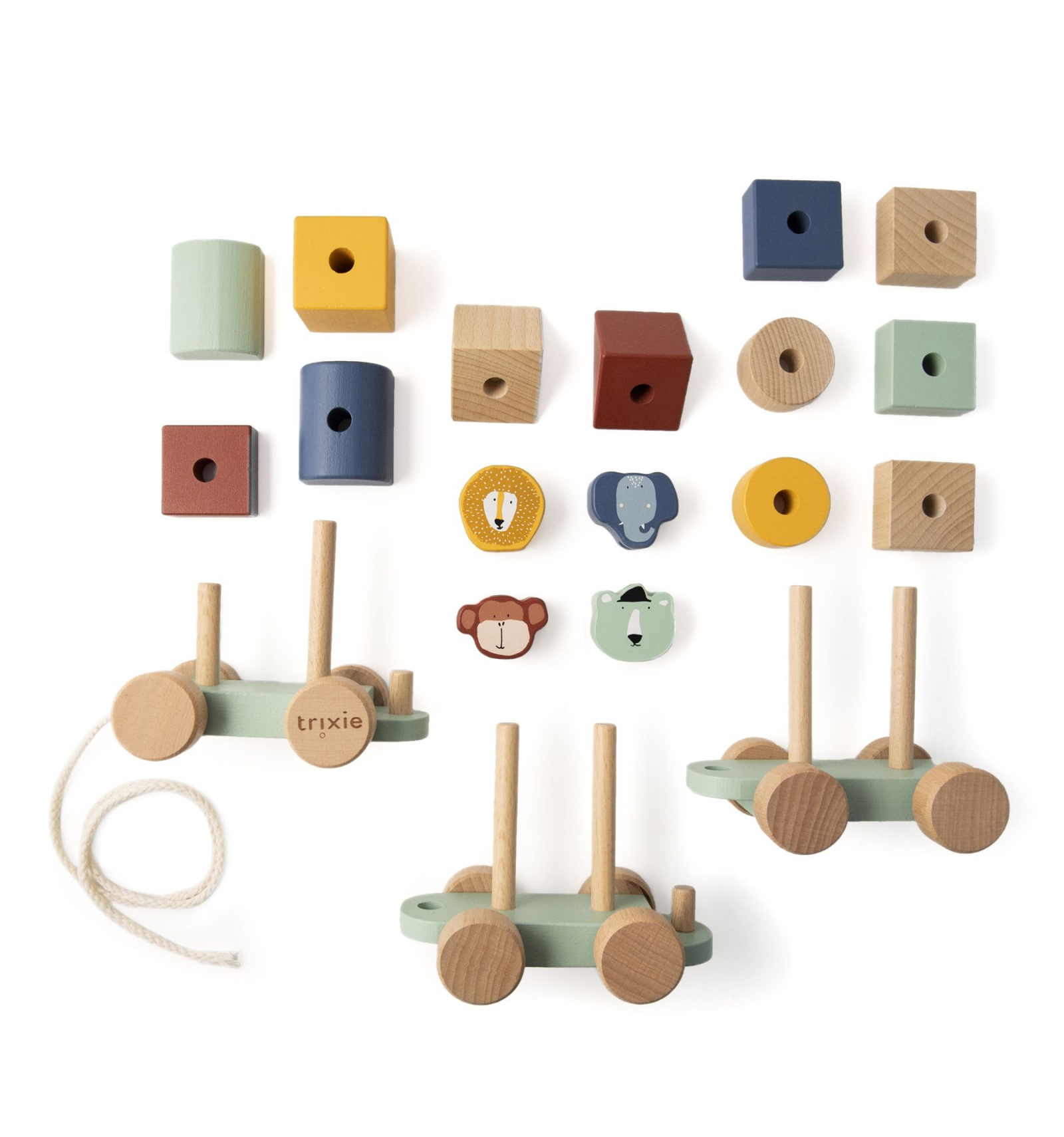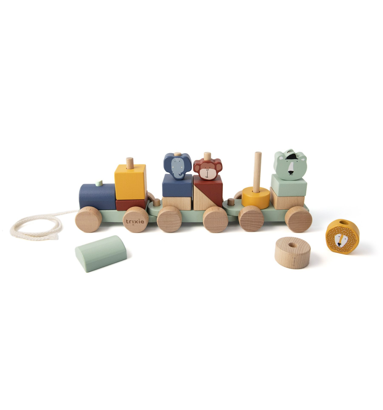 Passatgers al tren! Puja al tren amb el lleó, l'elefant, el mico i l'ós. Gràcies als blocs de colors podràs dissenyar tu els vagons. I un cop tots estiguin a bord, arrossega el tren amb la corda per portar-los a la propera parada. Amb aquest divertit tren de Trixie el teu petit tindrà moltes aventures emocionants.