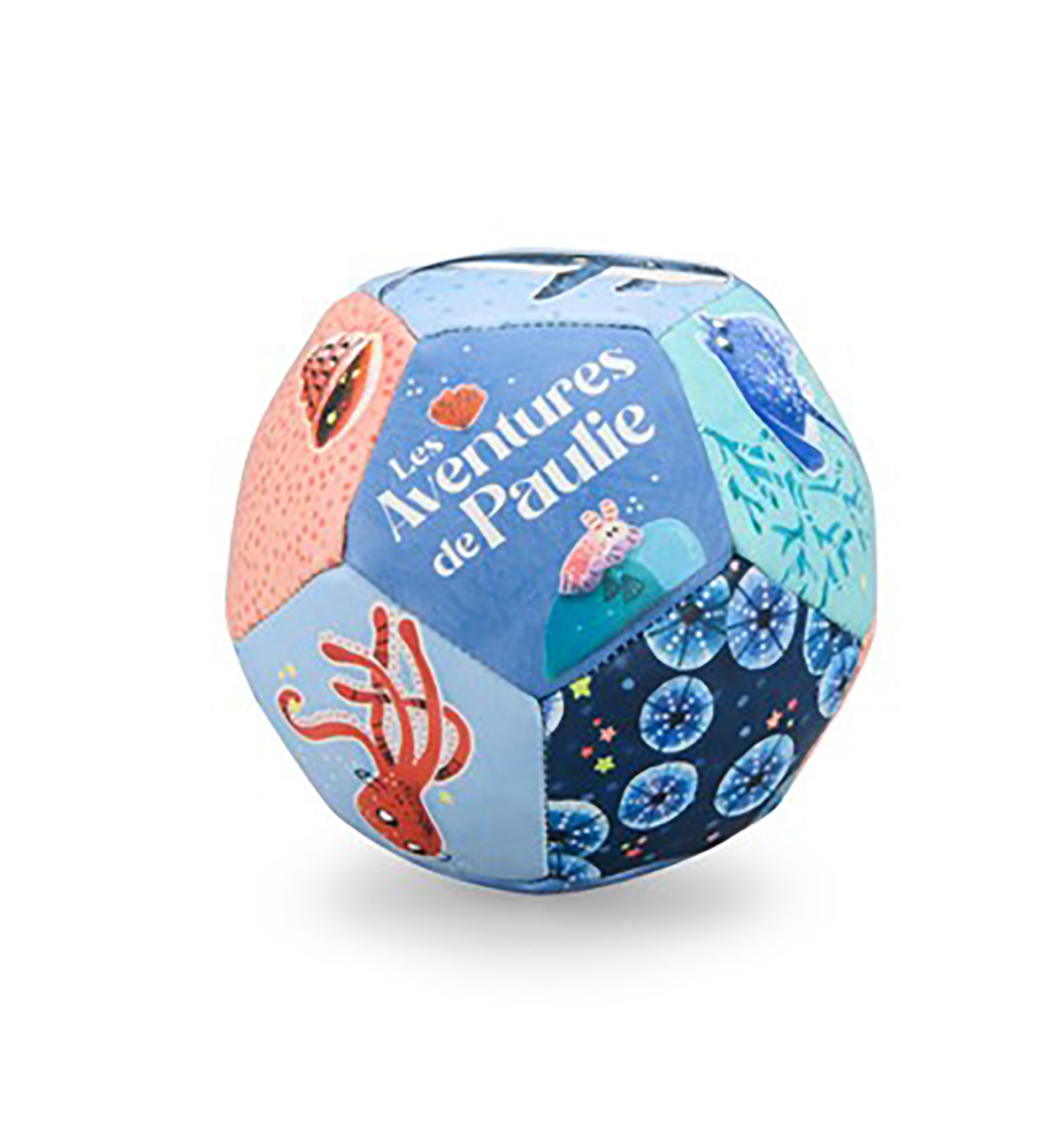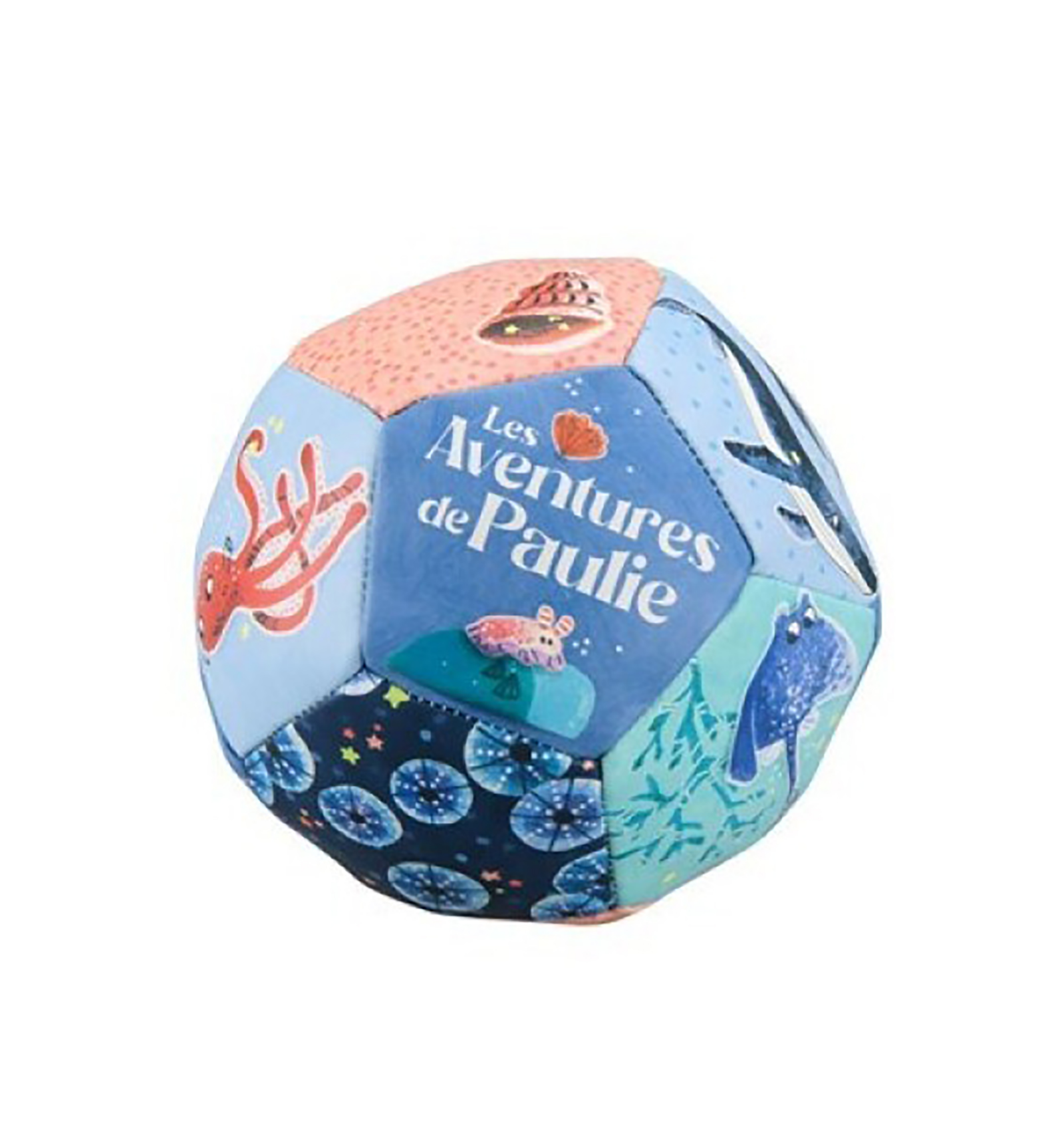 Per a començar a agafar, xutar, tirar... Una suau i divertida pilota de Moulin Roty amb els personatges de la col·lecció de les Aventures de Paulie; Paulie, Maria, Sra. Balena o Senyor Cranc… en el seu hàbit natural. Mides: 10 cm. A partir de 10 mesos.