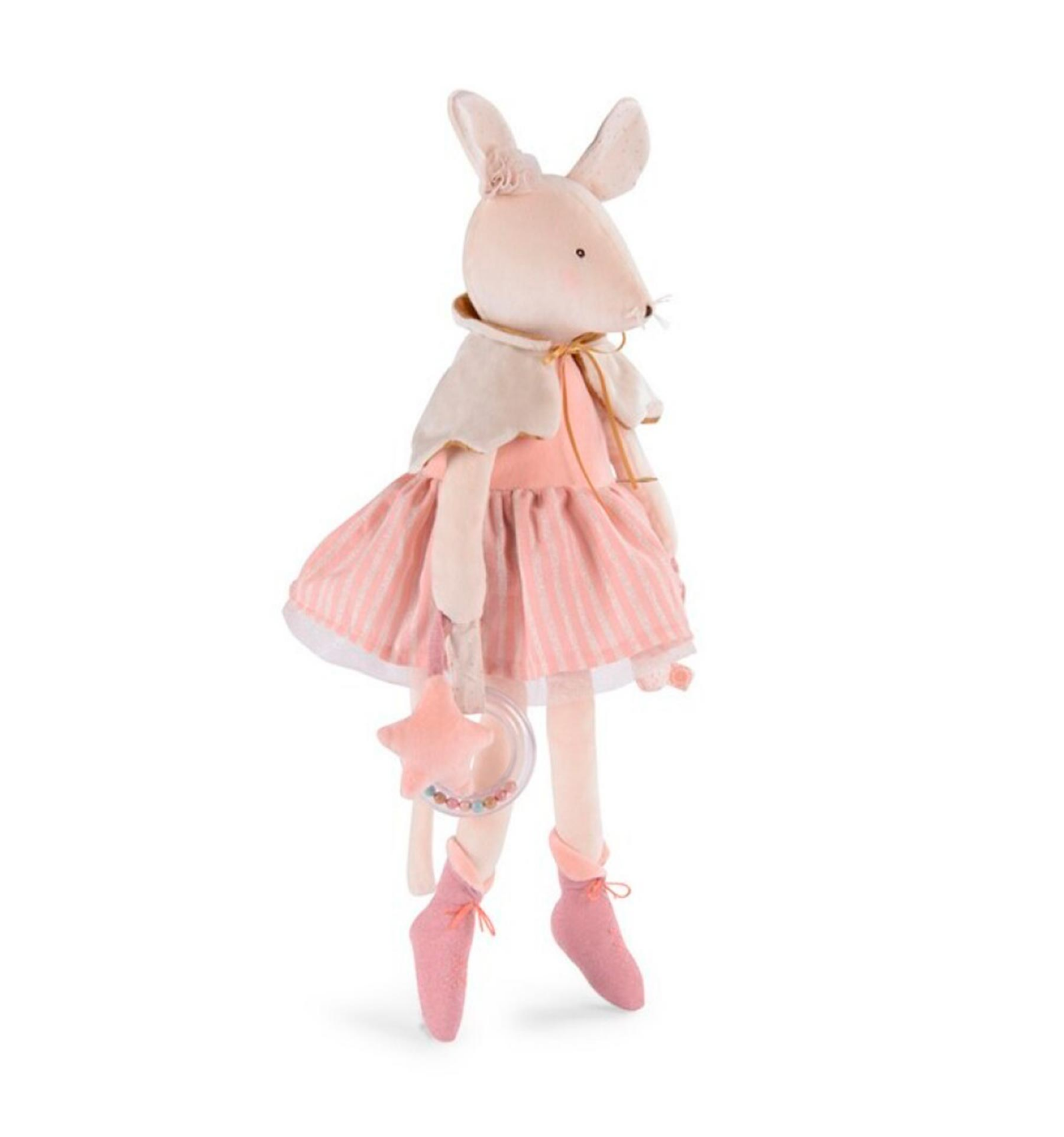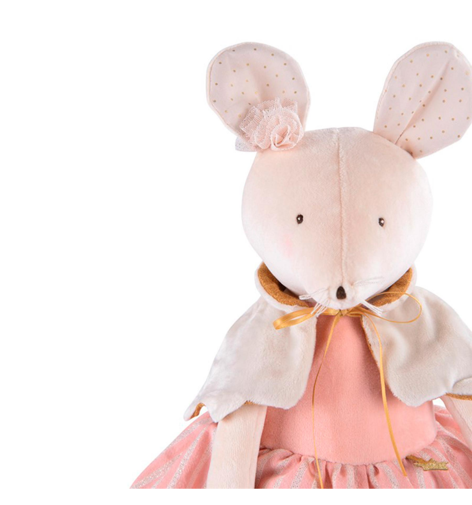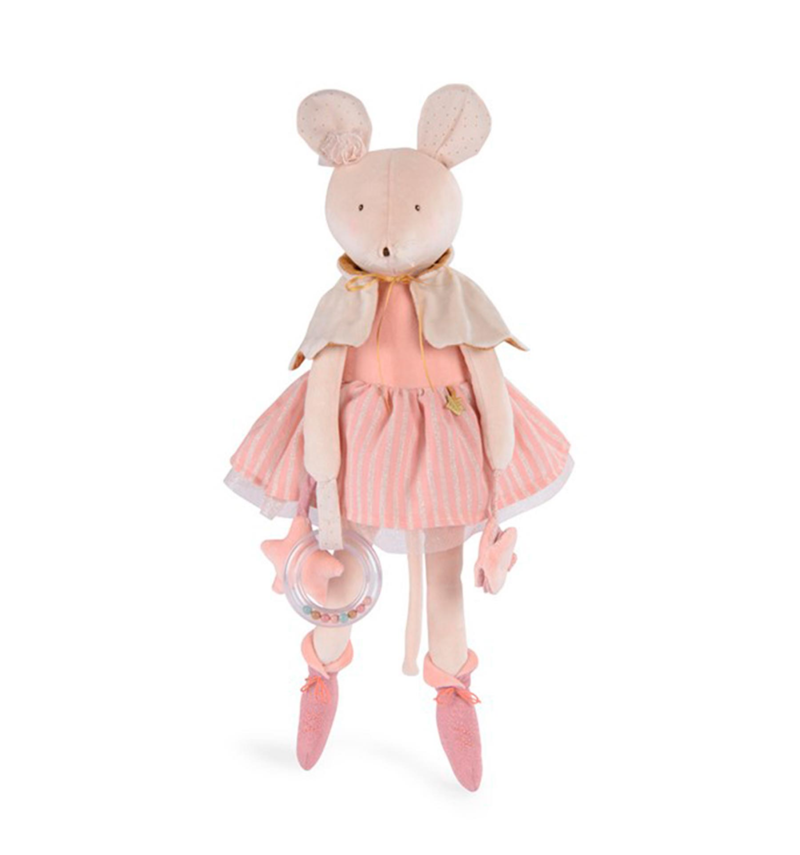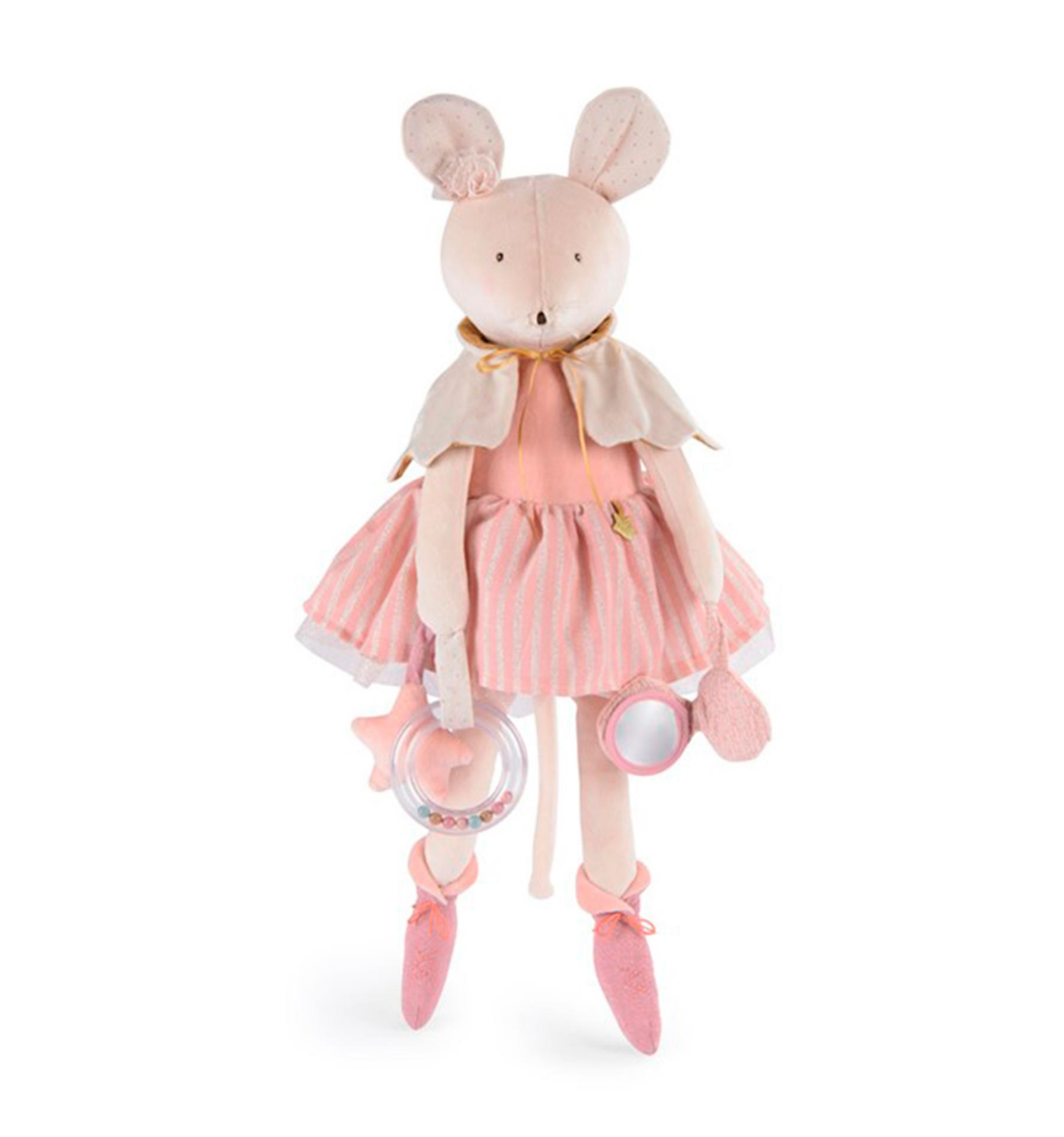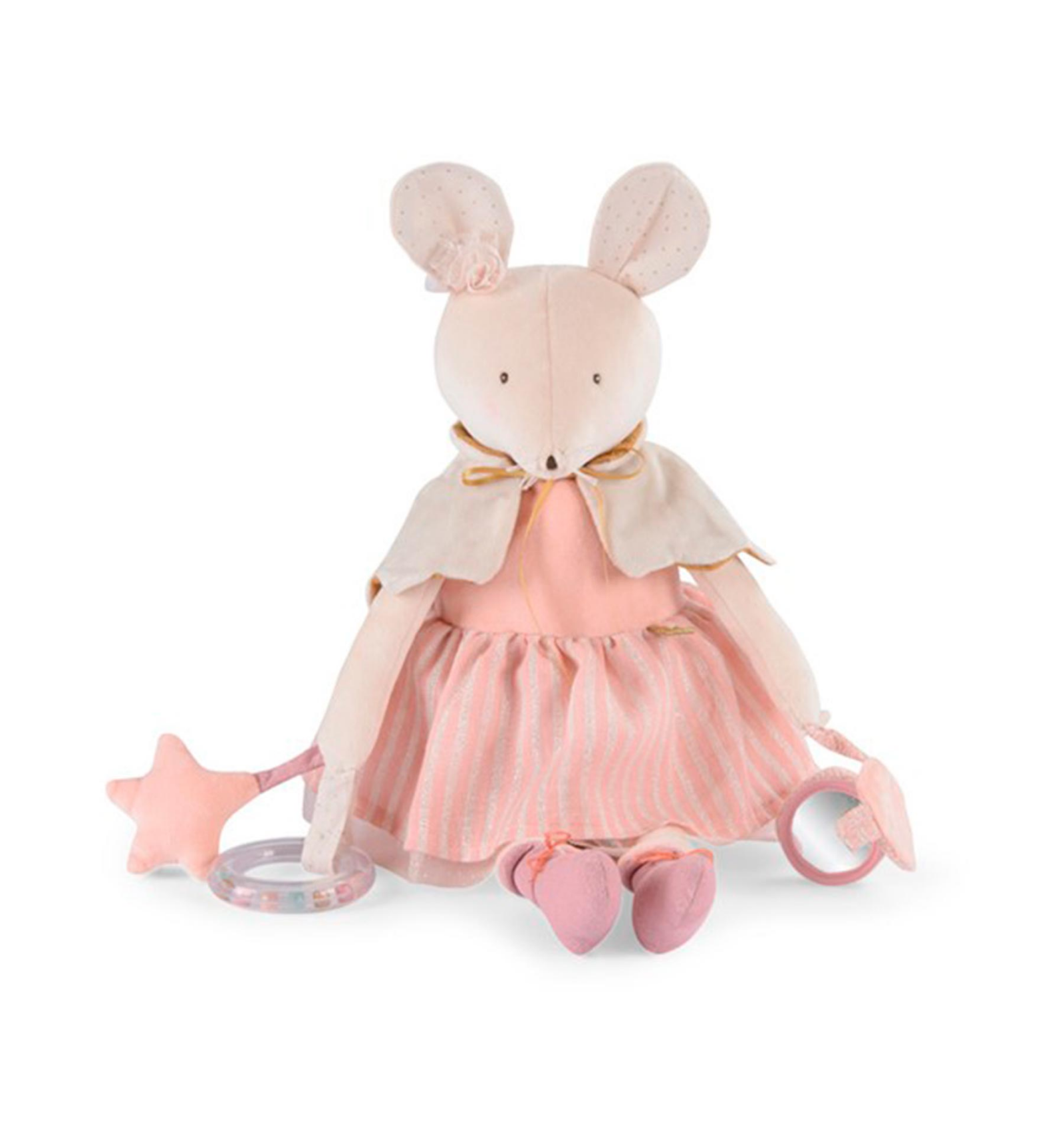 La gran ratolina d'activitats en vellut acompanyarà els petits en la seva exploració amb cascavells, anell amb boletes de colors, paper cruixent, mirall… A més, comporta la seva petita estrella que fa sons divertits. Perfecta per a les primeres experiències de joc i descobriment dels nadons.