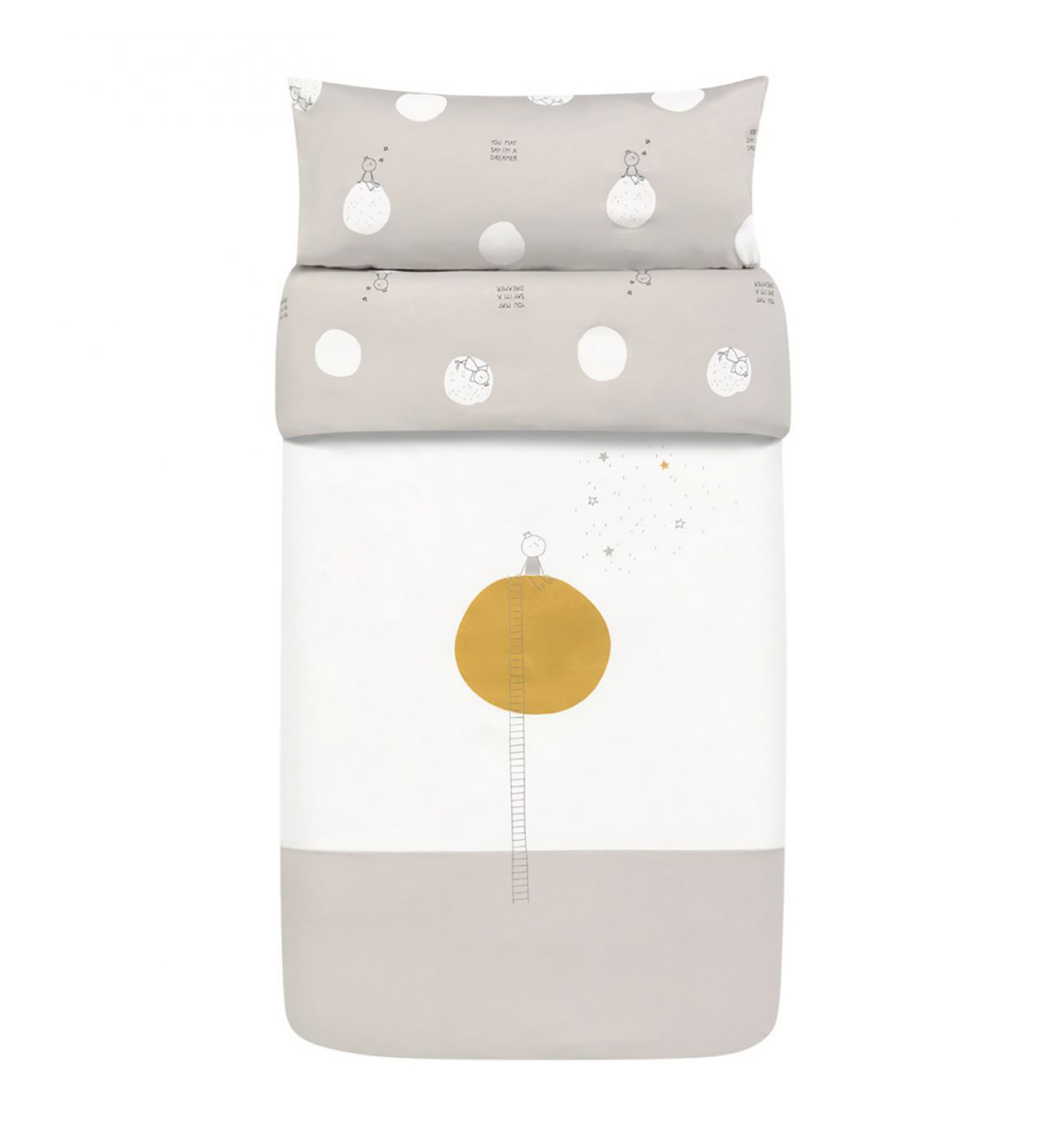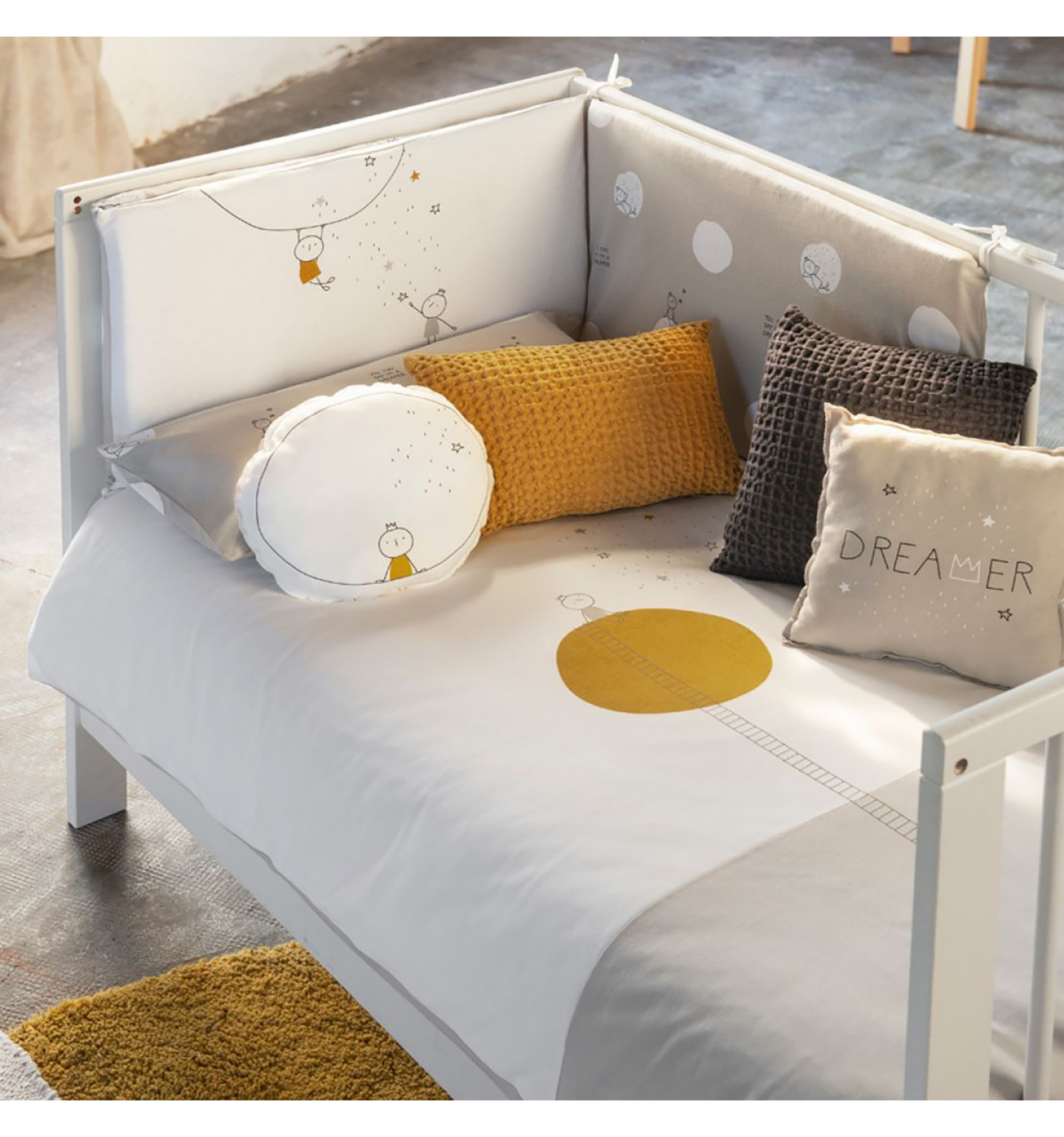 Pack de funda nòrdica reversible, farciment nòrdic, funda de coixí, protector de barrots i baixera ajustable de Babyclic. Teixit de punt de cotó 100% amb tractament especial anti-píling. Amb estampat Dreamer Gris. Per a bressol de 70x140 cm.