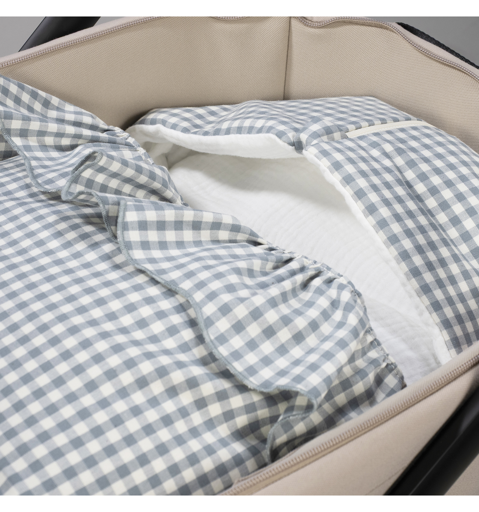 El està dissenyat per oferir confort, frescor i suavitat des dels primers dies del nadó. El seu delicat estampat vichy en to matxa aporta un estil natural, serè i atemporal.
