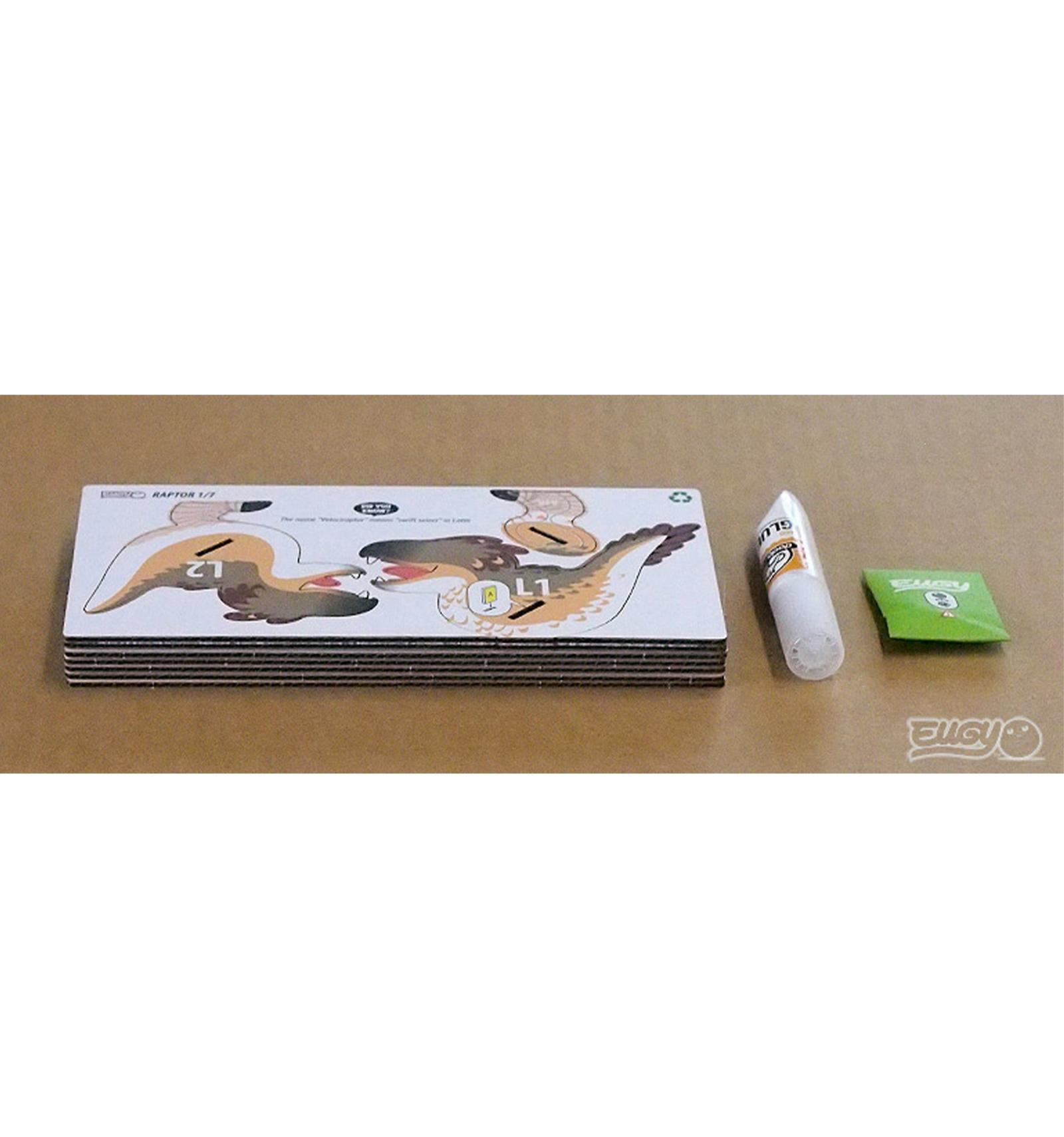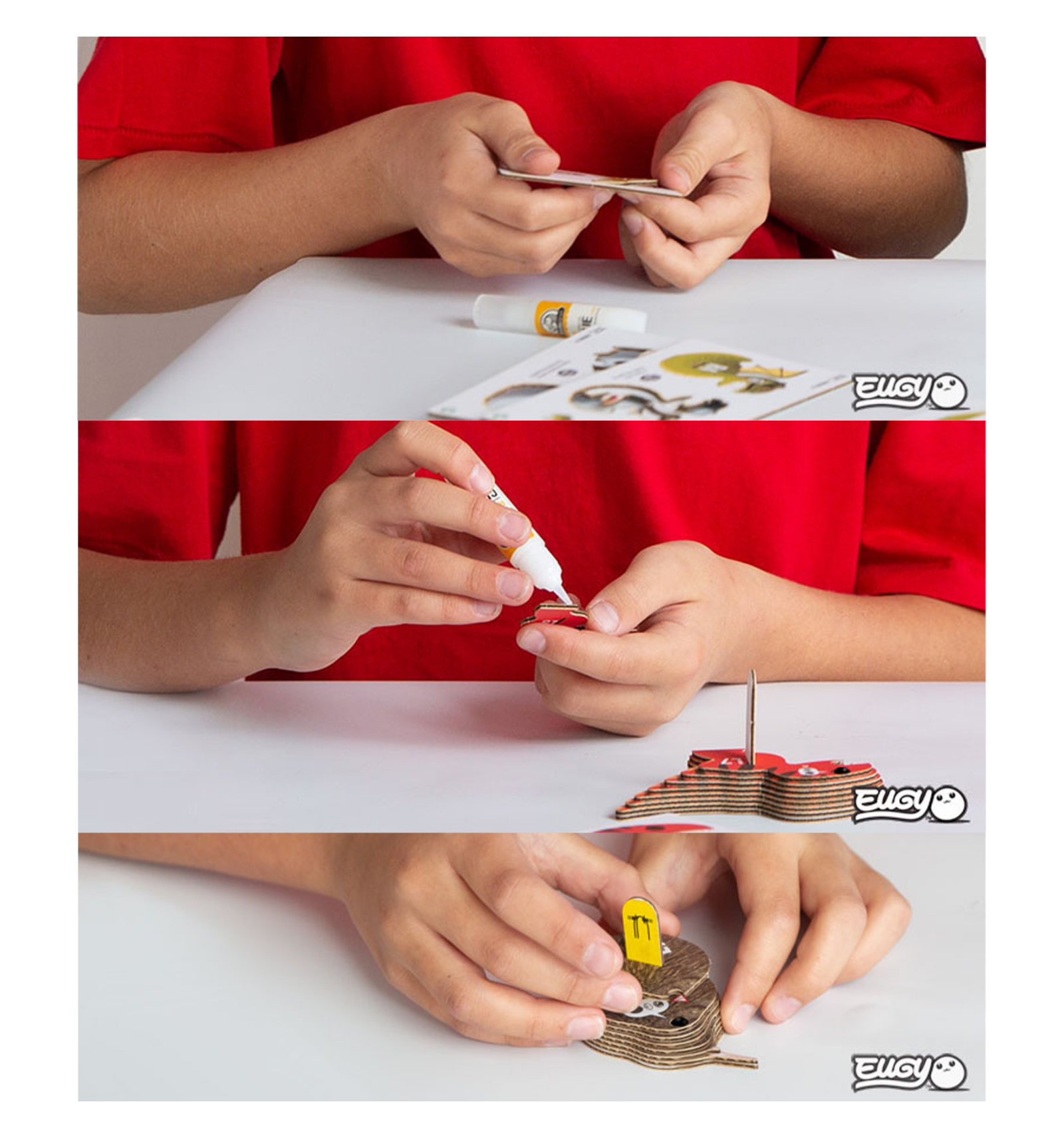 Està fet de material reciclat, tant el cartó com la tinta ecològica, que és no tòxica i a base d'arròs. A més, no ve embolicat en plàstic. I la cola, que ve inclosa, és orgànica i no tòxica.