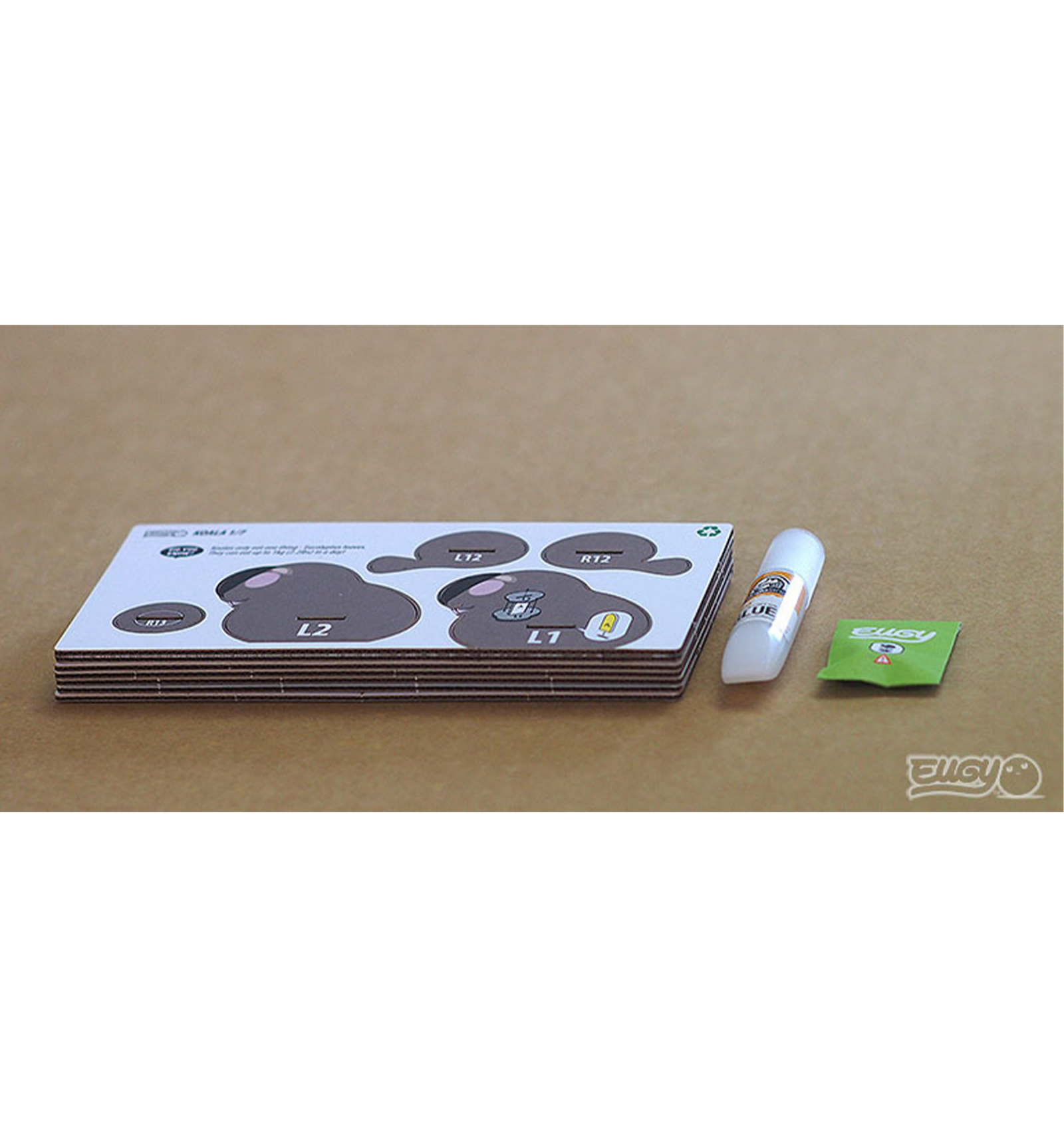 Està fet de material reciclat, tant el cartó com la tinta ecològica, que és no tòxica i a base d'arròs. A més, no ve embolicat en plàstic. I la cola, que ve inclosa, és orgànica i no tòxica.