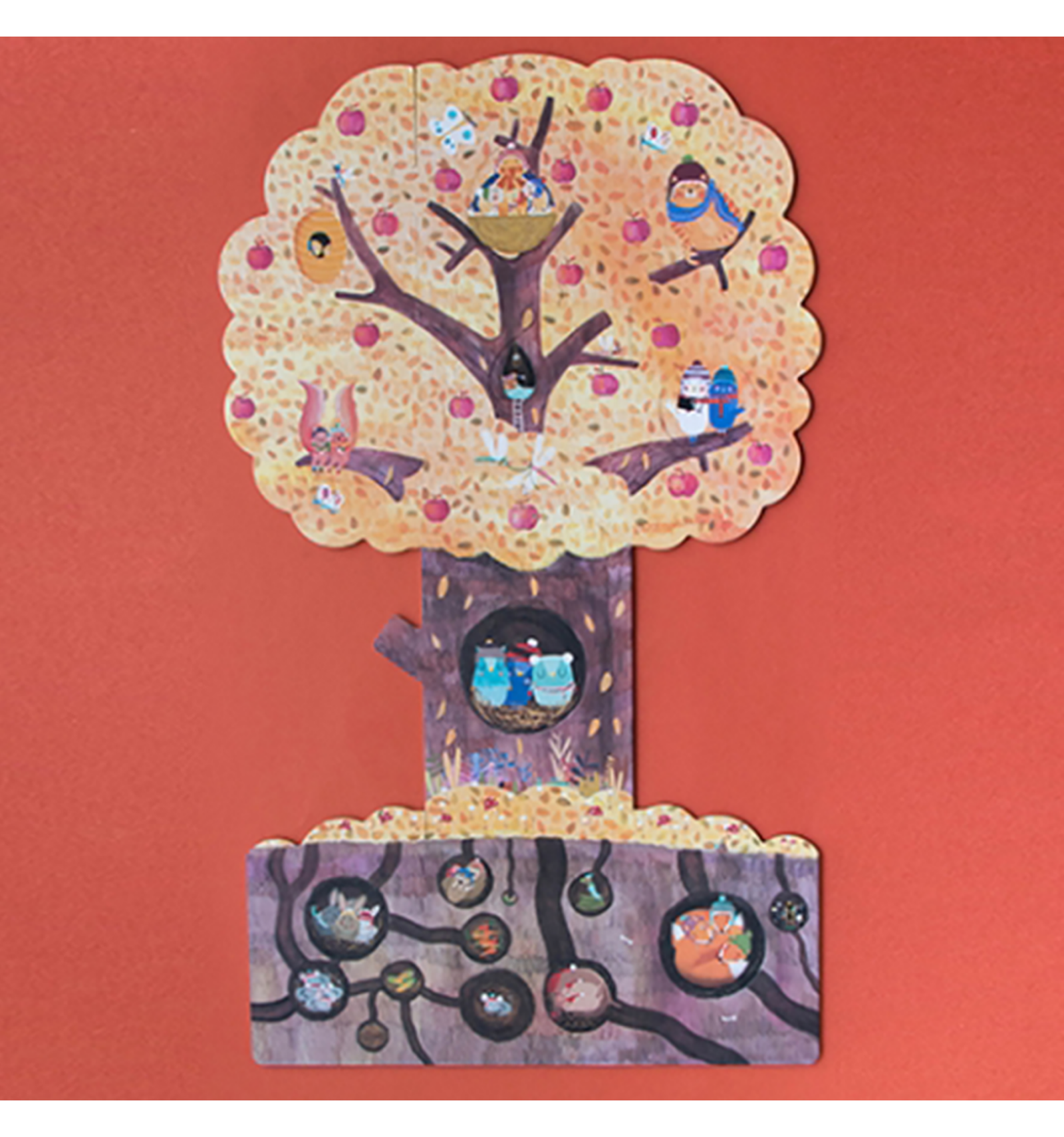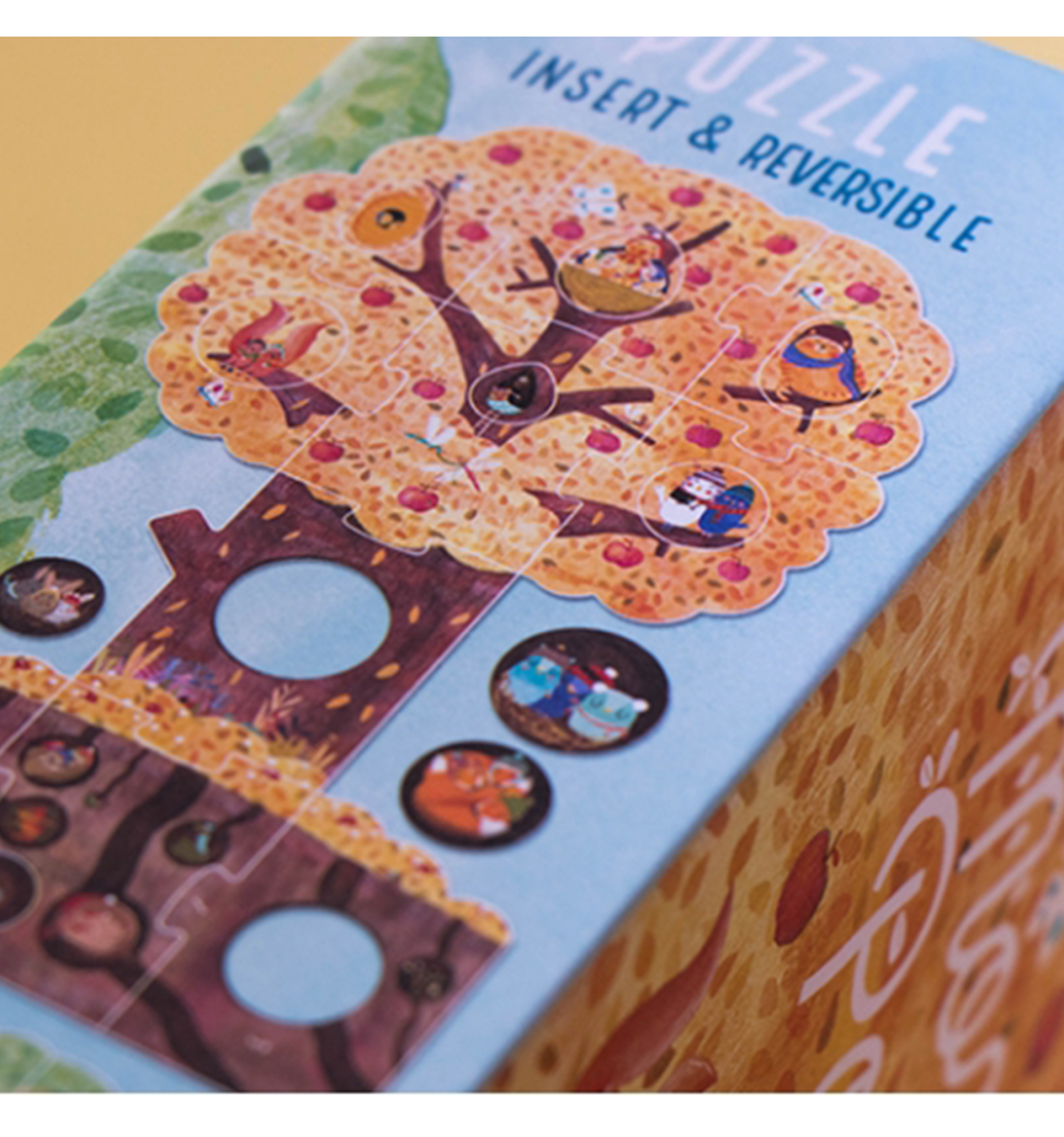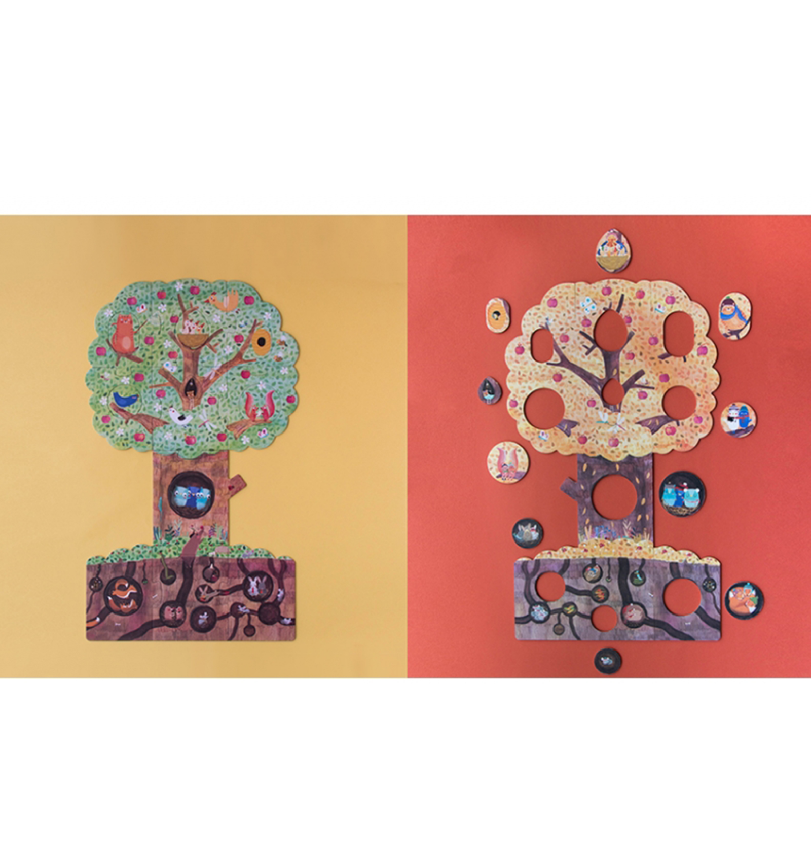 Preciós puzle reversible. En una veiem la vida en l'arbre durant la primavera i en l'altra a la tardor. Les peces són grans i podem jugar a veure com es comporten de diferent els animals segons l'estació de l'any.