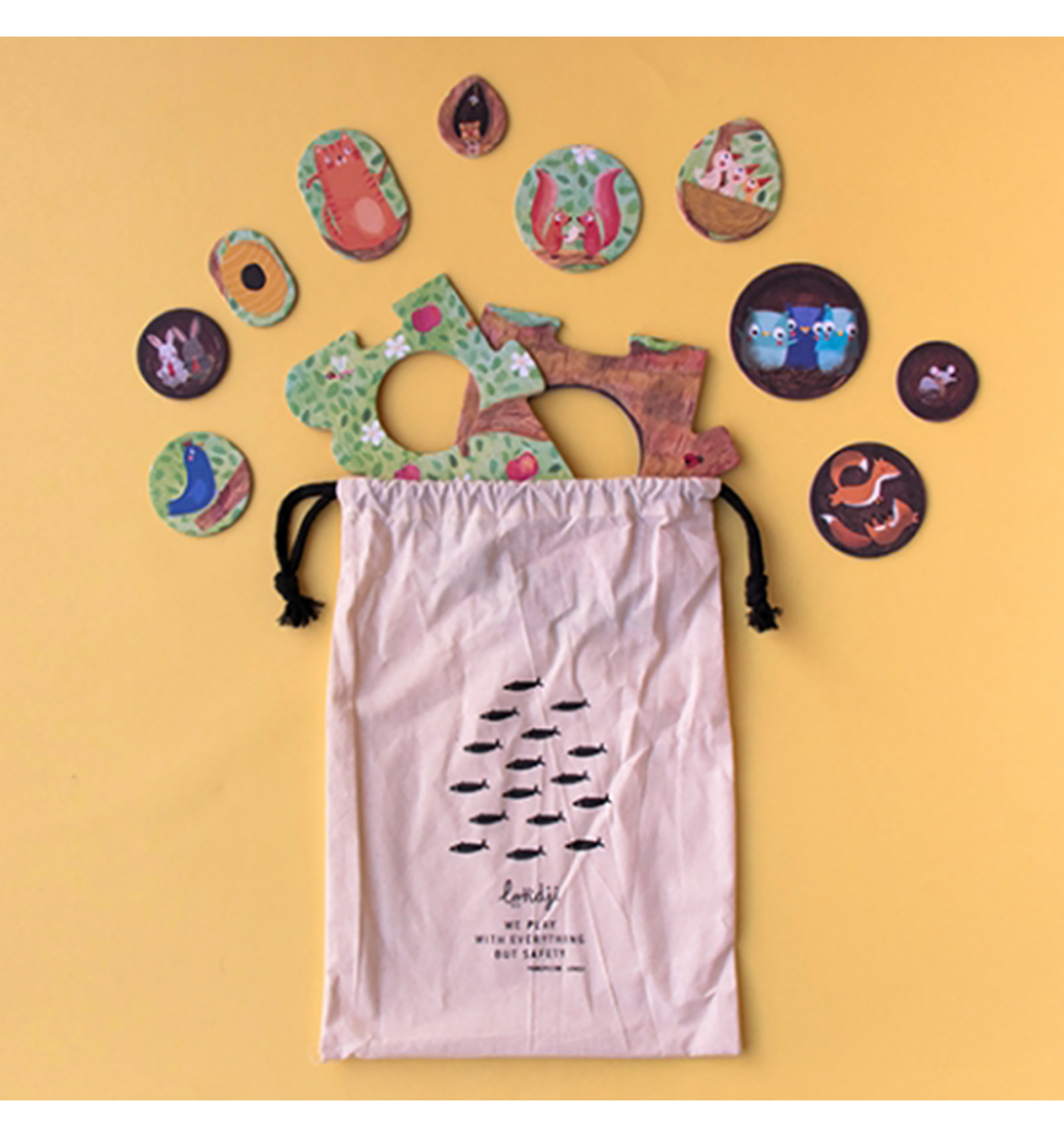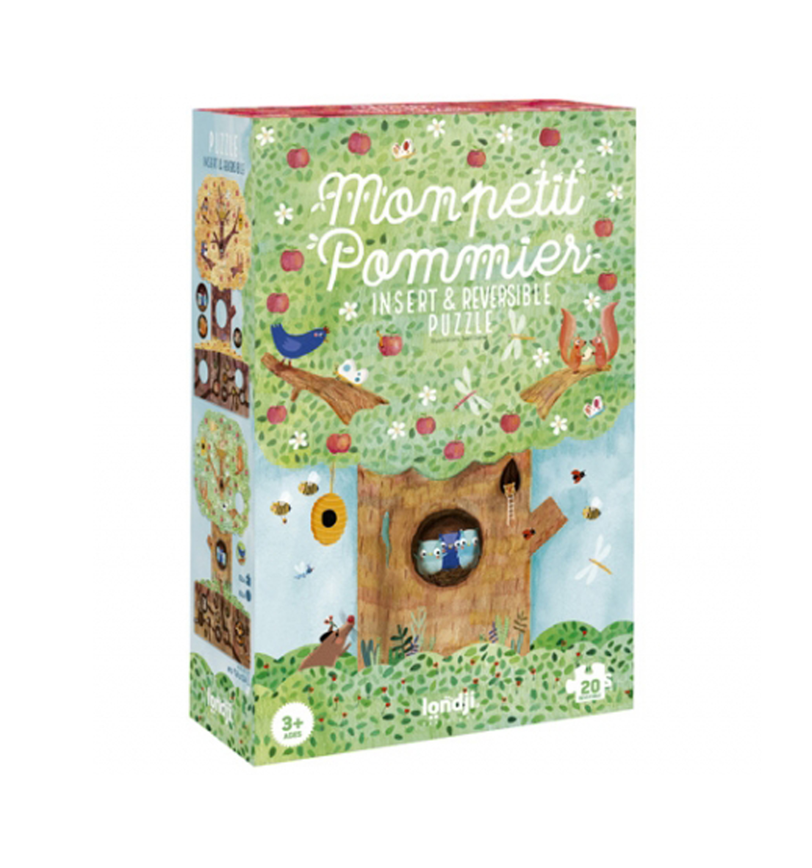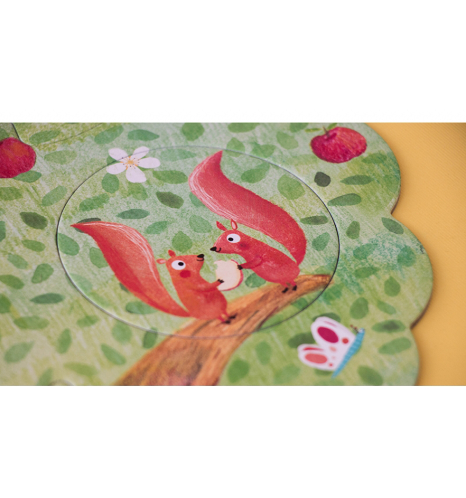 Preciós puzle reversible. En una veiem la vida en l'arbre durant la primavera i en l'altra a la tardor. Les peces són grans i podem jugar a veure com es comporten de diferent els animals segons l'estació de l'any.