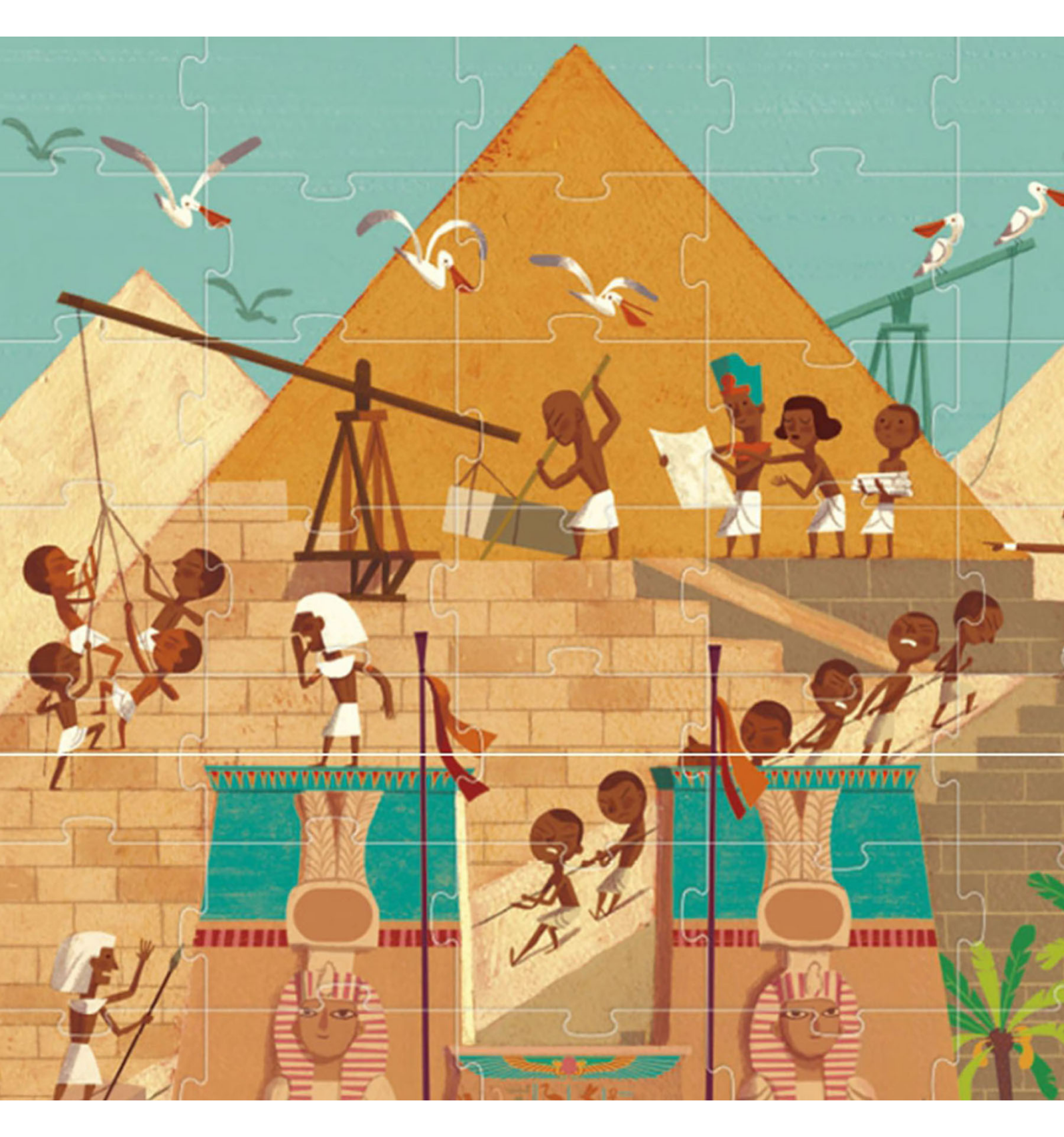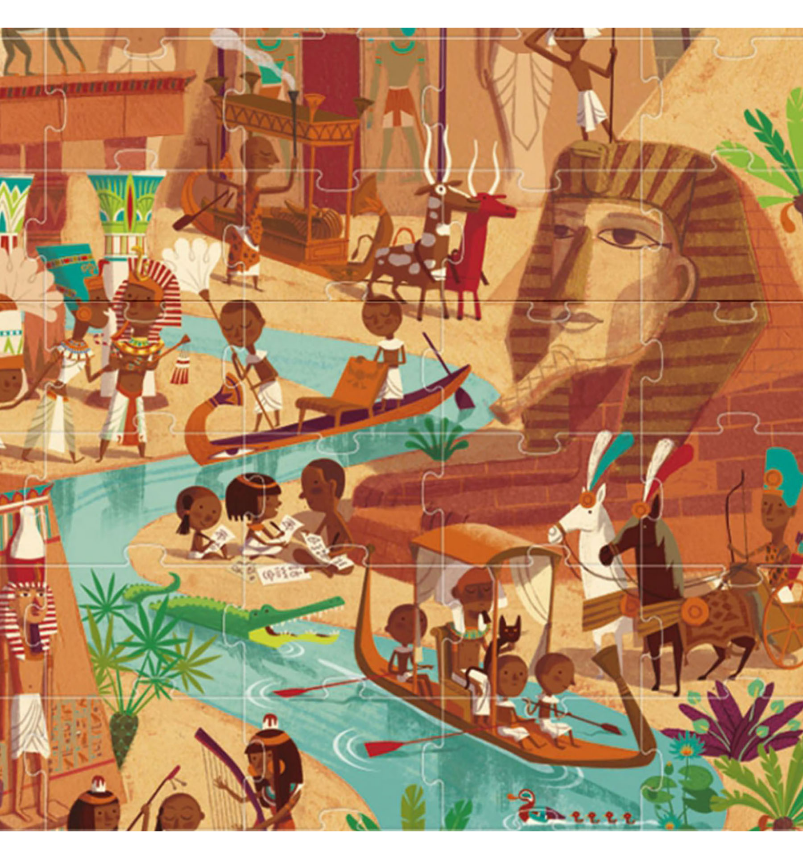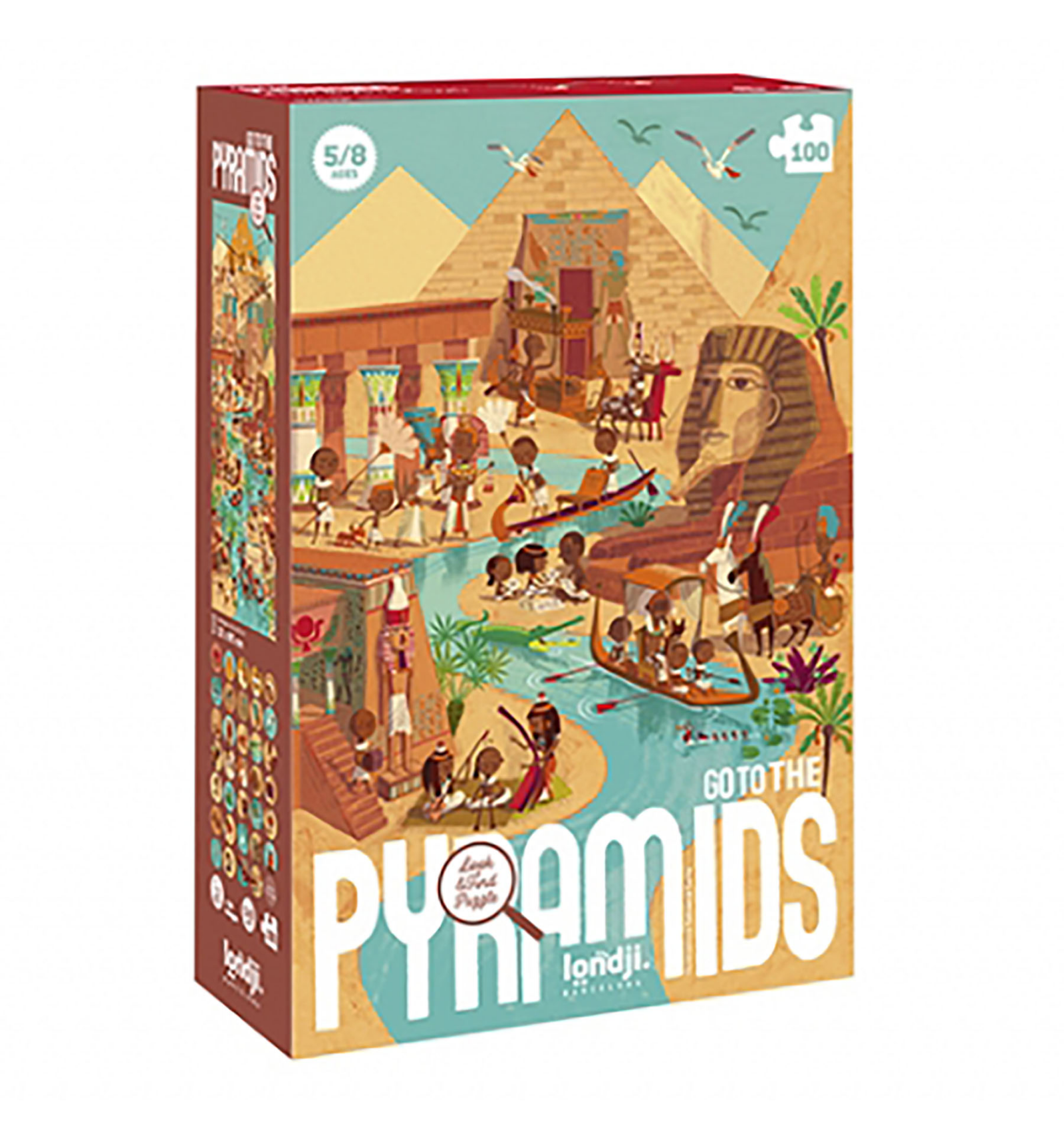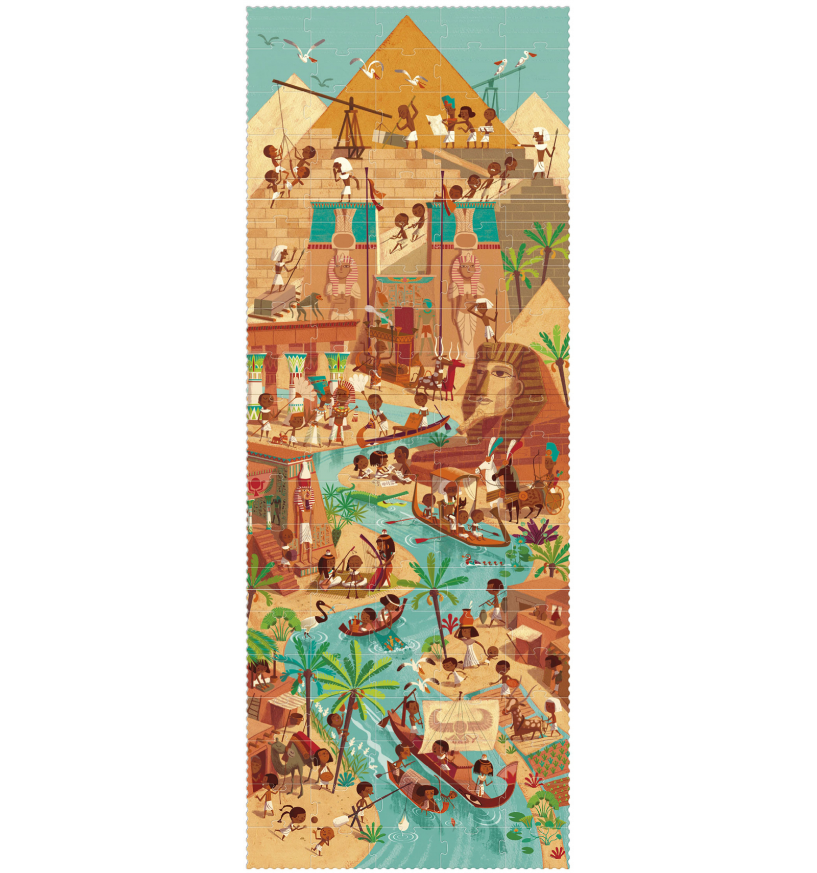 Anem de viatge a visitar les piràmides! Voleu viatjar al temps dels faraons? Munteu aquest puzle de 100 peces i viatgeu pel riu Nil i descobrireu les meravelles de l'antic Egipte. Un puzle per a muntar i descobrir. Mides: 85 x 32 cm. De 5 a 8 anys.