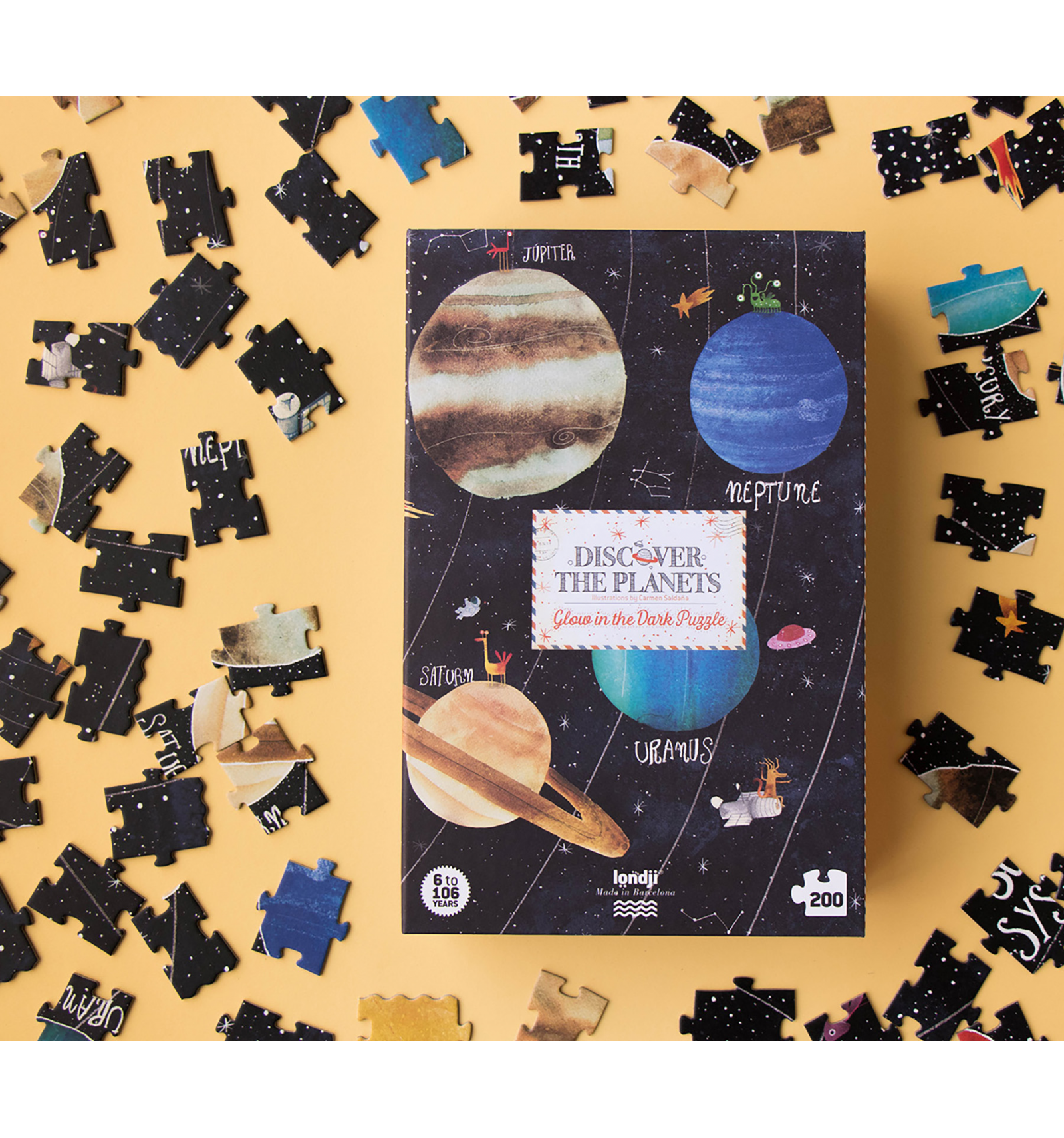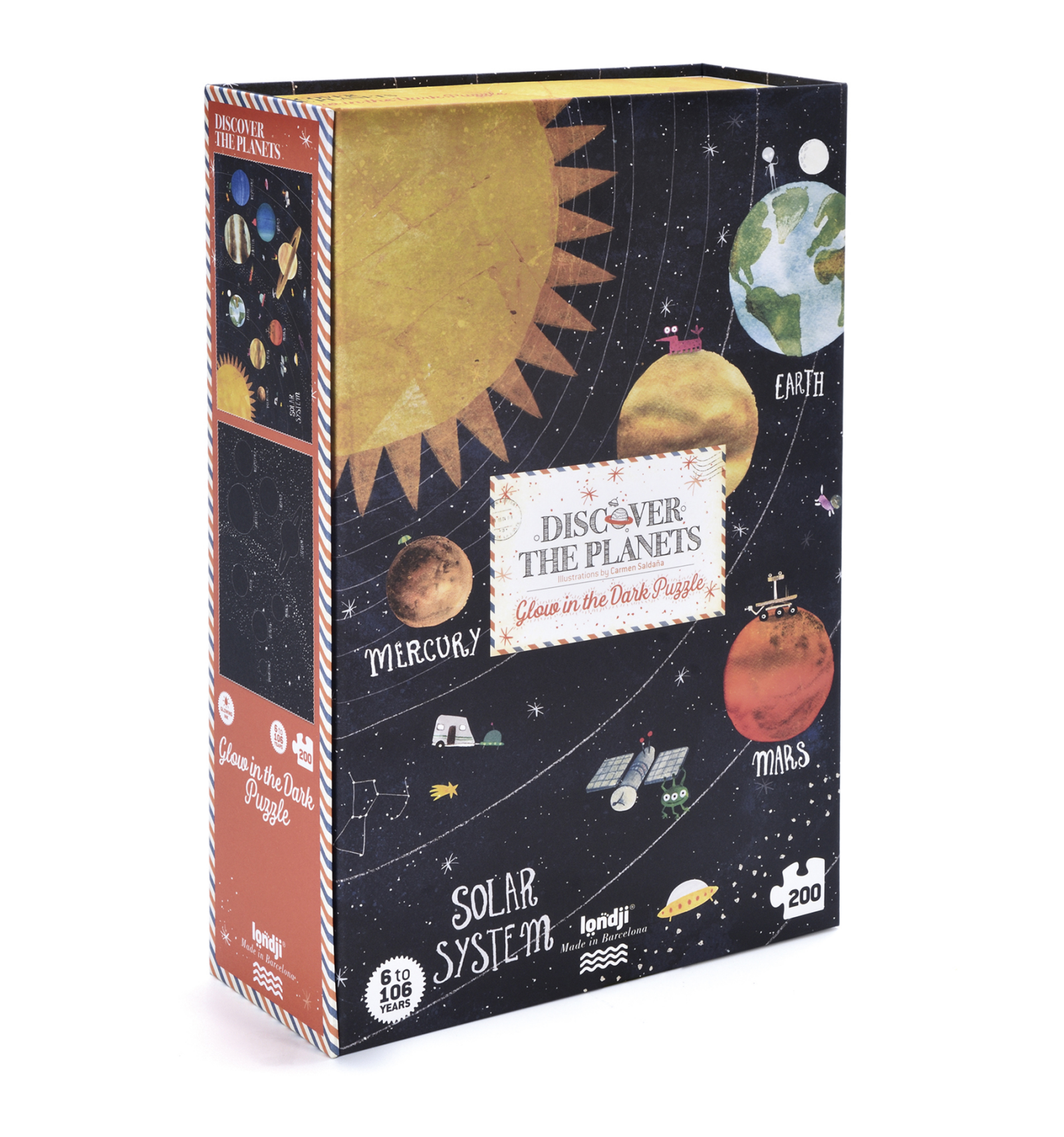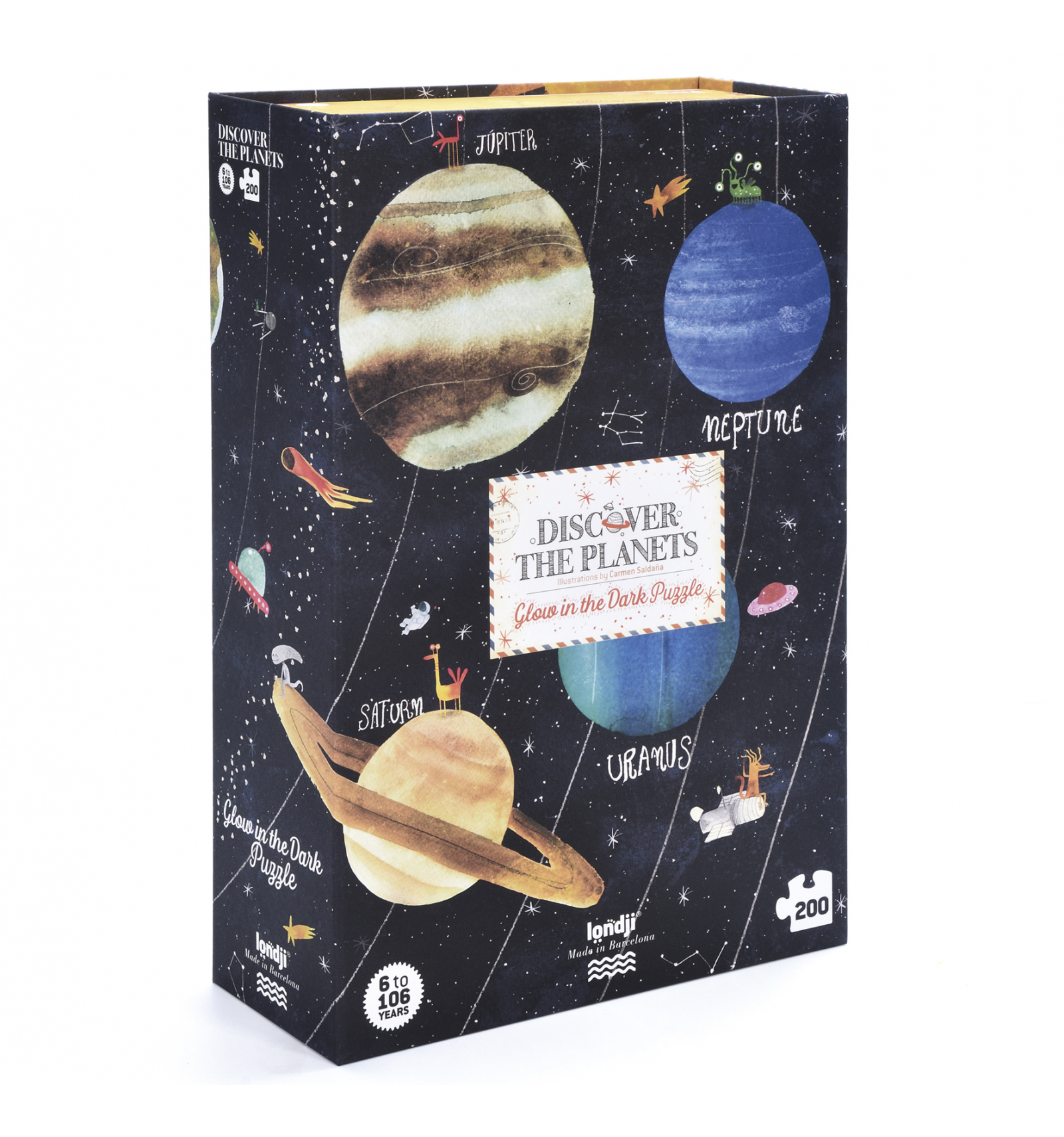 Viatja pel sistema solar amb aquest puzle de Londji. De Júpiter a Mart, d'Urà a Saturn, de la Terra a Venus,... Un puzle de 200 peces amb una sorpresa... una vegada muntat brilla en la foscor!