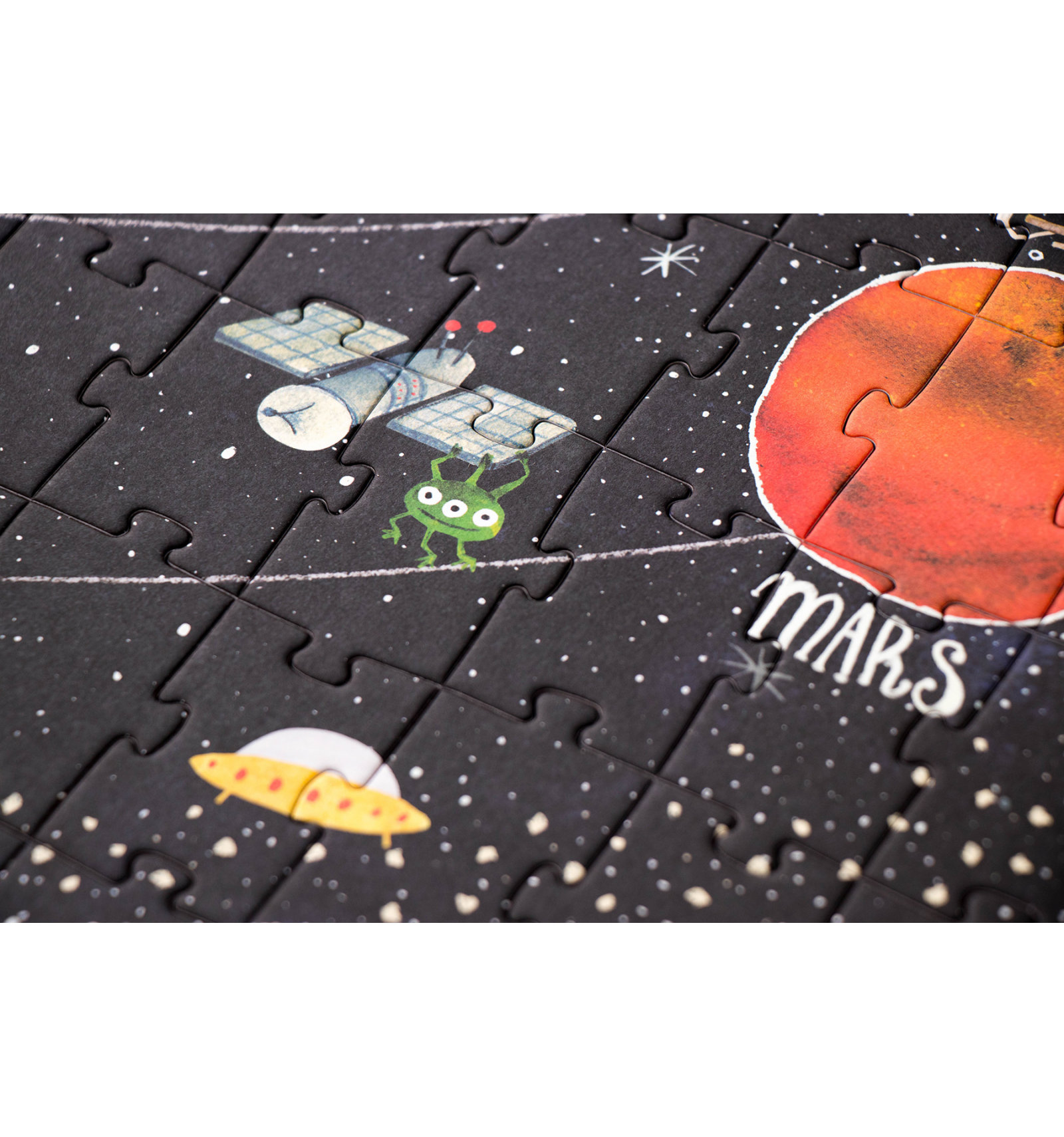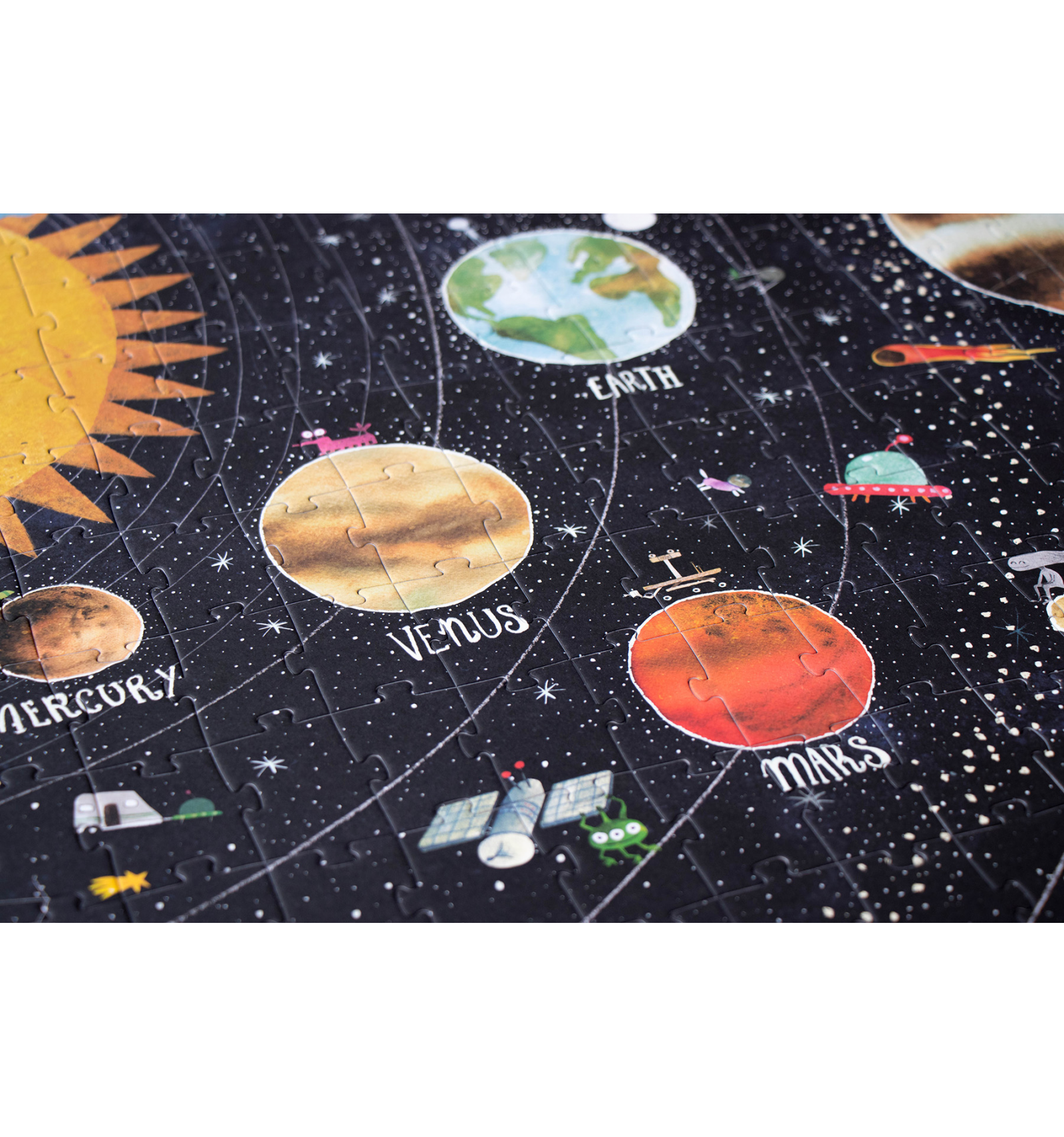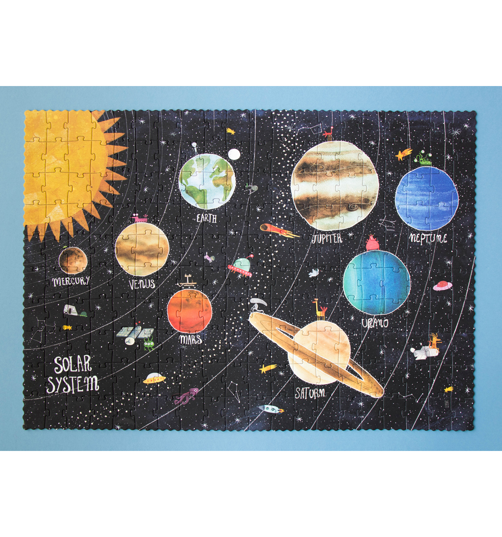 Viatja pel sistema solar amb aquest puzle de Londji. De Júpiter a Mart, d'Urà a Saturn, de la Terra a Venus,... Un puzle de 200 peces amb una sorpresa... una vegada muntat brilla en la foscor!