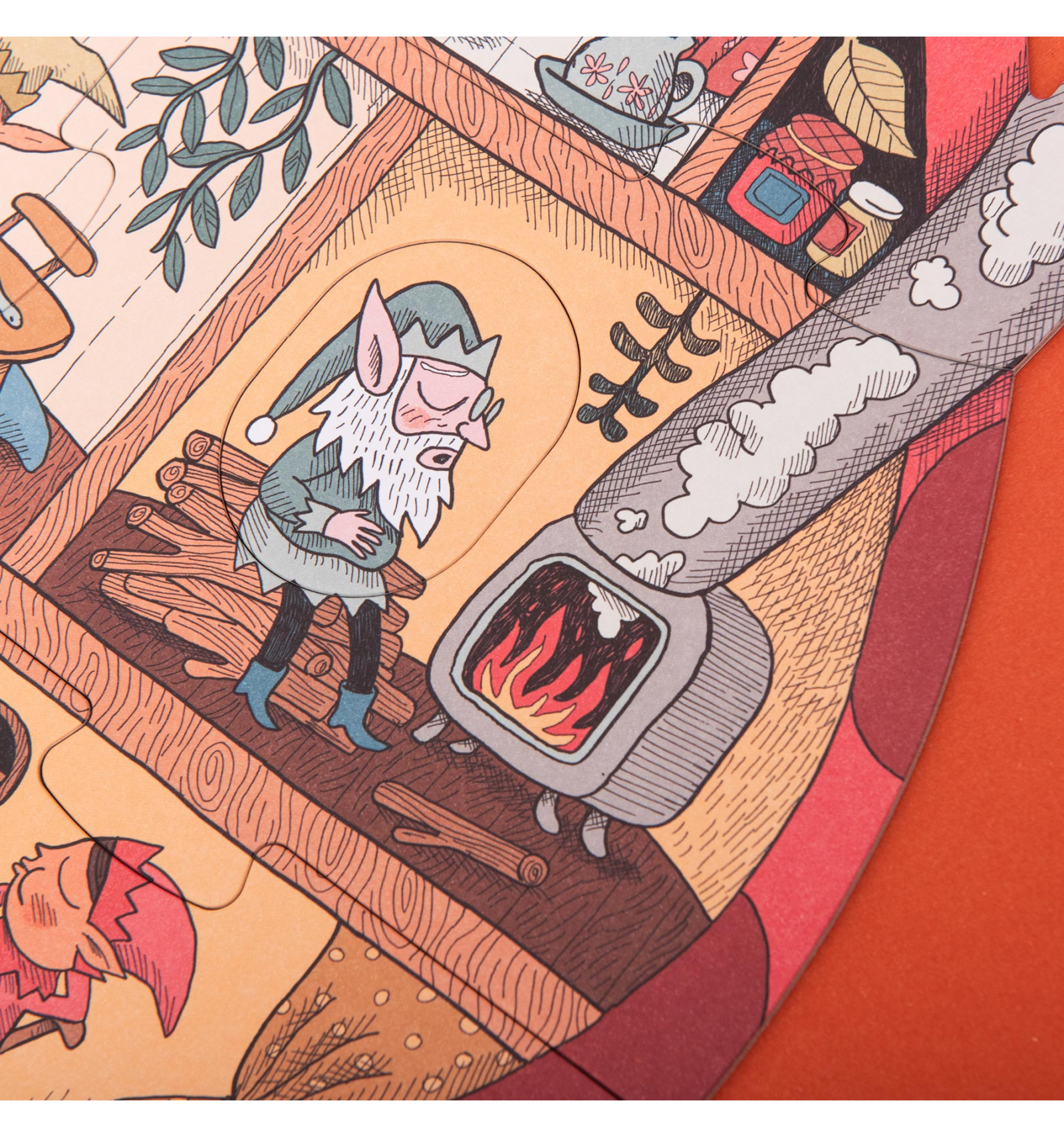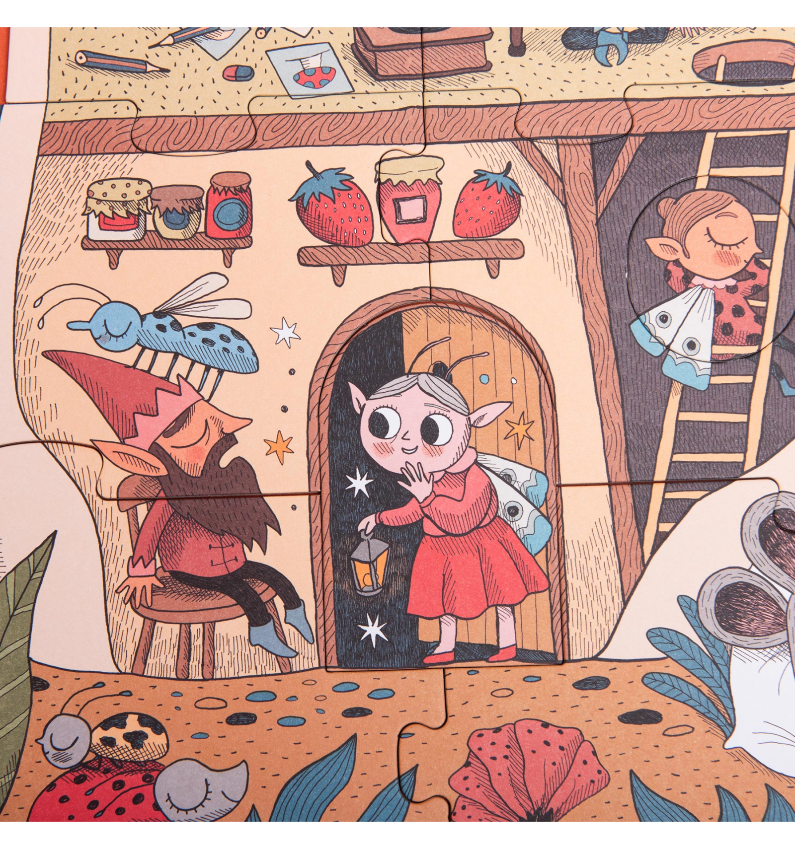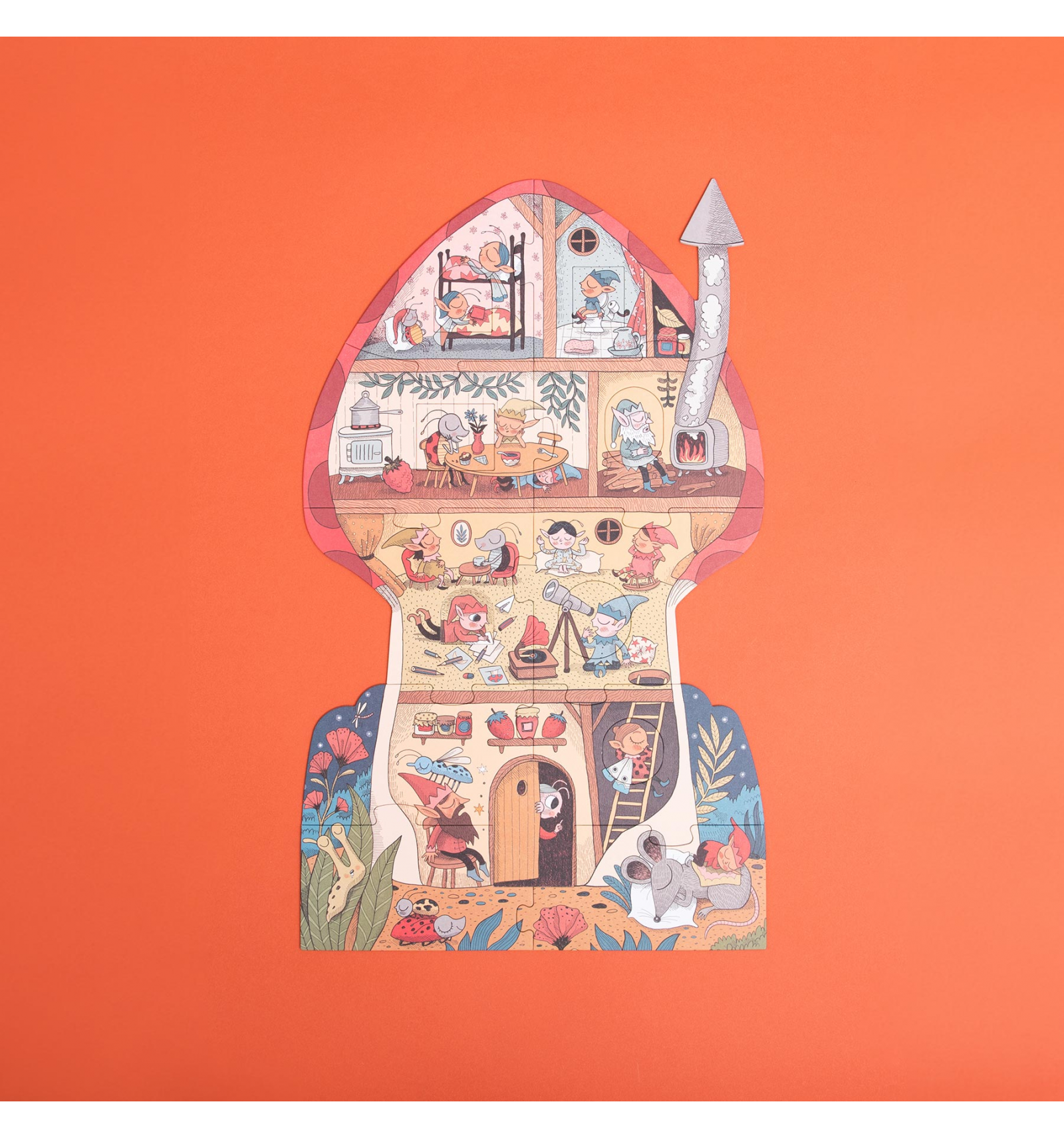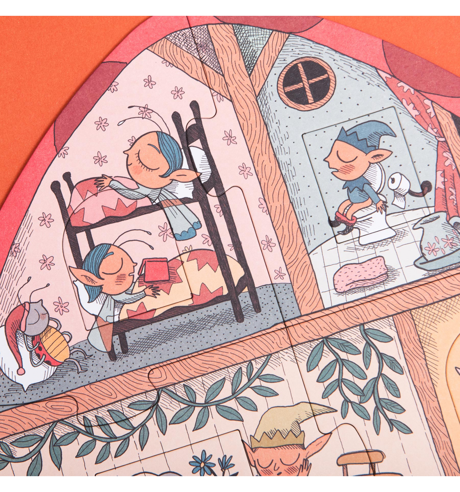 Un puzle per a treballar l'hàbit d'anar a dormir. D'una banda veiem tota l'activitat que hi ha en la caseta-bolet però quan li donem la volta veiem com tots van a dormir plàcidament.