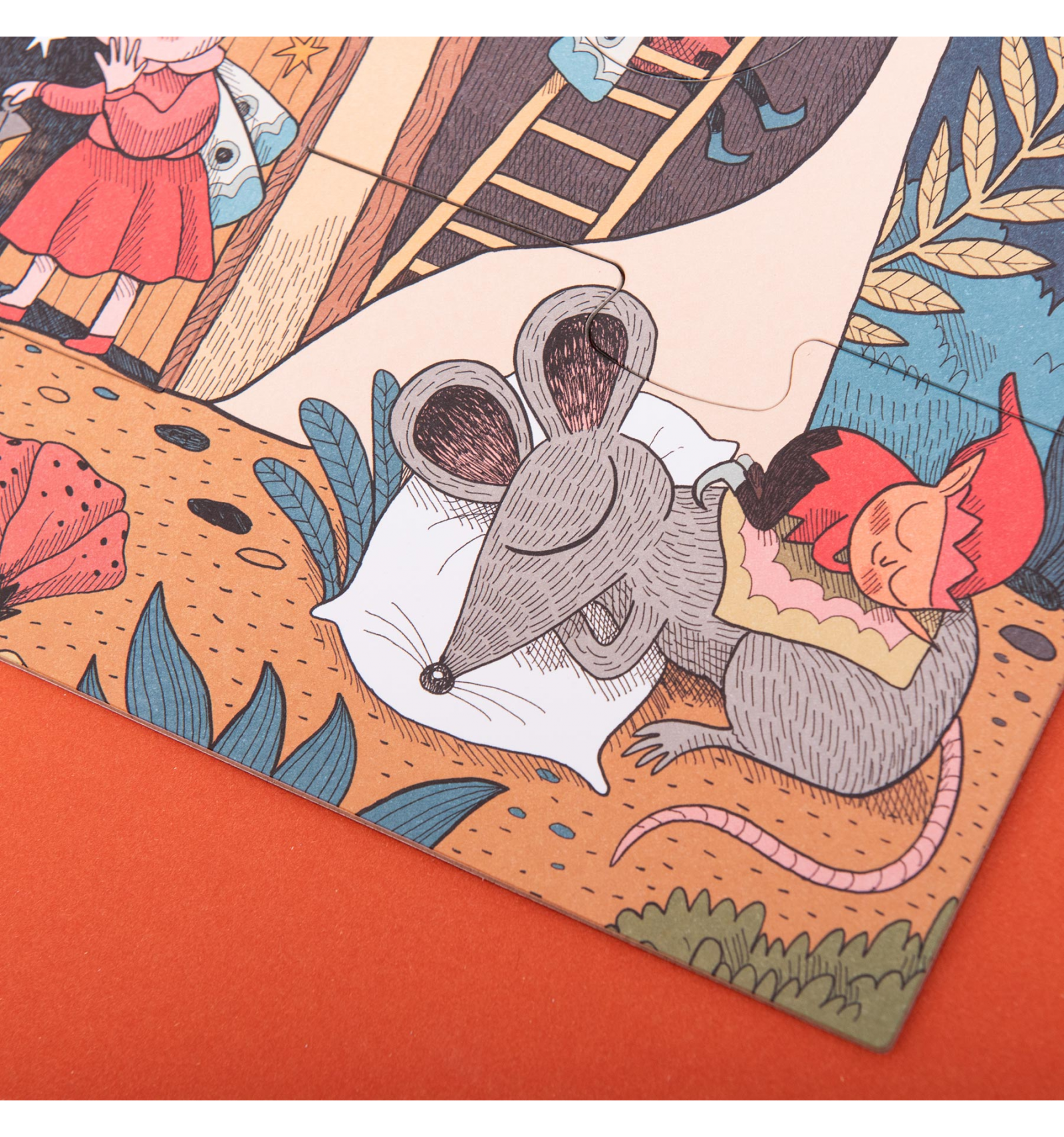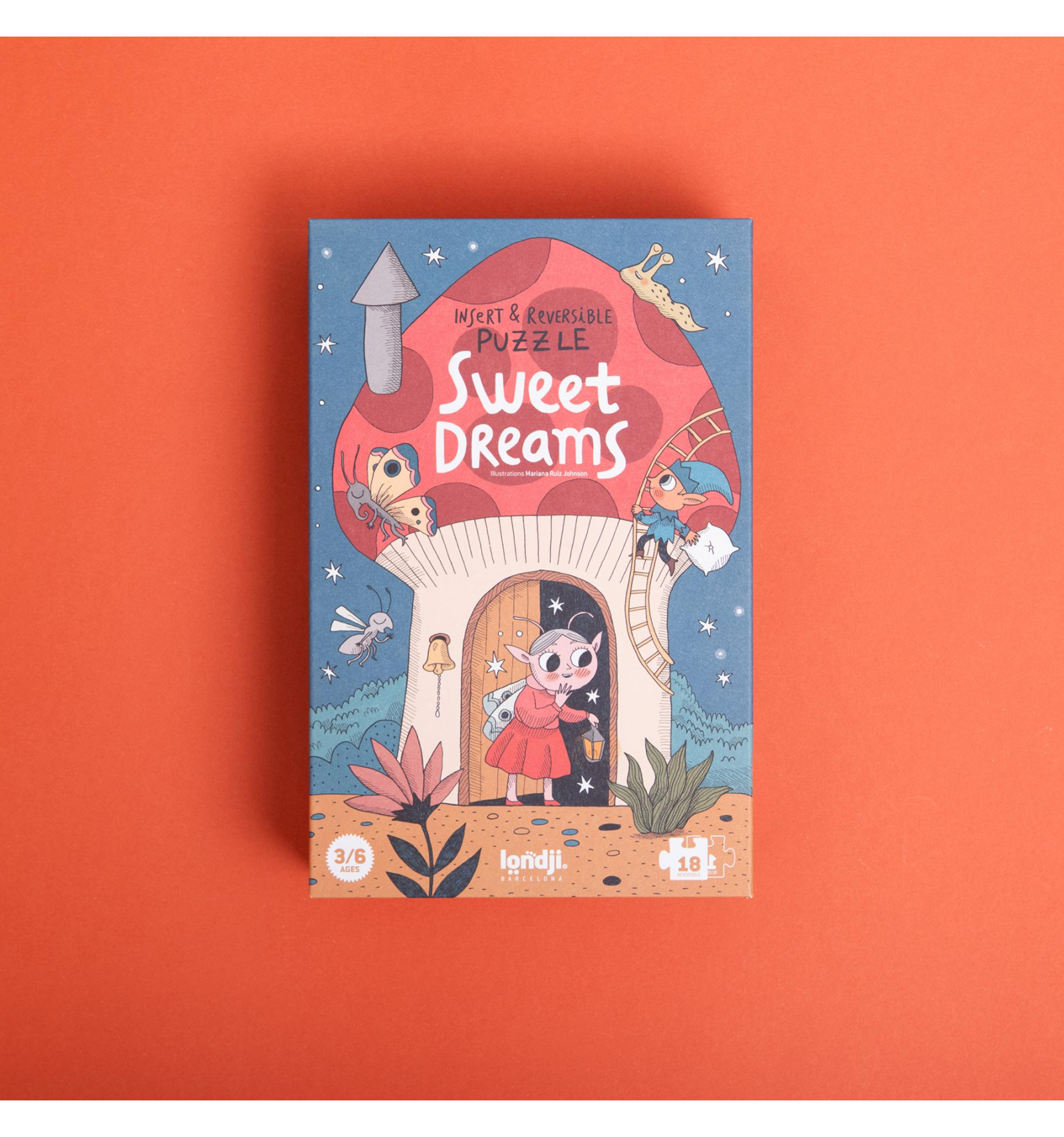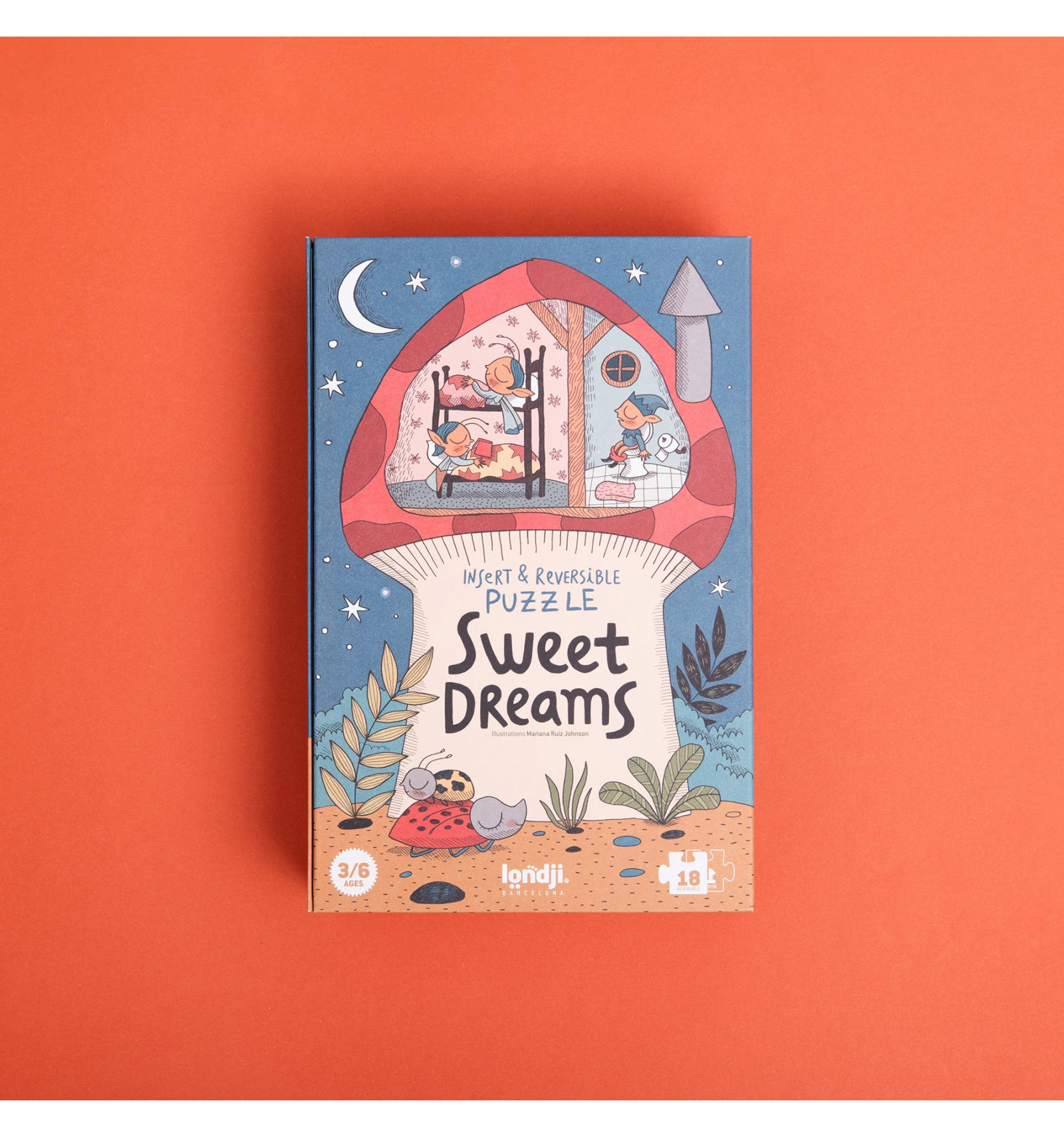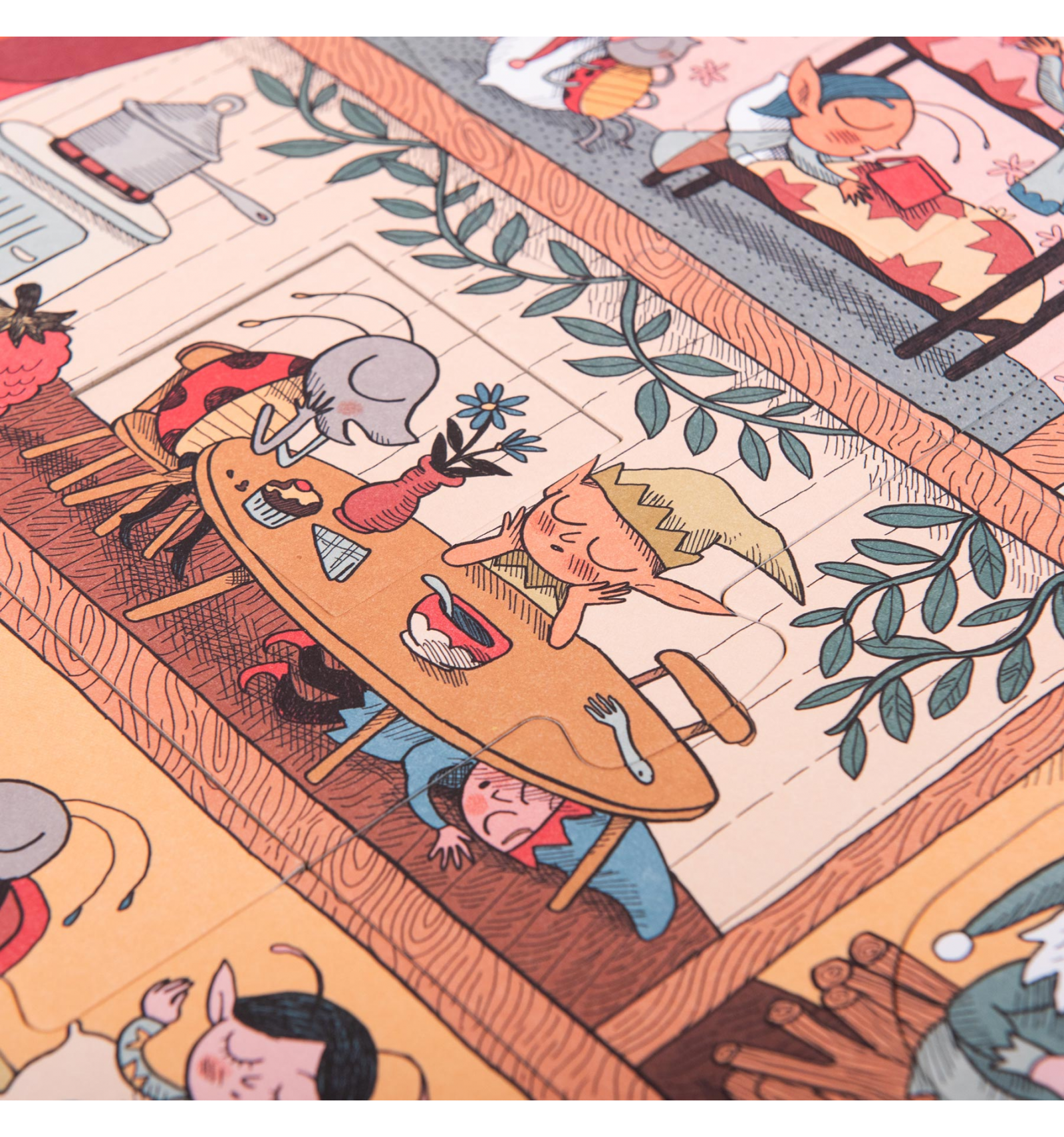 Un puzle per a treballar l'hàbit d'anar a dormir. D'una banda veiem tota l'activitat que hi ha en la caseta-bolet però quan li donem la volta veiem com tots van a dormir plàcidament.