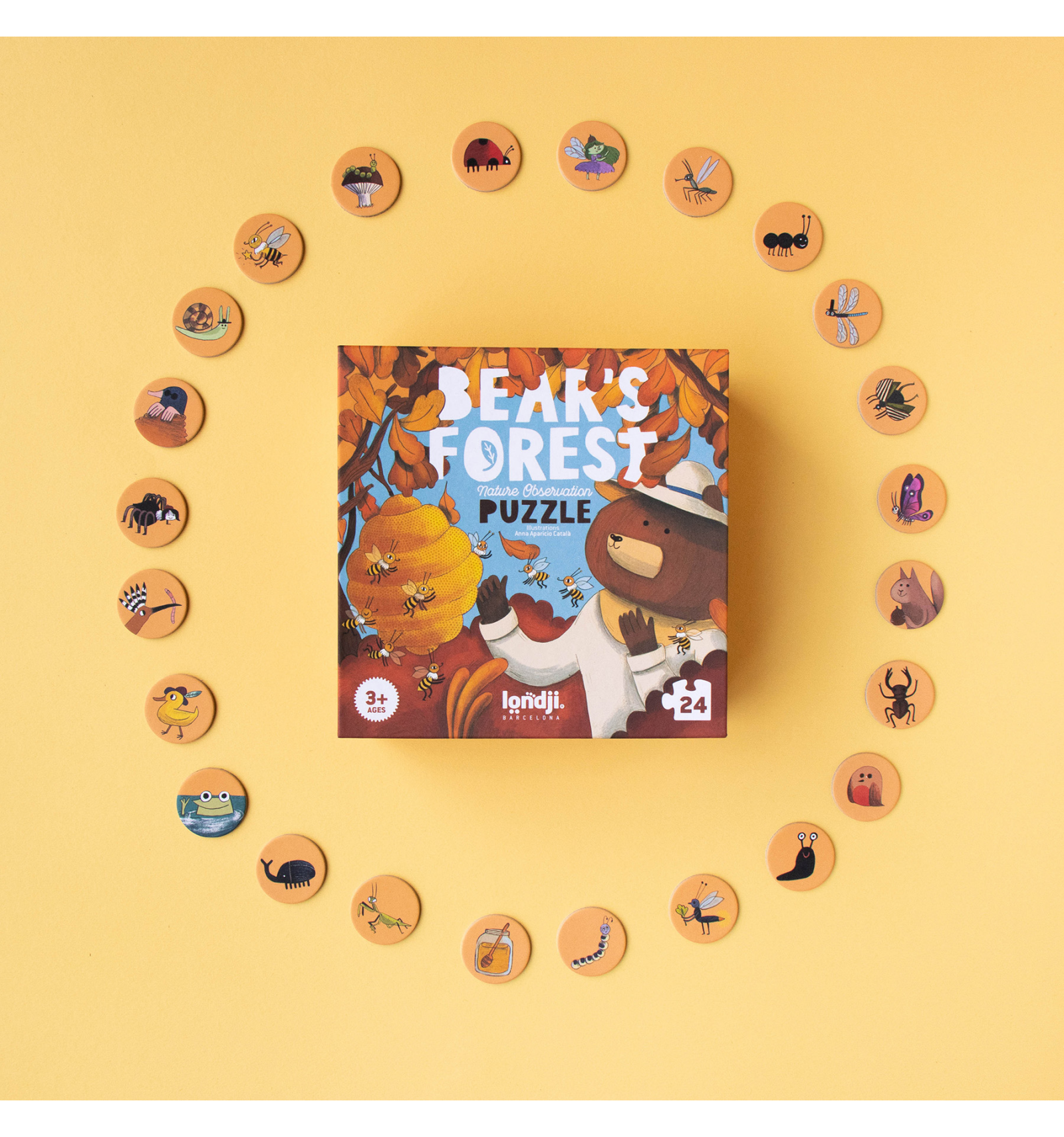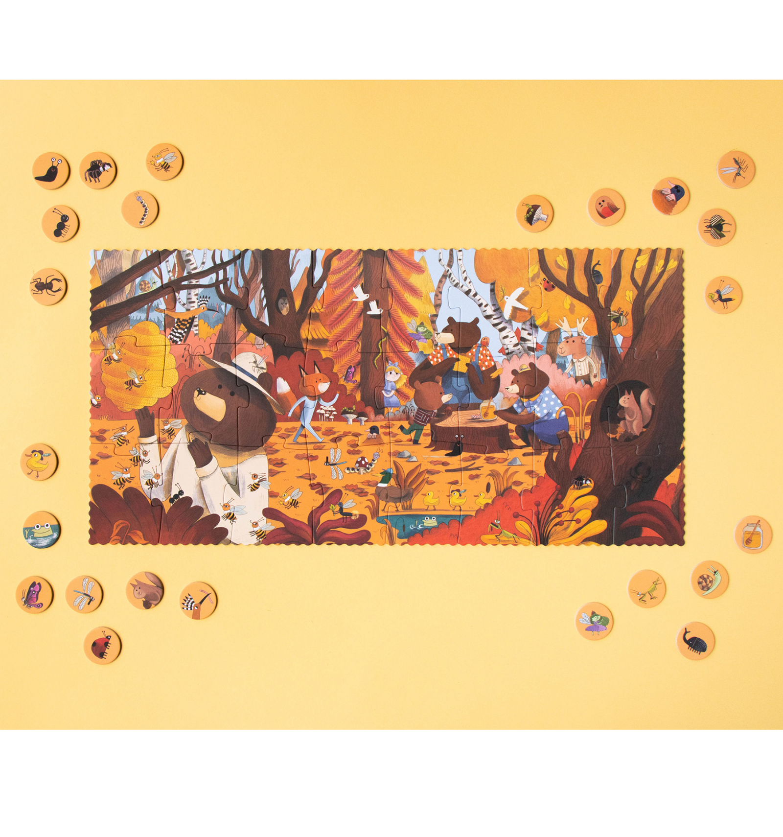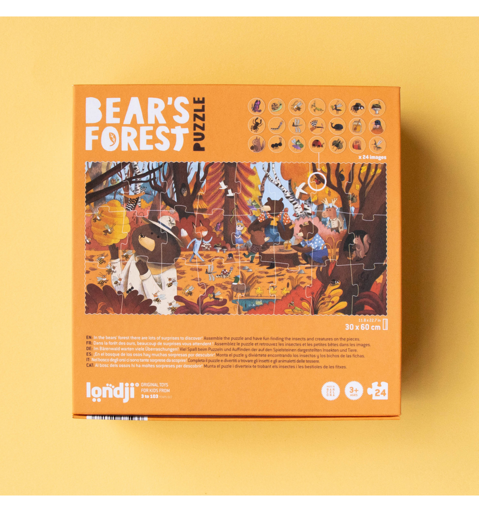 Explora el bosc amb els nostres amics ossos i descobreix les criatures que els acompanyen mentre gaudeixen de la mel. Aquest trencaclosques de 24 peces per a nens petits inclou un divertit joc d'observació per a trobar 24 personatges amagats.