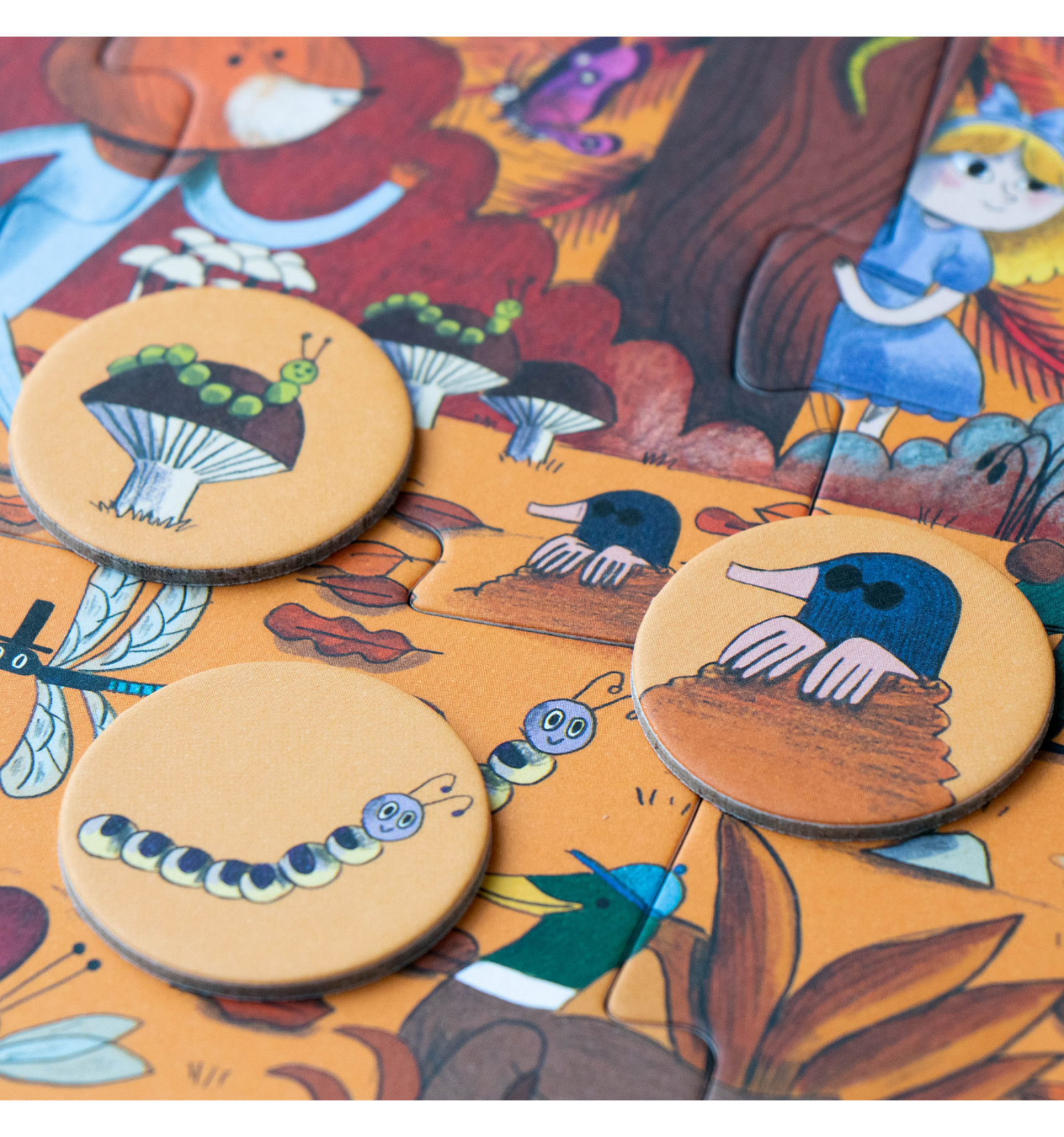 Submergeix-te en un bosc ple de vida amb aquest encantador Puzle d'Observació. Amb 24 peces grans, és ideal perquè els nens petits desenvolupin la seva coordinació i habilitats d'atenció mentre armen el trencaclosques. Una vegada complet, comença l'aventura: observa amb cura i troba els 24 insectes i animals amagats entre els arbres i arbustos!