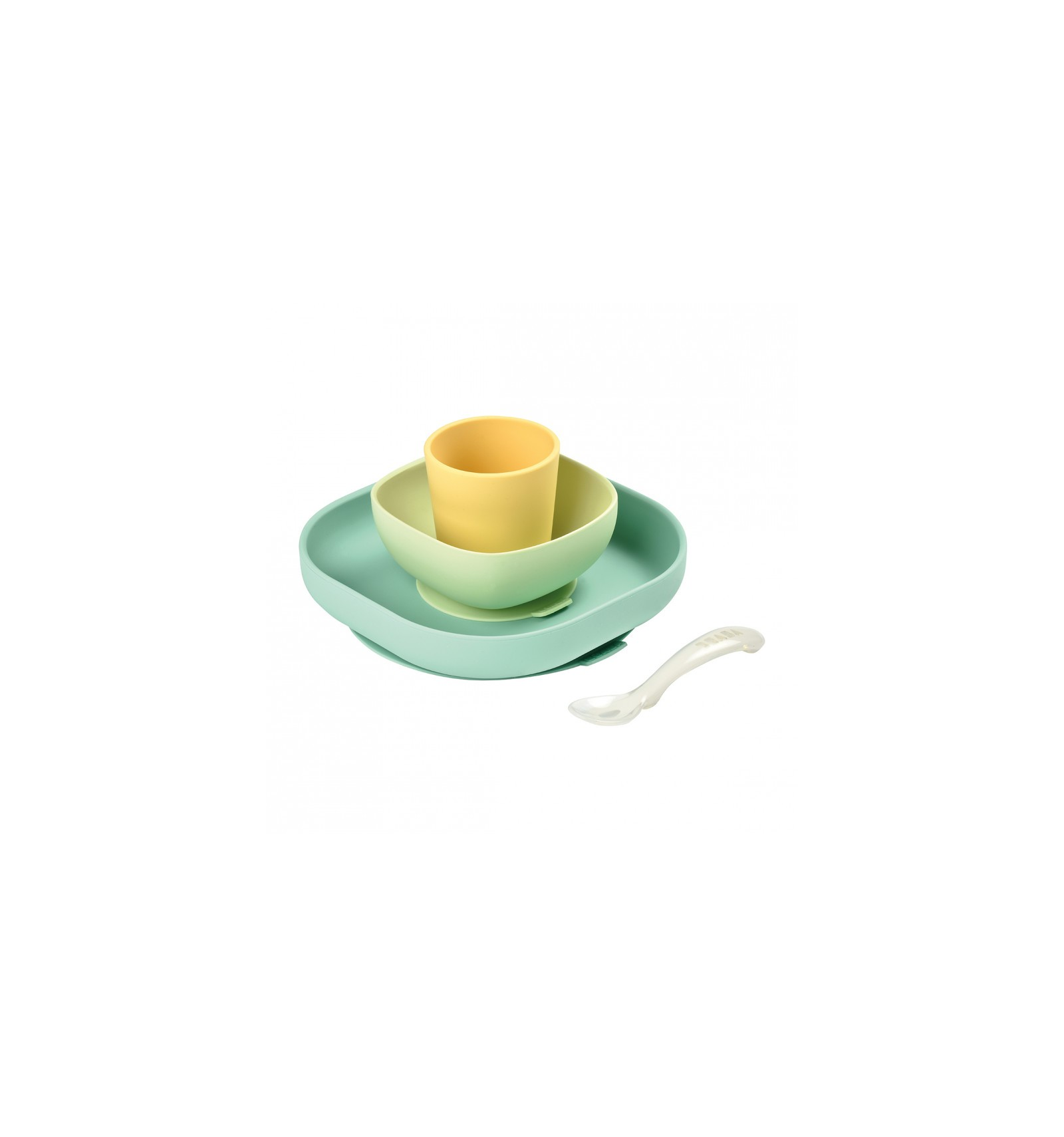 Vaixella infantil de silicona composta per un plat amb ventosa, un bol amb ventosa, un got i una cullera per a fixar els plats en la taula i evitar incidents.