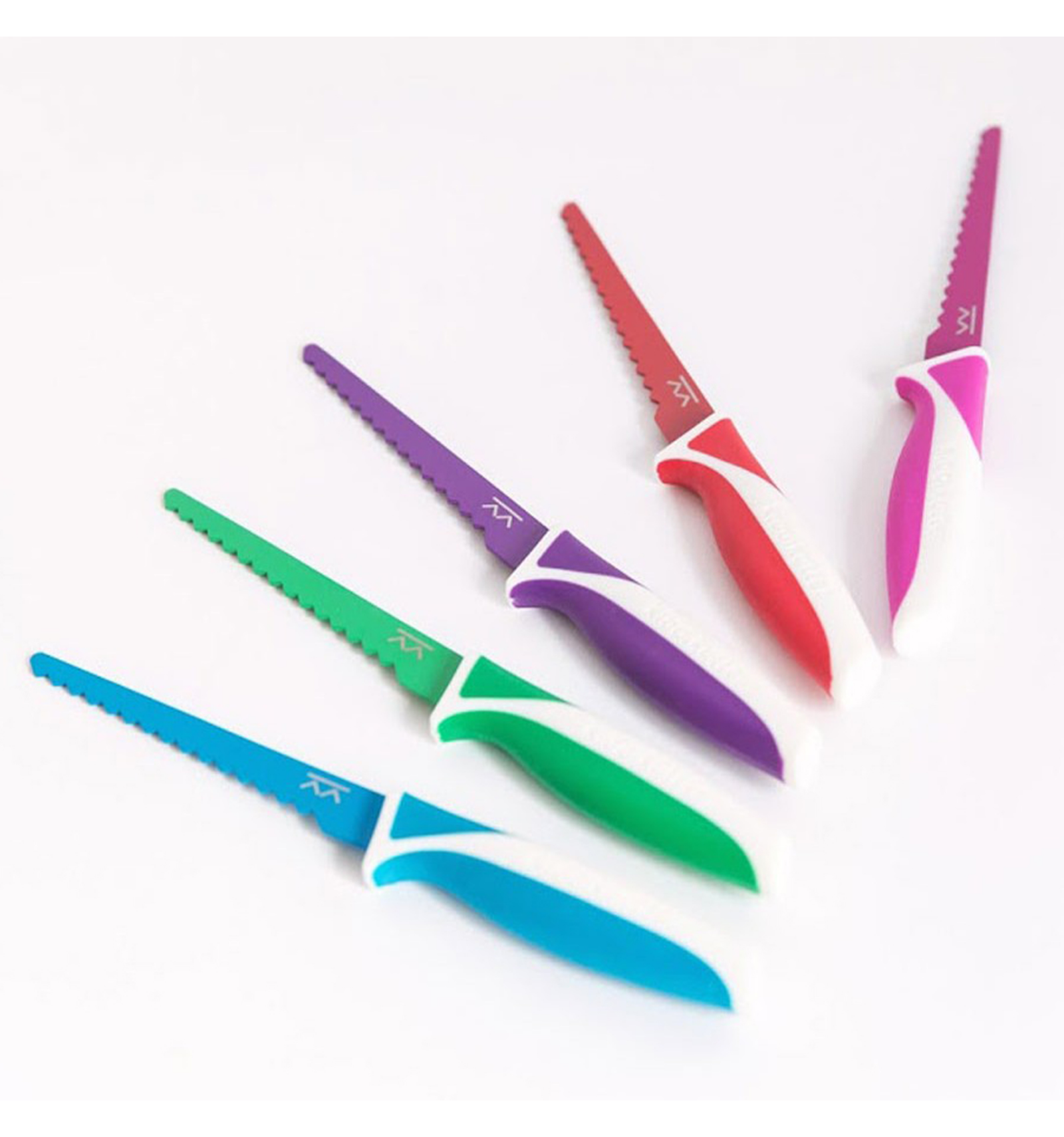 Talla el menjar, no els dits. El ganivet perfecte perquè els nens ajudin a la cuina i aprenguin a tallar el seu menjar, però sense tallar-se ells, la qual cosa motiva la seva independència. De ceràmica i acer inoxidable. Per a destres o esquerrans, és còmode de sostenir fins i tot per un adult. Apte per a rentavaixella. A partir de 3 anys.