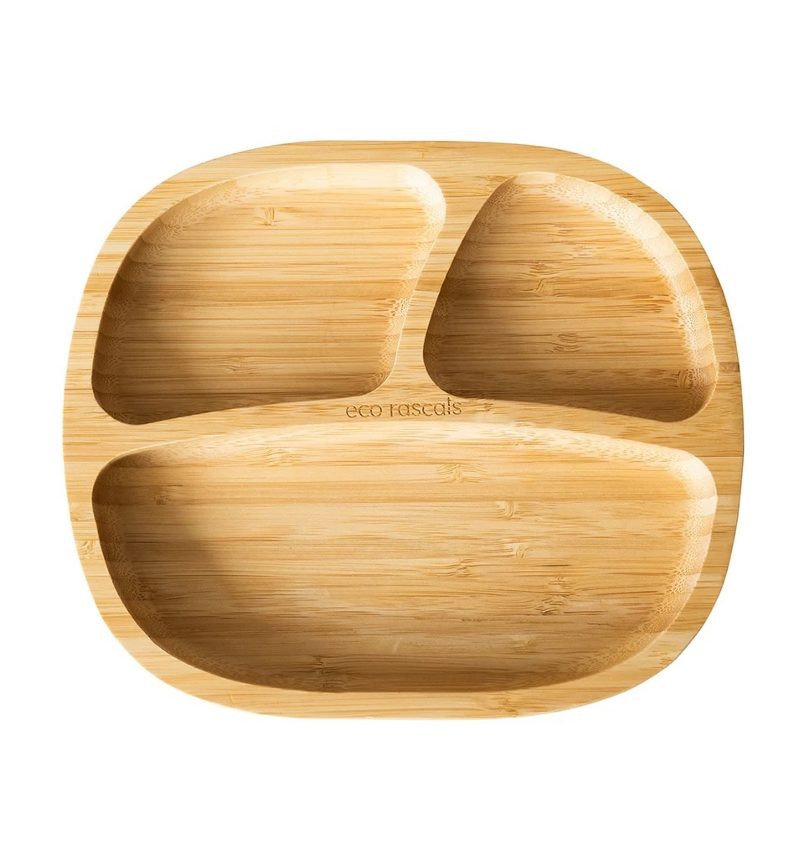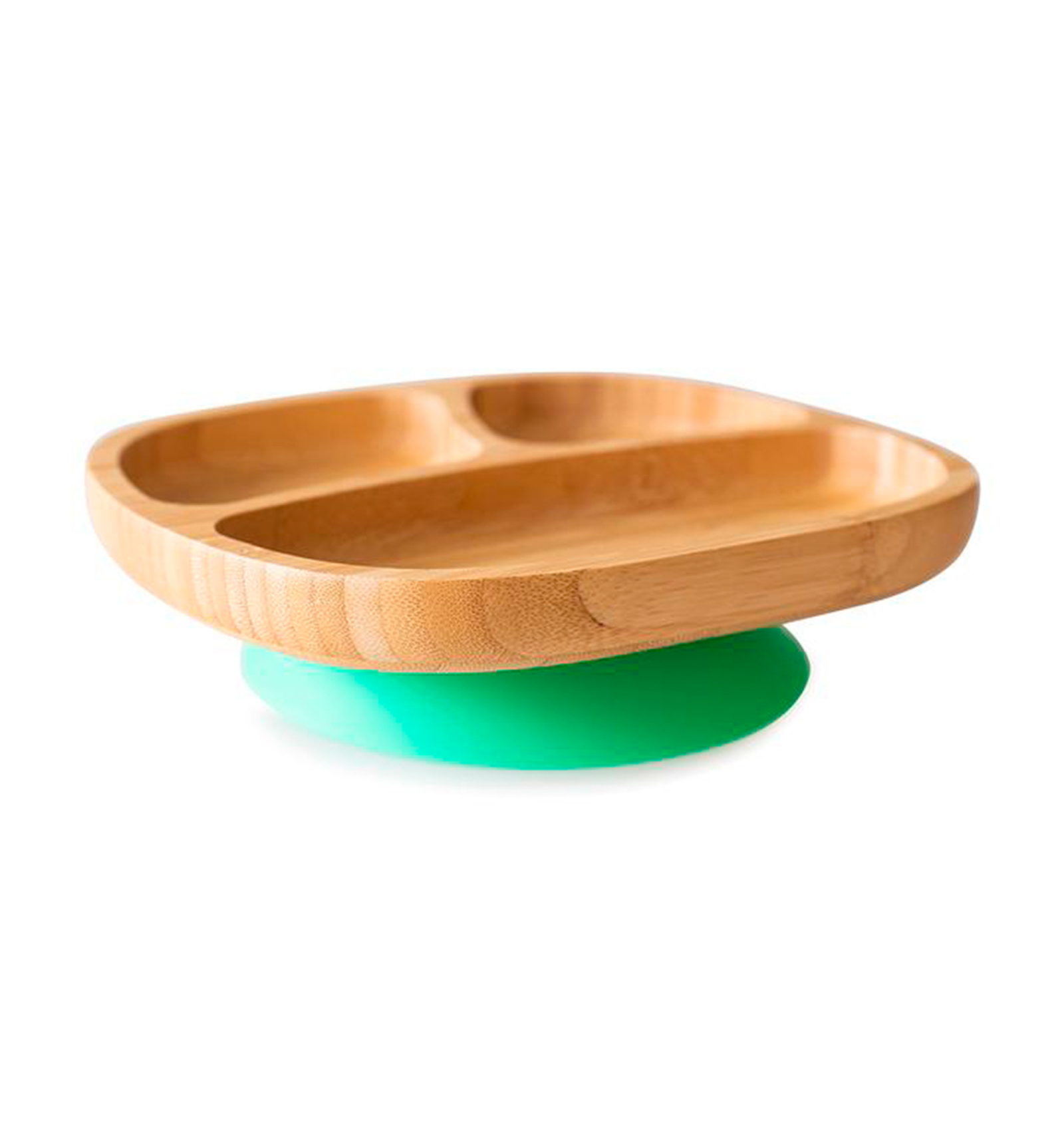 Vaixella de bambú amb ventosa. Amb tres seccions per a separar aliments. La base de succió de silicona desmuntable funciona com un mecanisme hermètic per a assegurar la subjecció a la trona o a la taula. Fet de bambú, un material natural, orgànic, biodegradable, reciclable i conreat i collit sense pesticides. Fàcil de netejar i fresc al tacte.