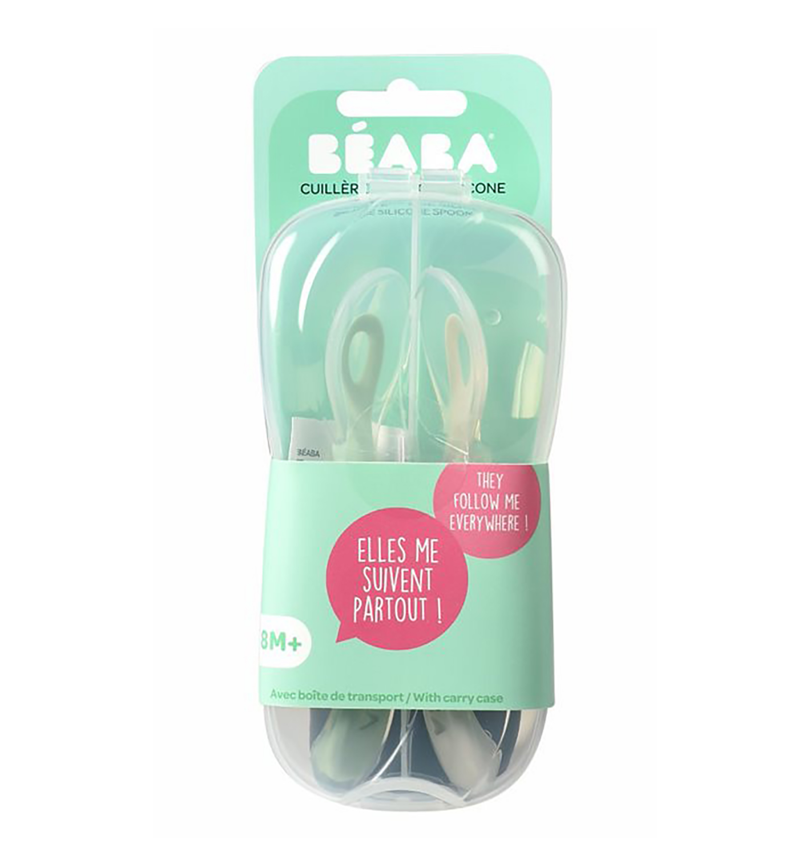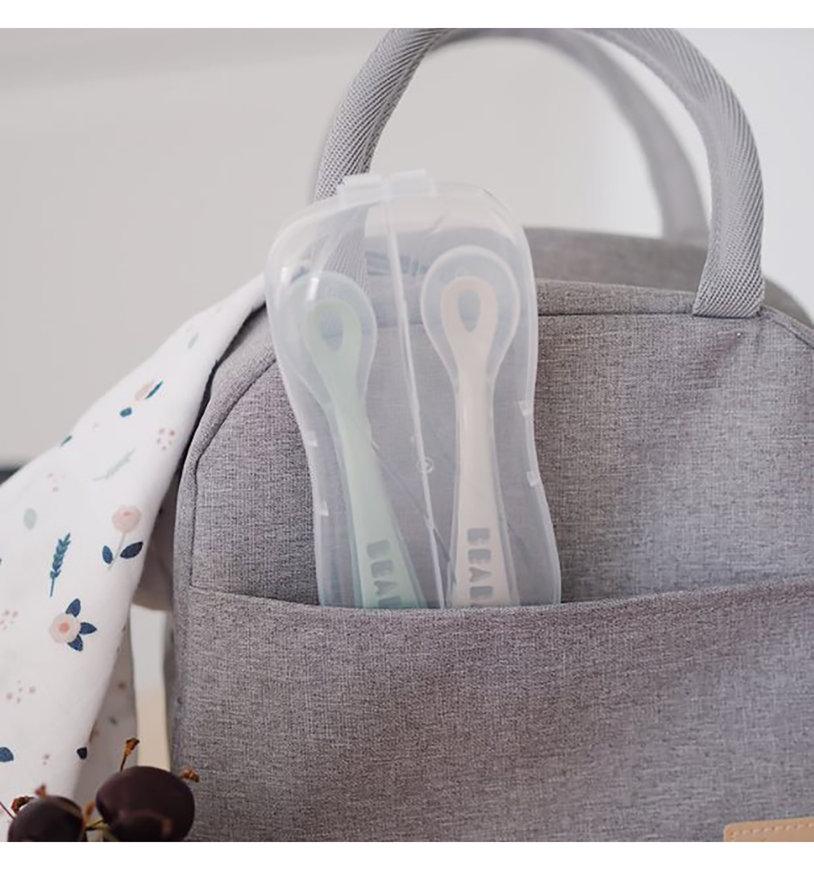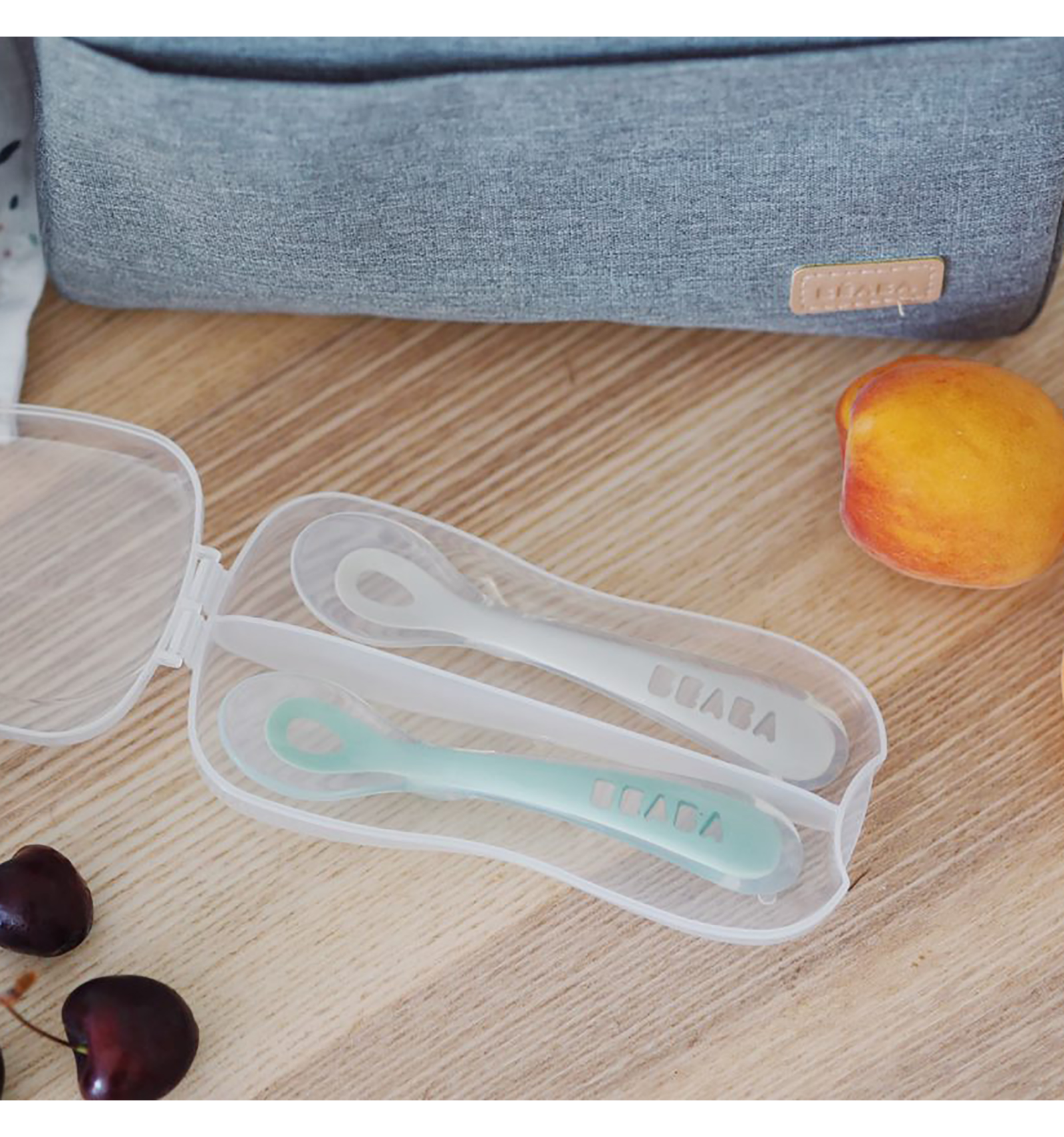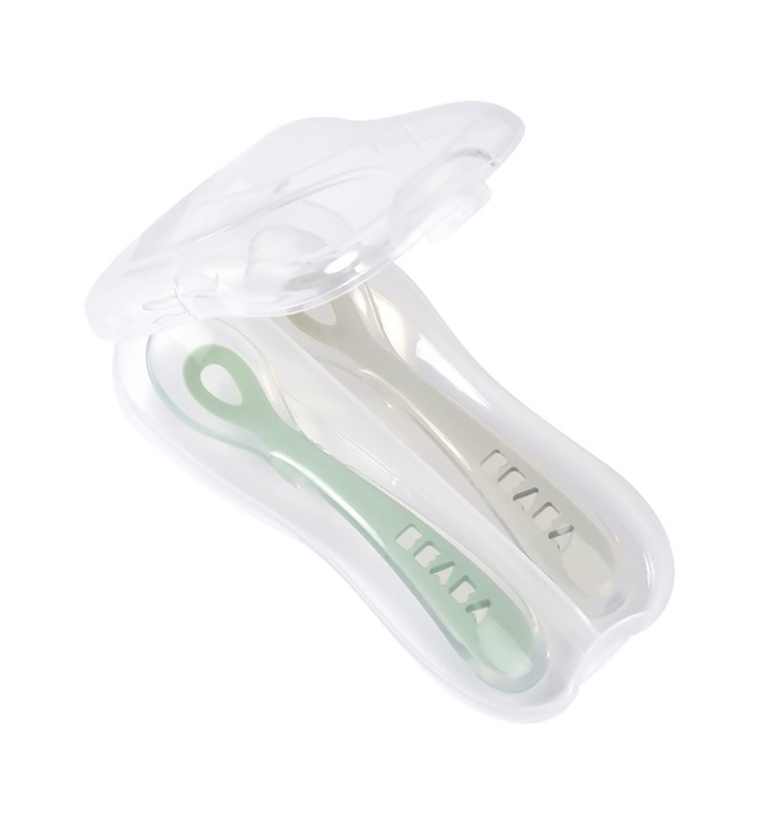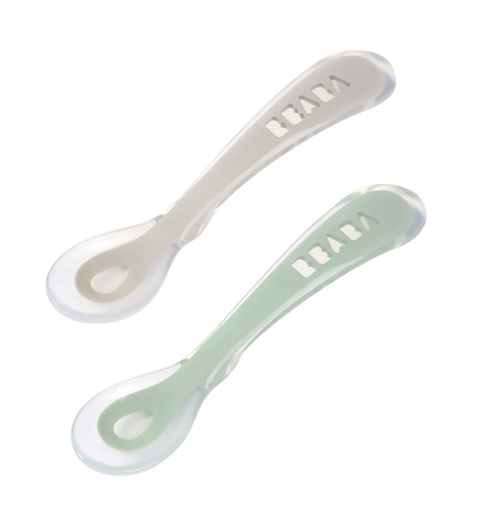 Pack de dues culleres de silicona grisa i verd amb caixa de transport. Les culleres d'aprenentatge de 2n edat, faciliten el maneig del nen fomentant l'autonomia a l'hora de menjar només. La punta de la cullera és de silicona flexible per a evitar lesions en les genives.