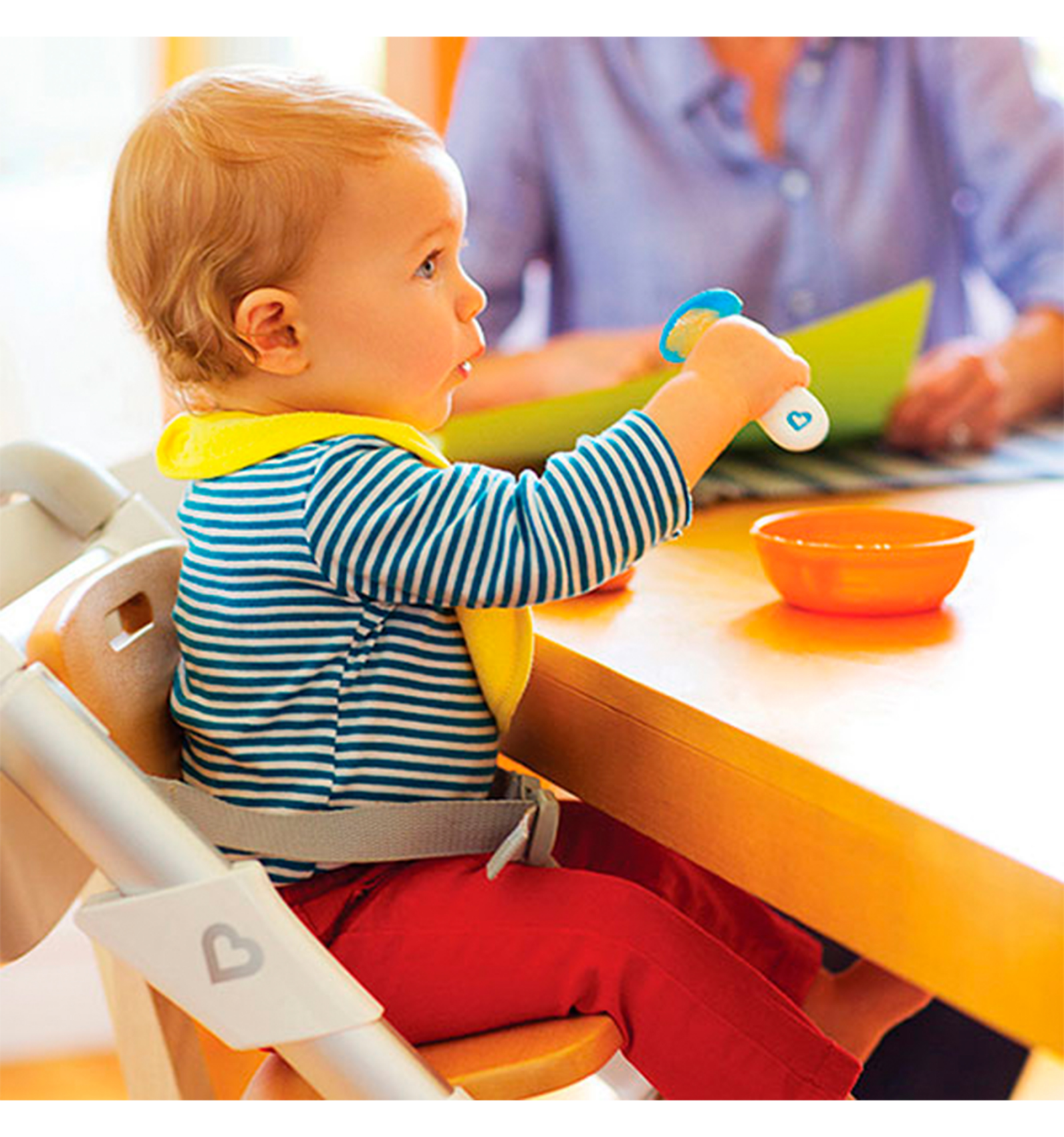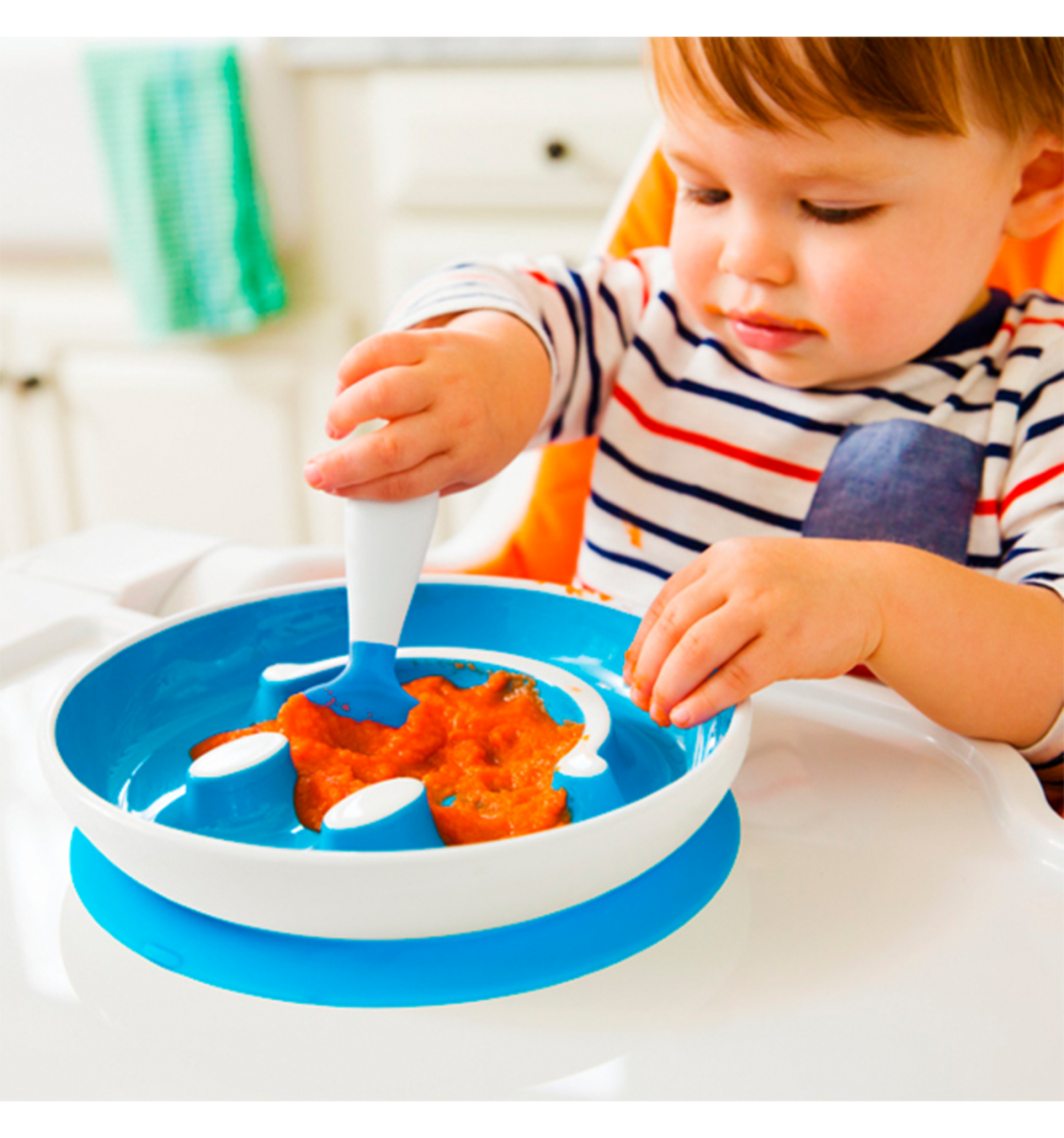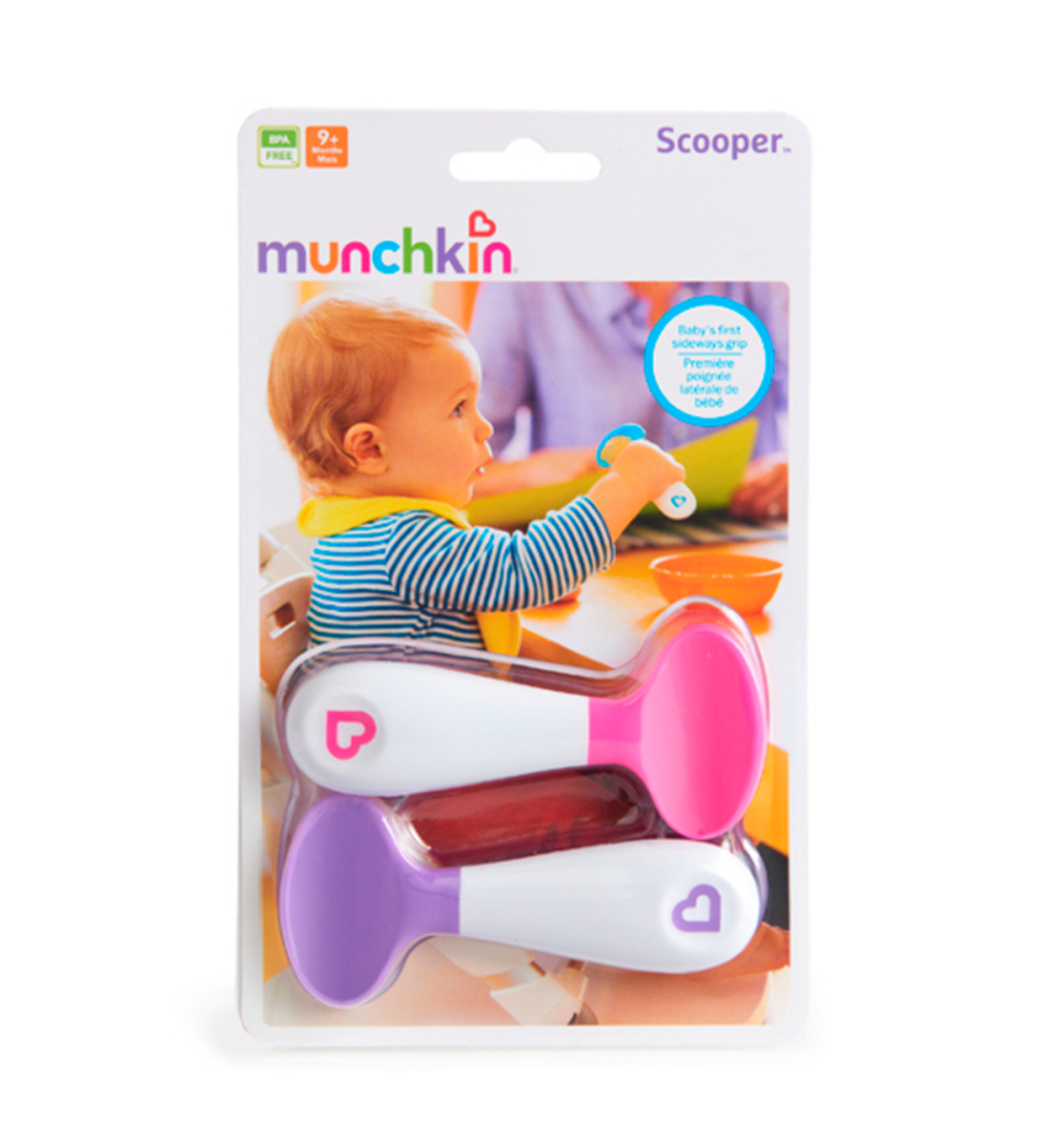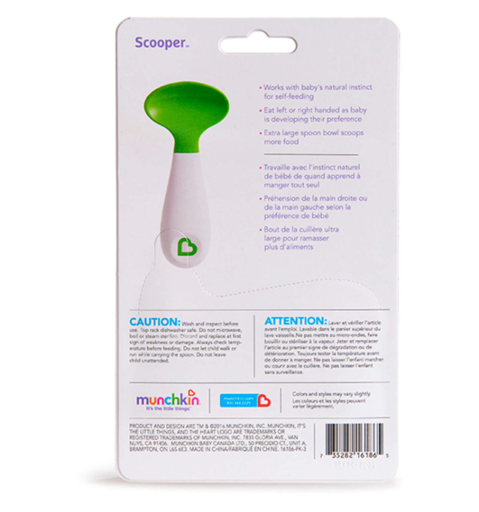 Cullera pala de Munchkin, dissenyada per a seguir l'instint natural del bebè a l'hora de començar a menjar solet. Permet agafar el mànec tant amb la dreta com amb l'esquerra i menjar de costat. En tenir bastanta profunditat, permet que arribi més menjar a la boca.