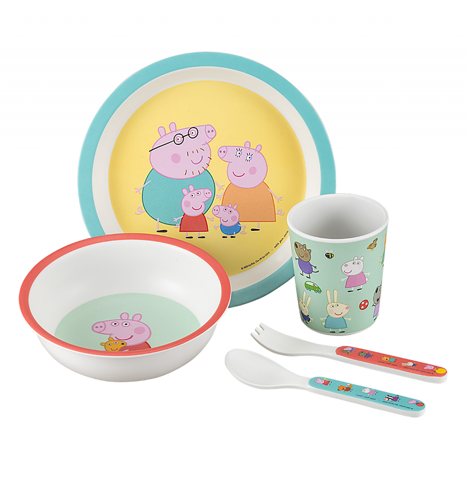 La vaixella infantil de cinc peces de Peppa Pig, de Petit Jour Paris, està dissenyada perquè els menjars siguin més entretingudes i pràctiques. Fabricada en melamina d'alta qualitat, lliure de BPA i ftalats, compleix amb les normatives de seguretat EN14372/EN14350, garantint un ús segur per a nens a partir dels 6 mesos.