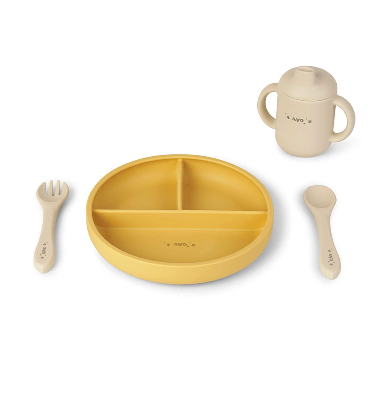 Vajilla de silicona Saro "Food & Fun": completa y práctica para el Baby Led Weaning. Incluye plato con secciones y ventosa, cubiertos ergonómicos y taza antiderrame. Fabricada en silicona alimentaria, eco-friendly, flexible y antibacteriana. Apta para microondas y lavavajillas. Ideal para las primeras comidas de tu bebé.