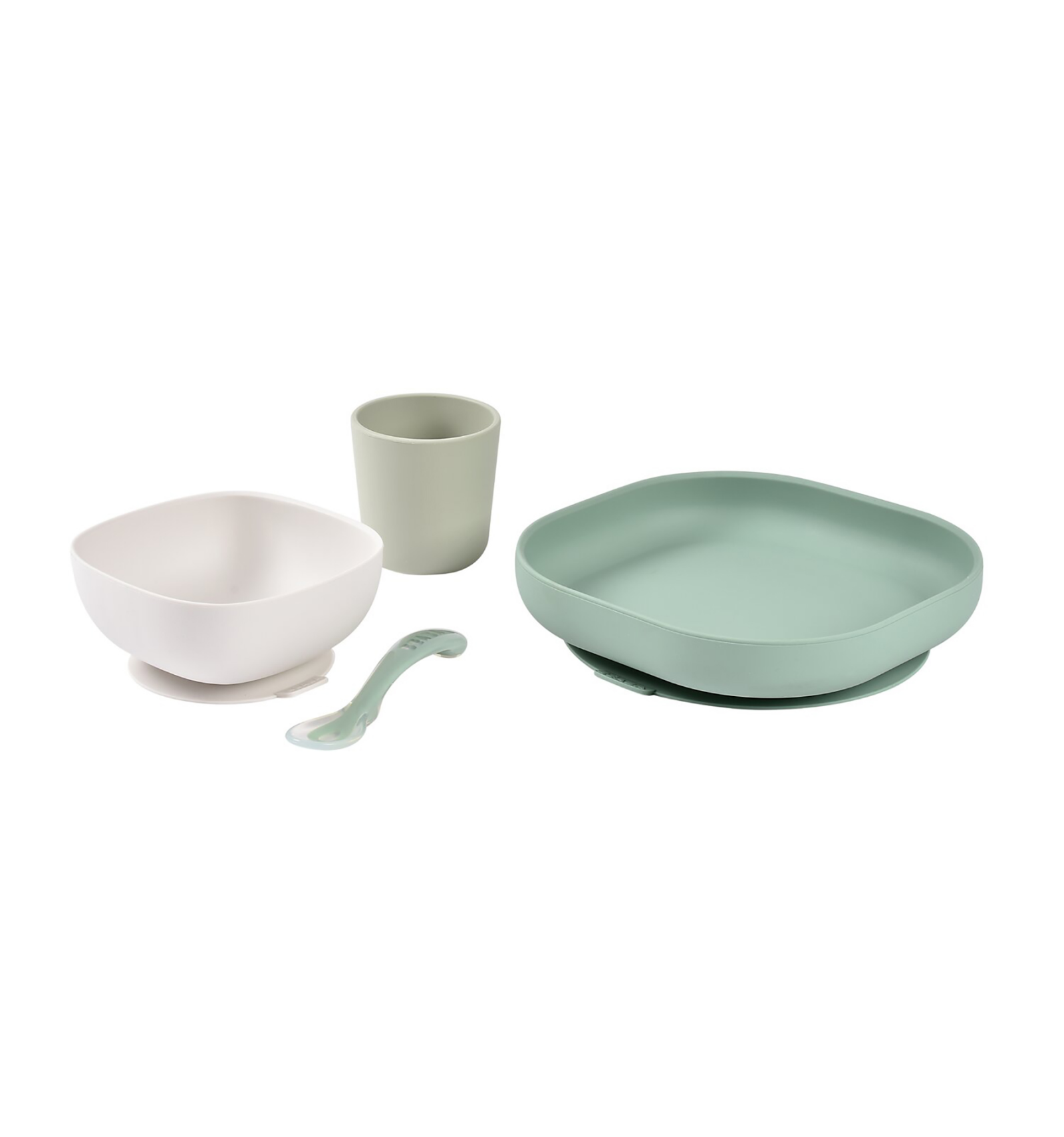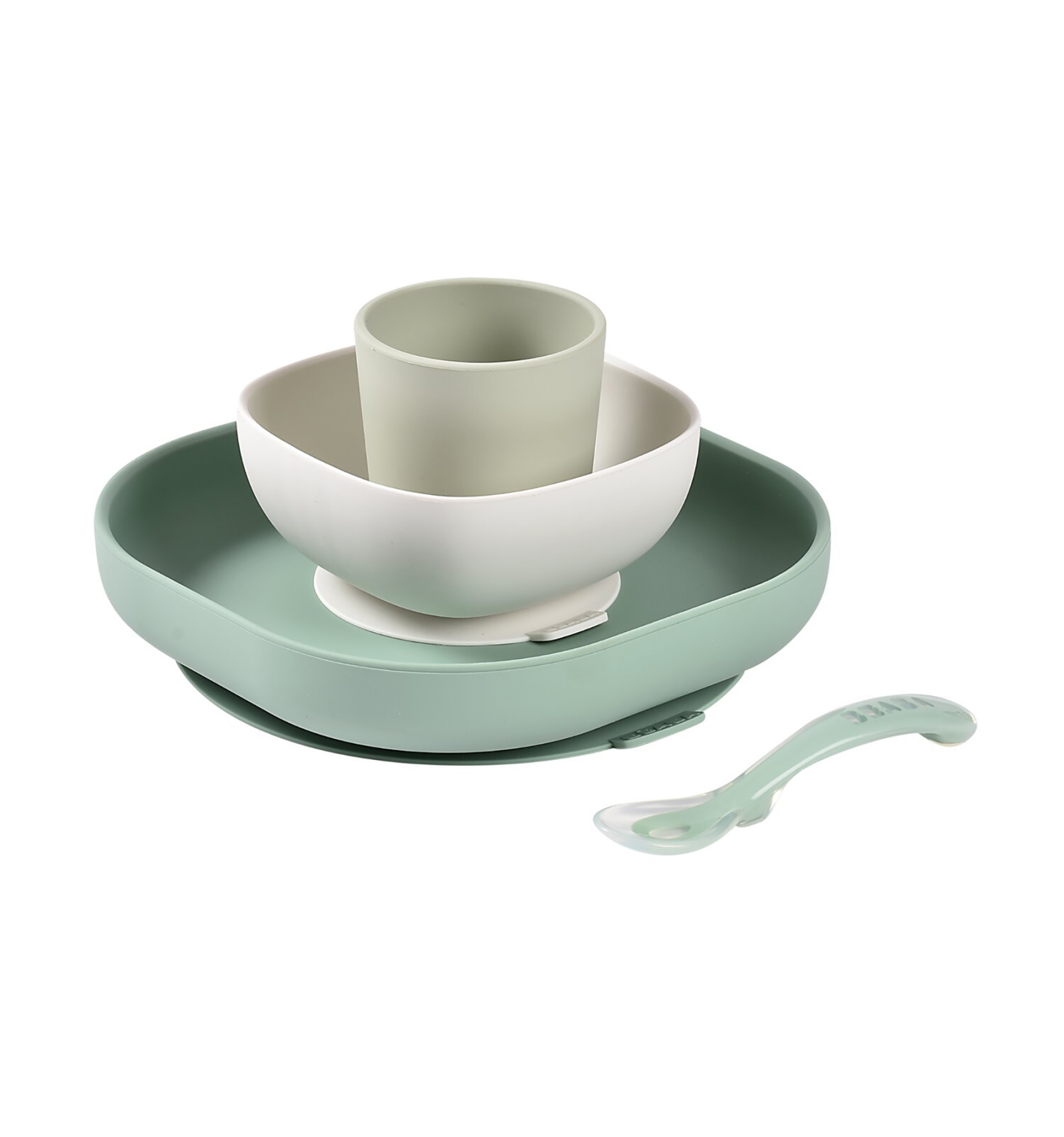 Vaixella infantil de silicona composta per un plat amb ventosa, un bol amb ventosa, un got i una cullera per a fixar els plats en la taula i evitar incidents.