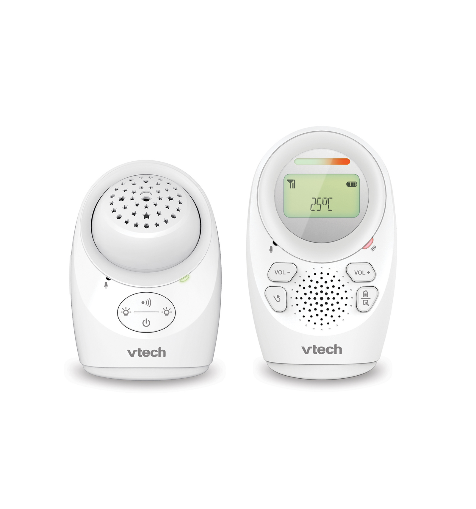 El monitor d'àudio per a bebès de VTech ofereix abast de fins a 460 m, alerta sonora per vibració, comunicació bidireccional i projector de llum nocturna. Amb sensor de temperatura, cançons de bressol, pantalla retroiluminada i llueixes LED que indiquen el nivell de soroll, proporciona tranquil·litat per a tu i un ambient relaxat per al teu bebè.
