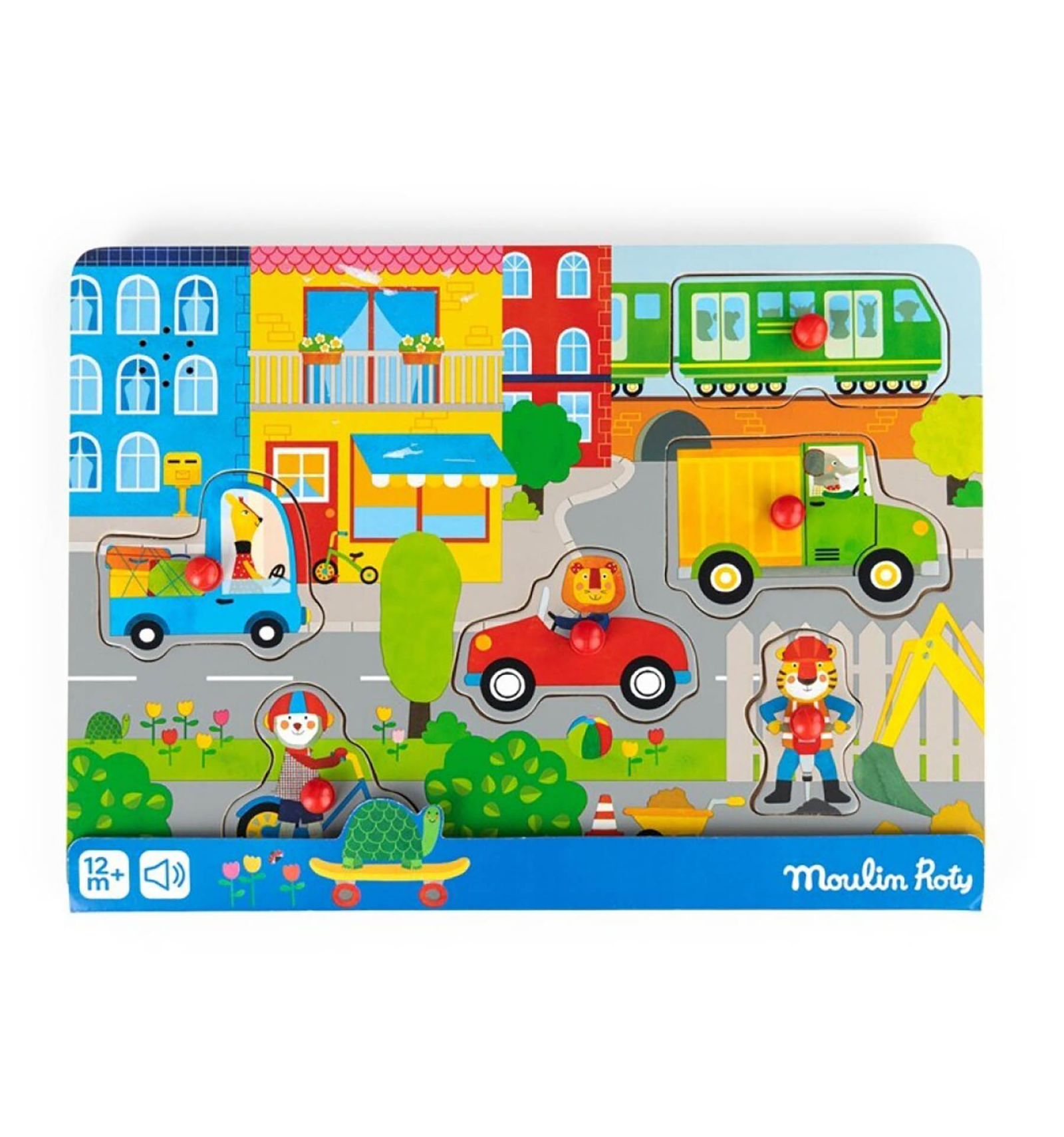 Descubre el puzzle sonoro de madera de la ciudad de la colección Popipop de Moulin Roty, un juguete encantador diseñado especialmente para los más pequeños.
