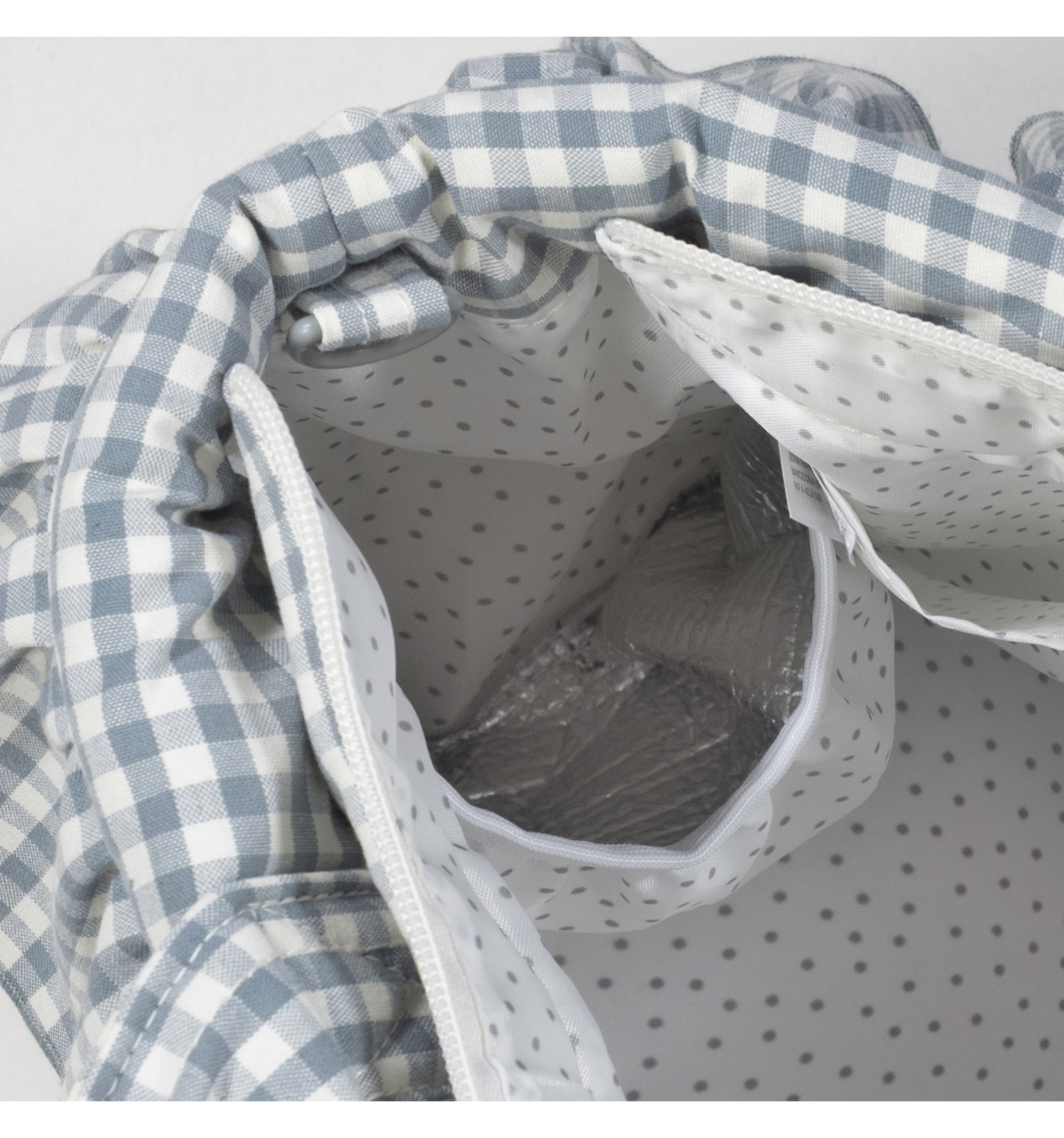 El bolso dispone de un sistema universal de fijación, con asas cortas ajustables que permiten colocarlo fácilmente en cualquier modelo de silla de paseo.