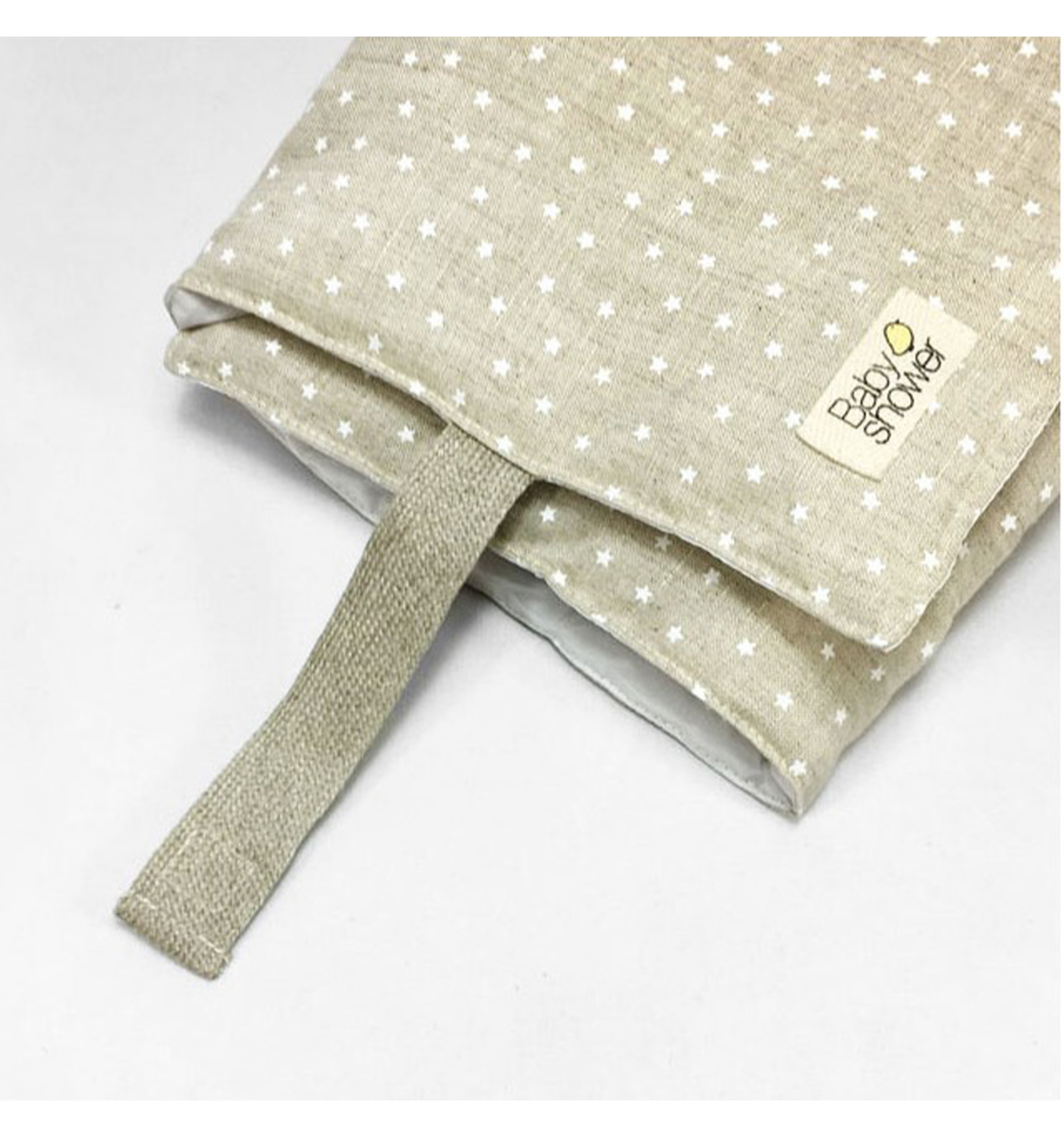 Cambia a tu bebé en cualquier lugar. De mayor tamaño que los cambiadores habituales, se guarda enrollado ocupando un espacio reducido. Con relleno acolchado esponjoso e interior plastificado. Tejido exterior en lino estampado. Cierre de velcro. Medidas cerrado: 22 x 10 x 10 cm. Medidas abierto: 63 x 44 cm.