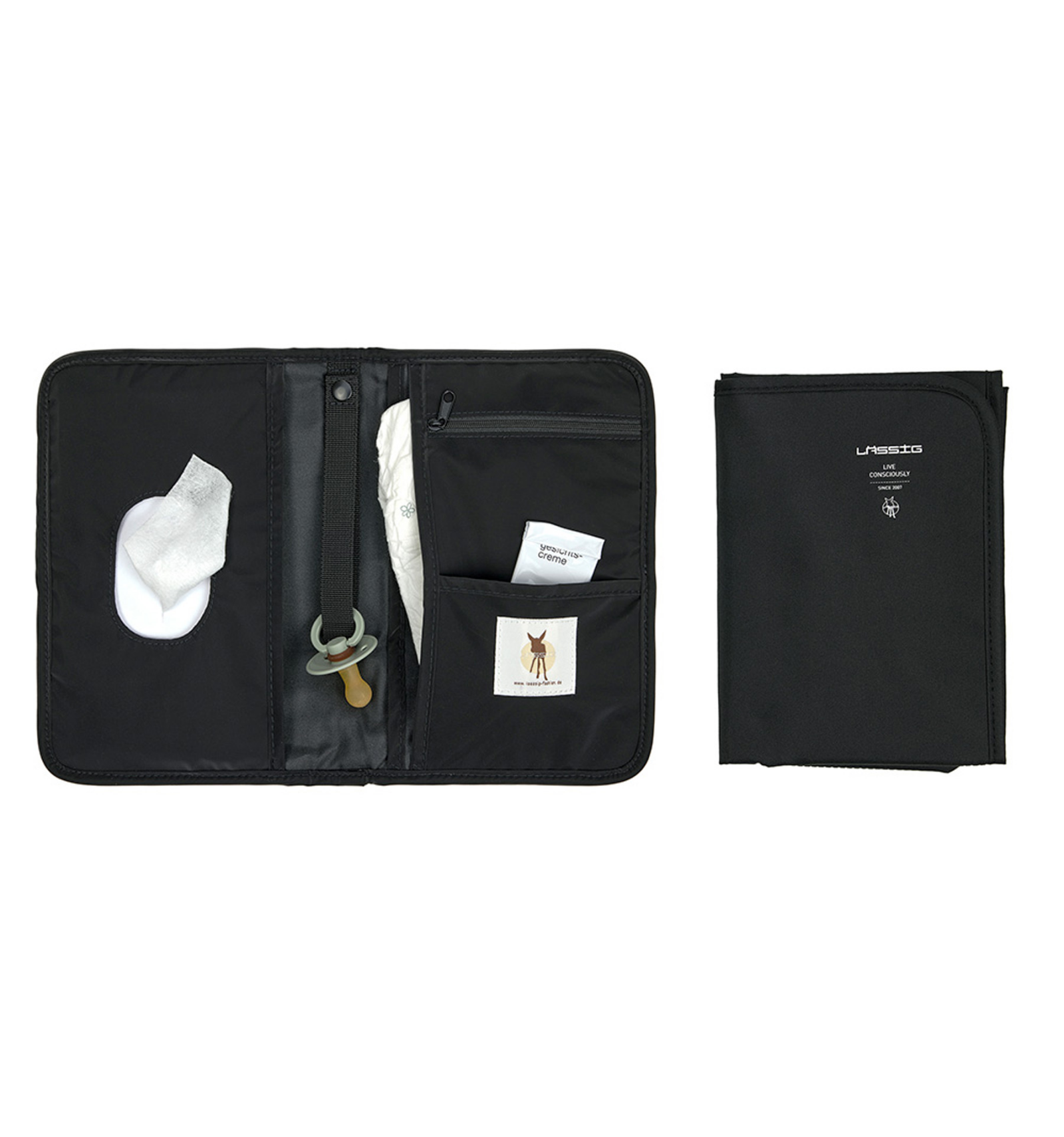 Las características funcionales permiten un cambio de pañal rápido y fácil. Un compartimento para toallitas húmedas con una práctica abertura, varios bolsillos para pañales y similares, un bolsillo con cremallera para los extremos y una cinta para sujetar un chupete, hacen de este un práctico accesorio. Un cambiador acolchado suave y repelente al agua que combina con el bolso, asegura un cambio de pañal óptimo para el bebé.