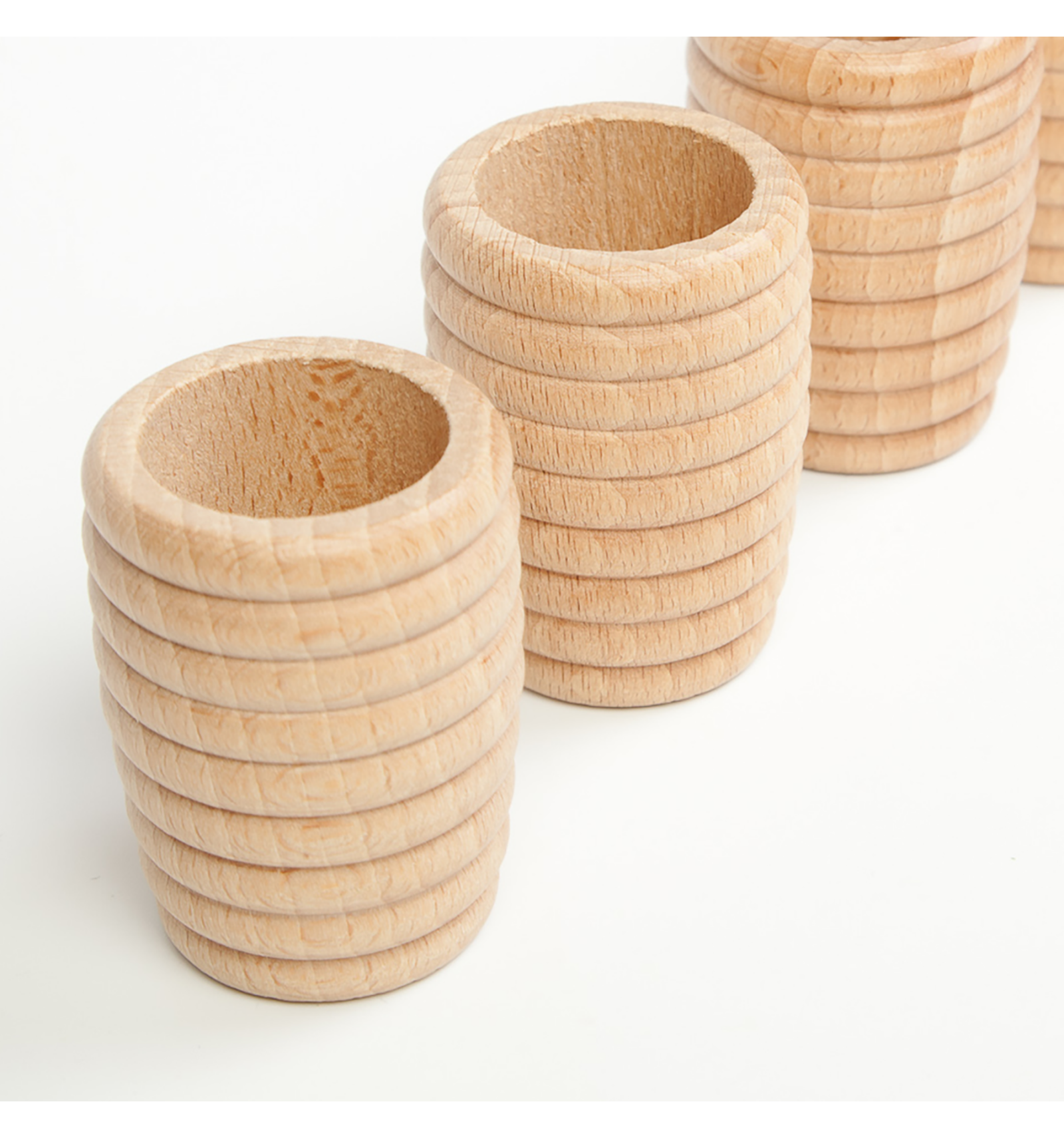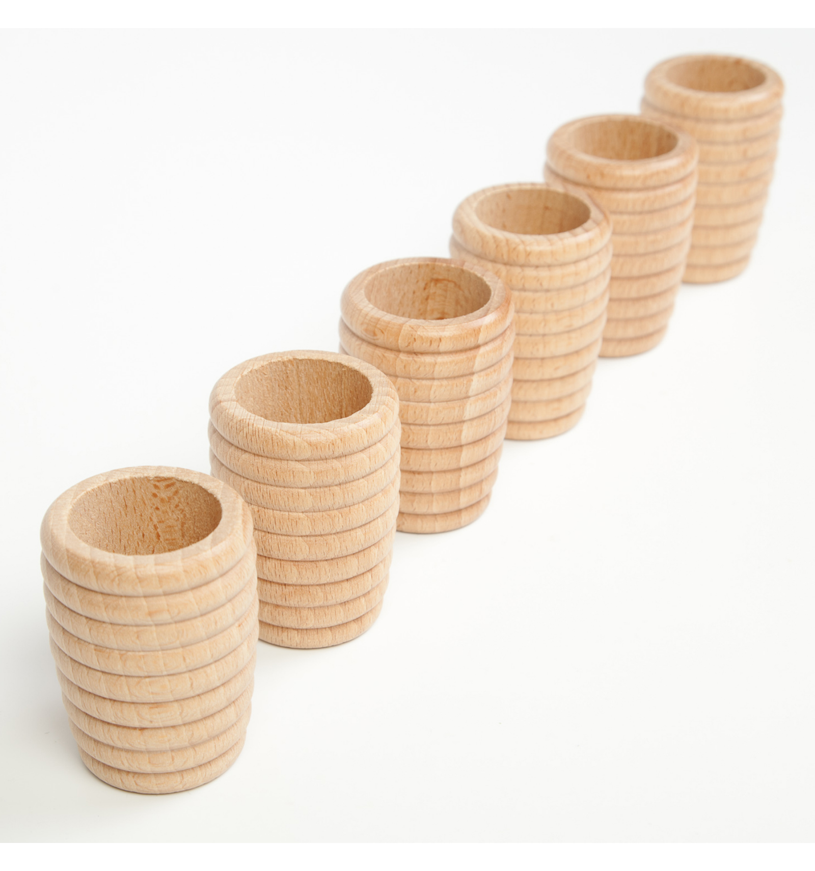 Un material tan sencillo como complejo, tan libre como versátil, tan ideal para el juego como para el desarrollo del pensamiento lógico-matemático. Unos cubiletes de madera natural de Grapat para jugar, clasificar, ordenar, meter cosas, asociar,... ¡para experimentar!