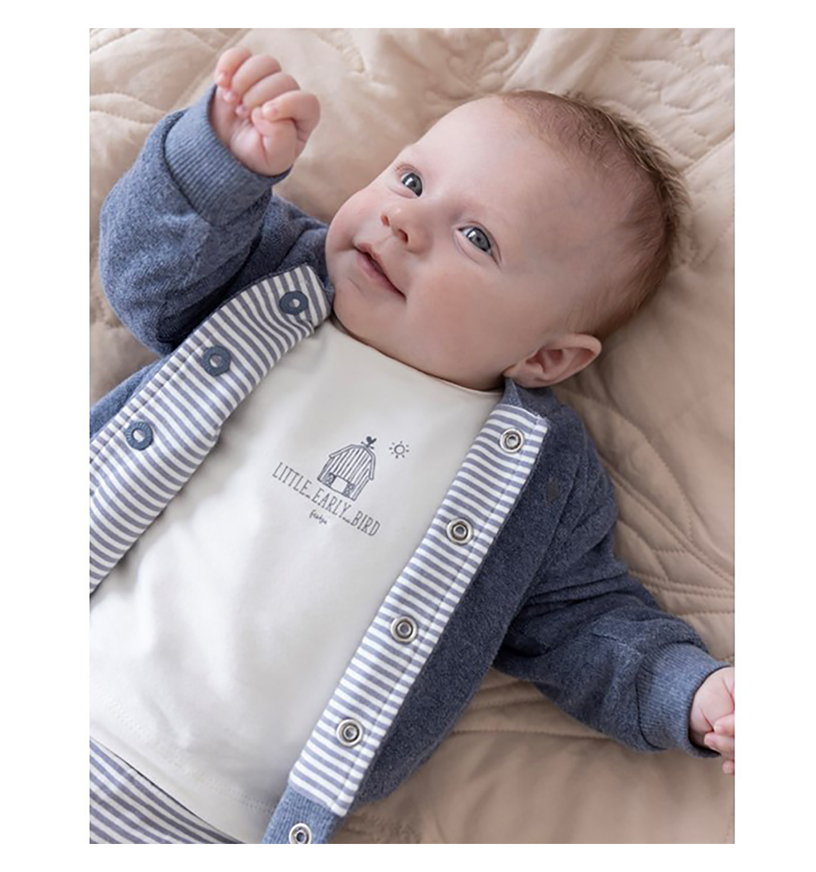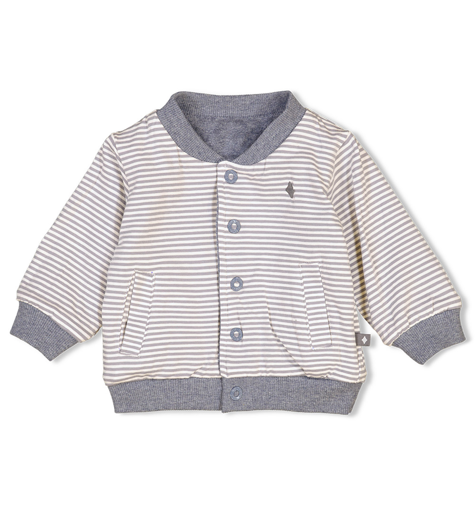 Chaqueta reversible Feetje de la marca holandesa para bebés, con exterior de 74% algodón orgánico y 26% poliéster. Puños de 92% algodón orgánico y 8% elastano para mayor comodidad. Práctica y versátil, perfecta para el día a día.