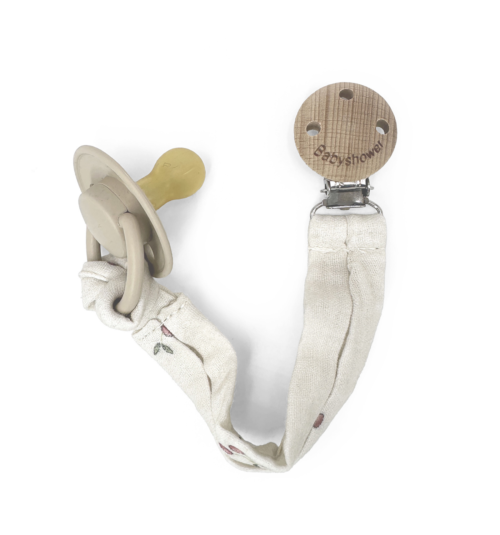 Chupetes bajo control. Sujeta el chupete de tu bebé con esta bonita pinza de madera natural con cinta de BabyShower. Con clip a presión y cinta de tejido para fijar la arandela del chupete. Cinta de 20 cm.