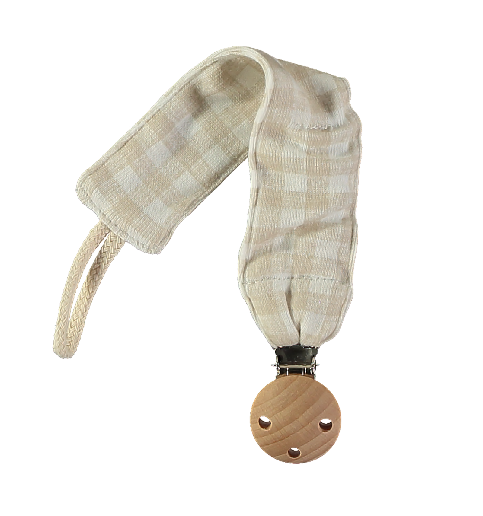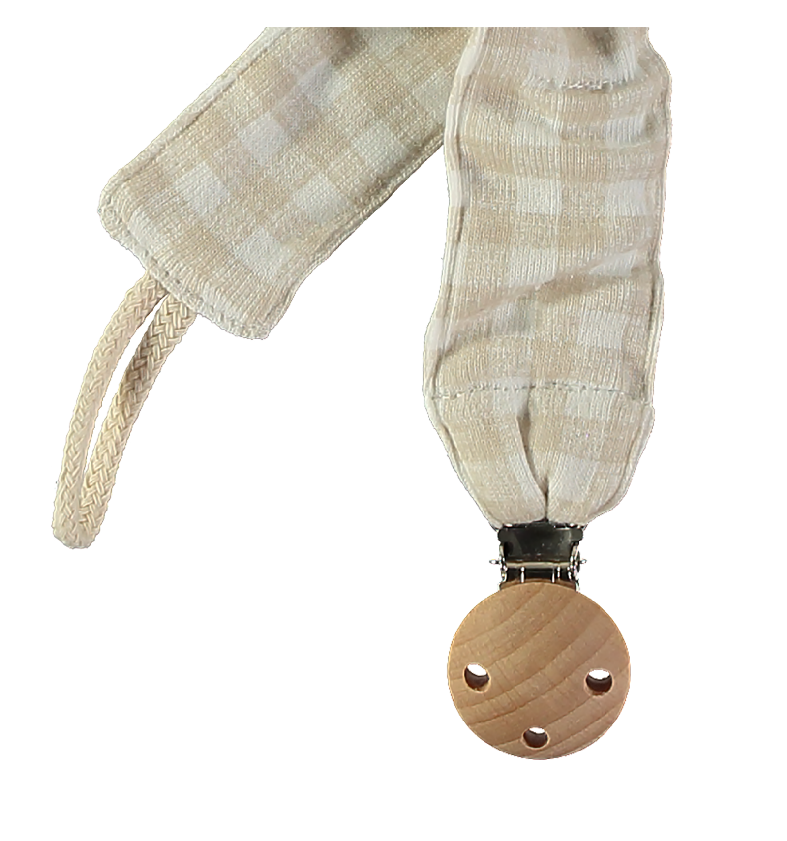 Pinza de madera con cintas de tejido para fijar en la arandela del chupete. Con cierre de pinza a presión y cinta para fijar la arandela del chupete.