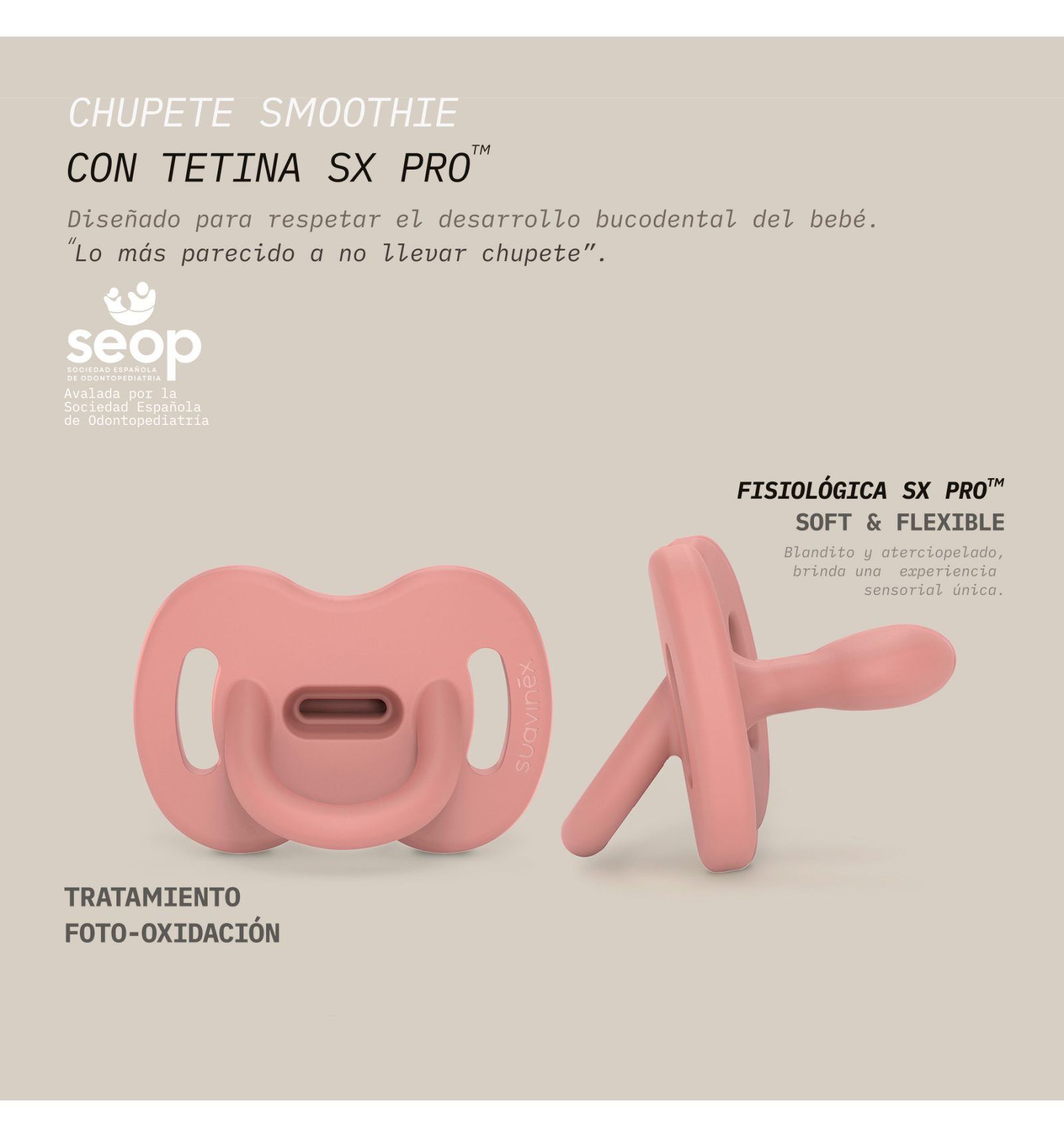 • Tetina fisiológica SX Pro: Diseñada para respetar el desarrollo bucodental del bebé, permitiendo un cierre natural de la boca.