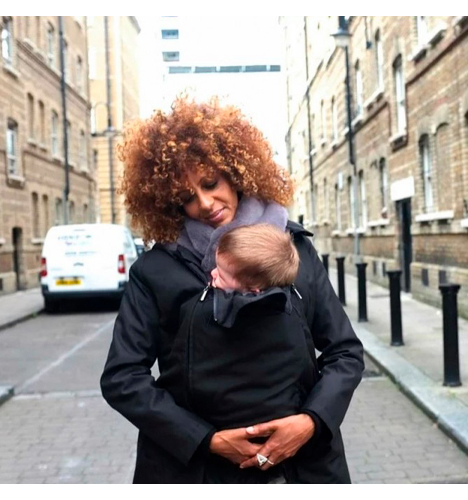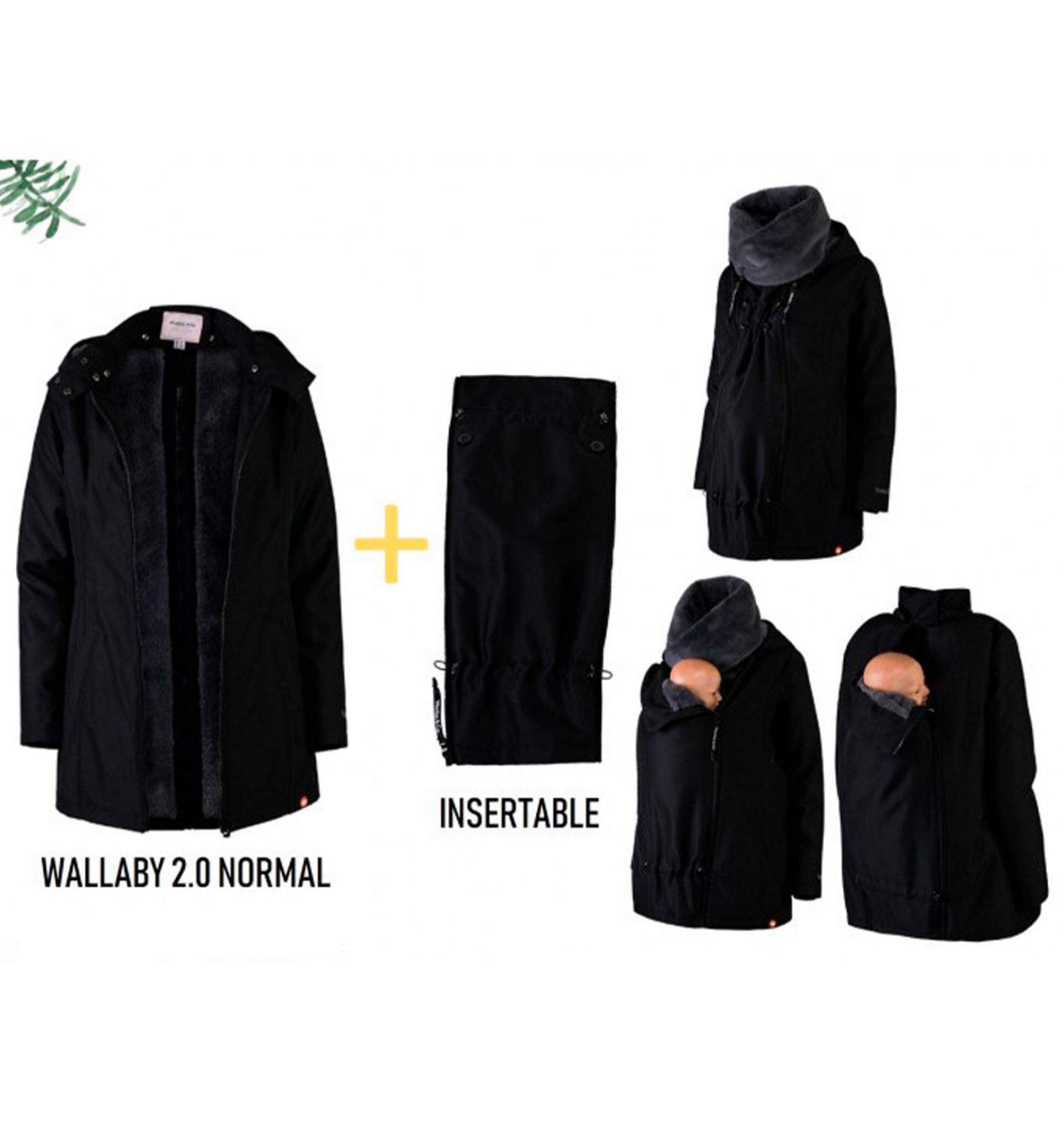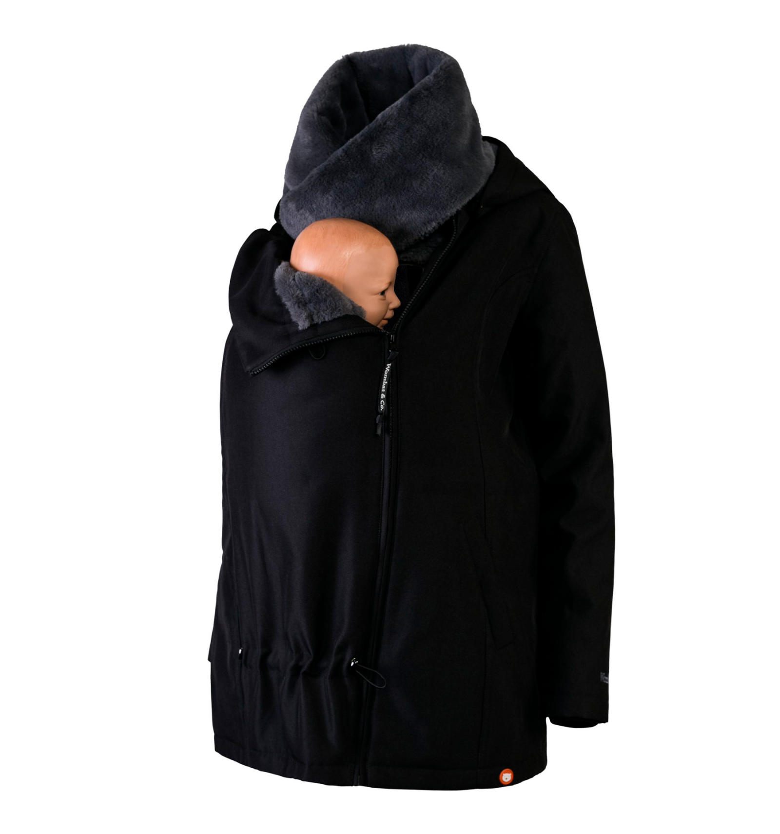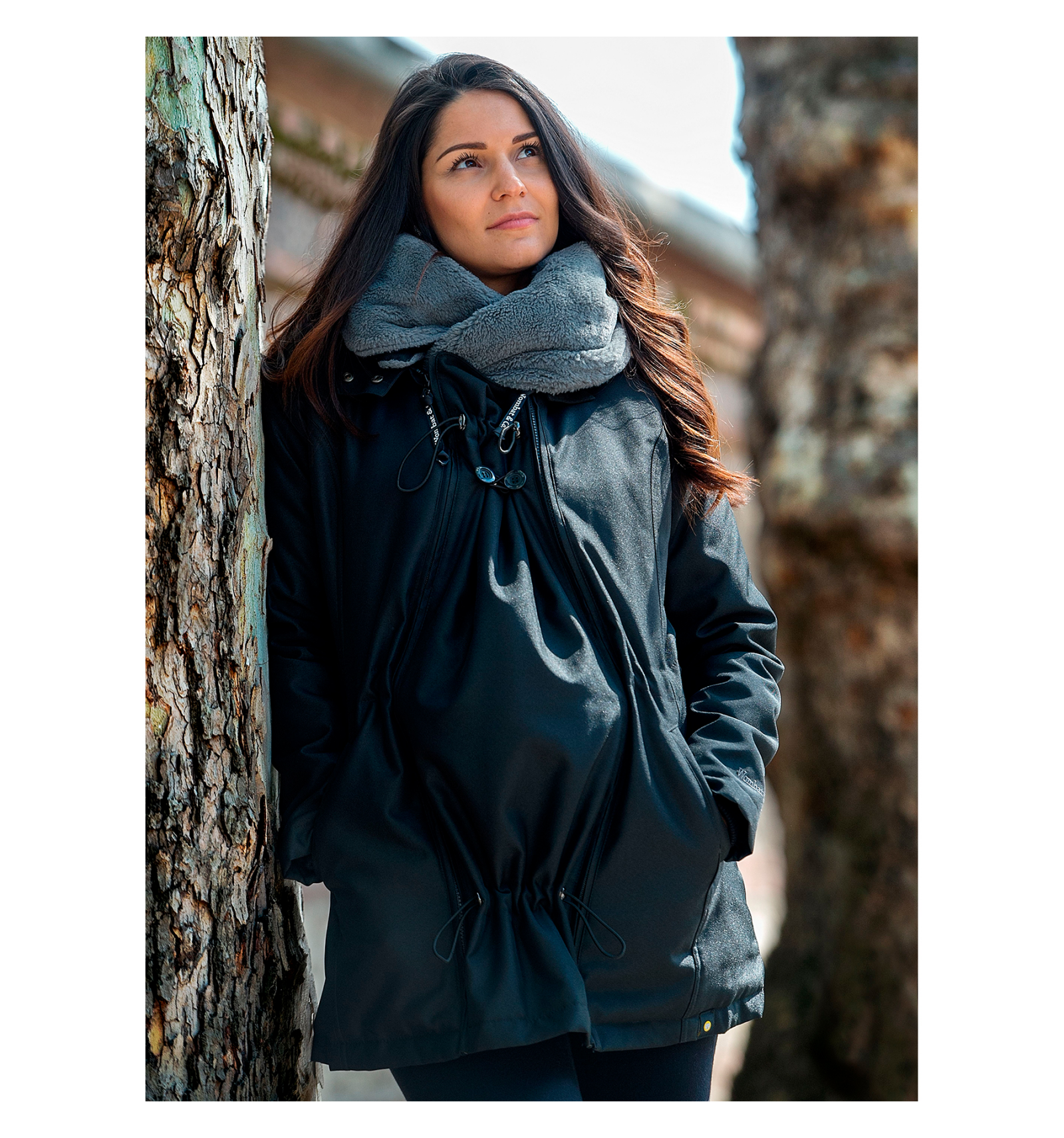 Diseñado como abrigo de porteo pero fabuloso durante cualquier etapa de la mujer. Un abrigo 4 en 1: abrigo normal, abrigo de embarazada, abrigo de porteo en la espalda y abrigo de porteo en el pecho. Con un cuello desmontable que protege aún más del frío sin molestar a tu bebé. Abrigo negro y cuello gris.