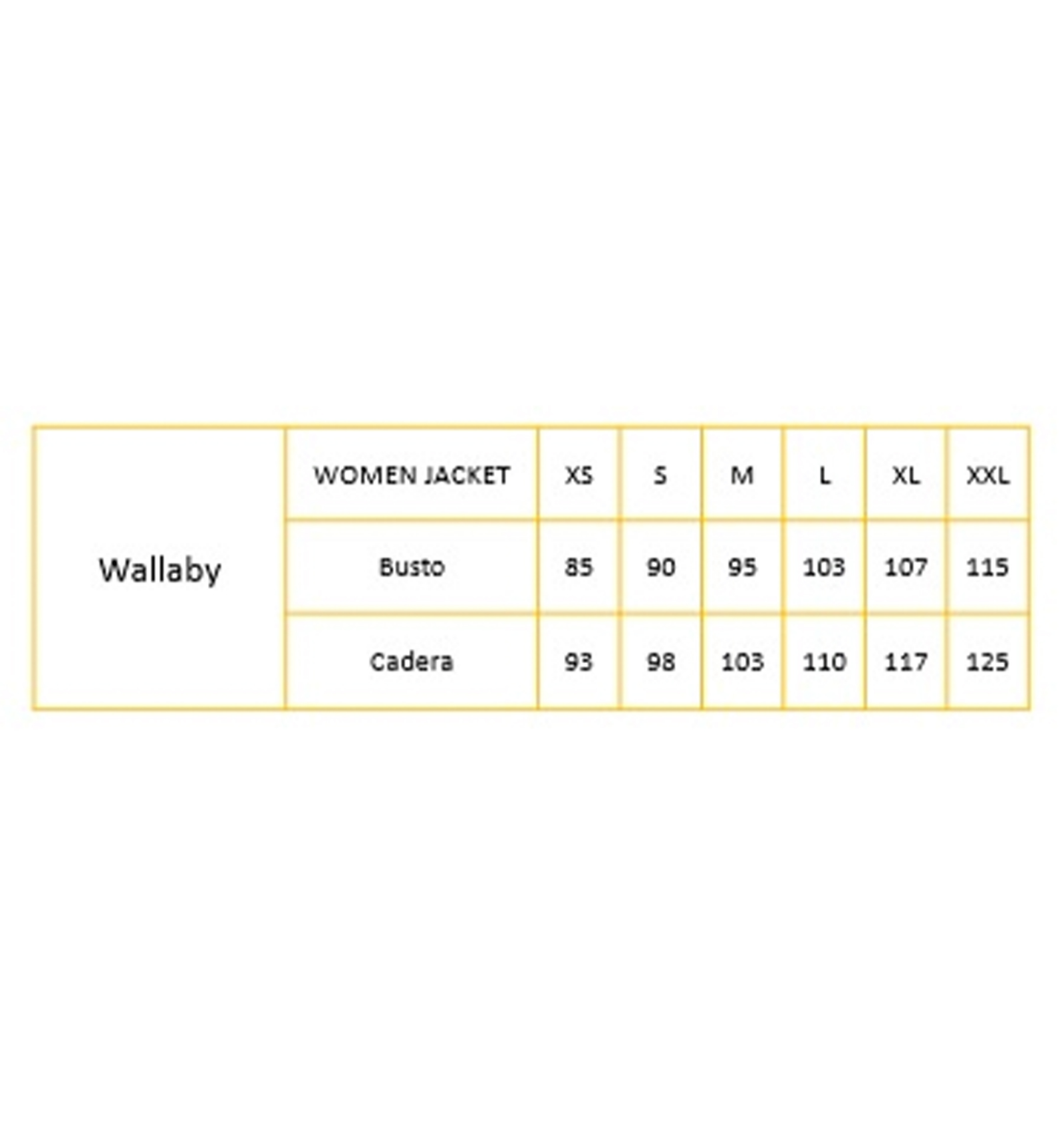 Ombligo: 93 (XS), 98 (S), 103 (M), 110 (L), 117 (XL), 125 (XXL).
