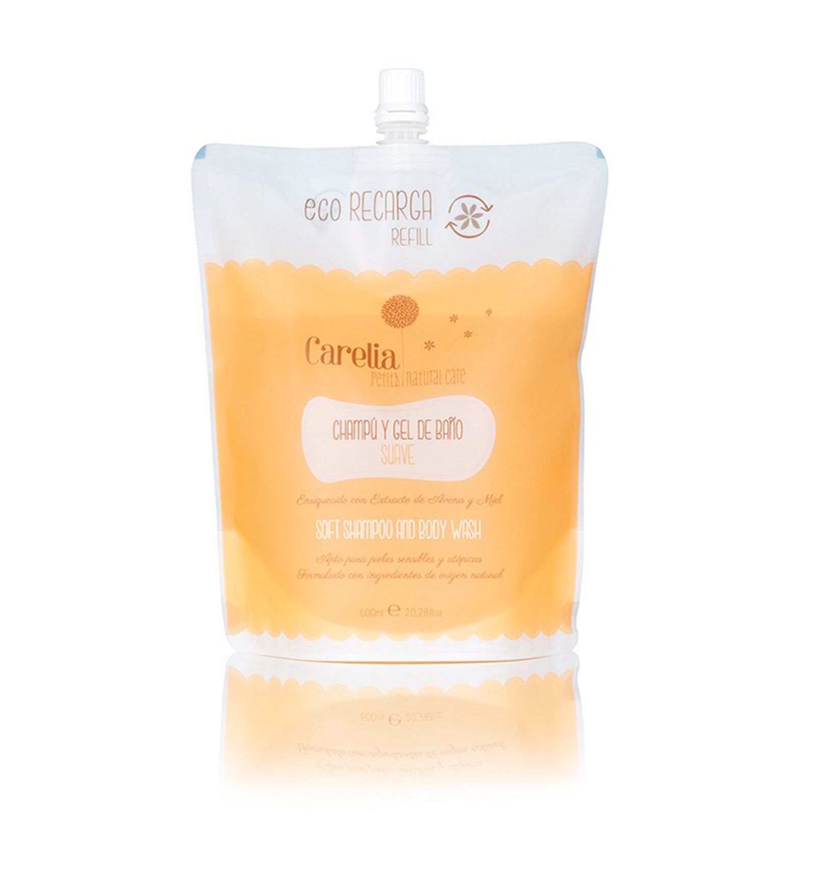 Capacidad 600 ml. Puedes usarlo directamente, gracias a la práctica bolsa y su tapón con rosca, o puedes comprarlo para rellenar el frasco de 200 ml del gel y champú de Carelia que también puedes encontrar en La Panxamama.