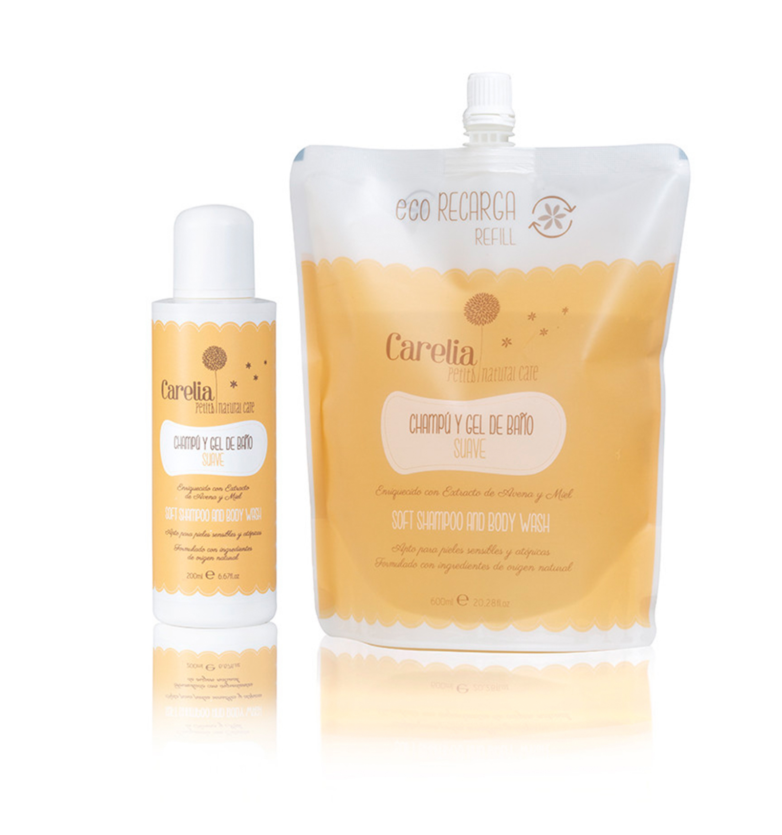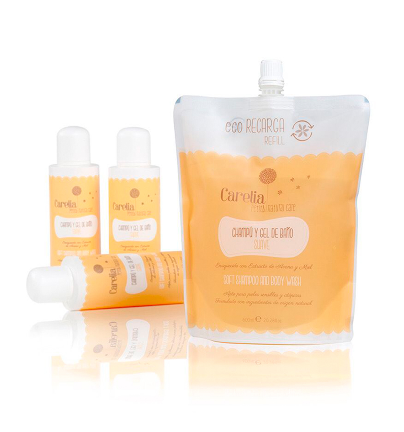 Recarga para 3 frascos de Champú y Gel de Baño Suave de Carelia. Una Eco-Recarga más sostenible y respetuosa con el medio ambiente, que da una segunda vida a los frascos.