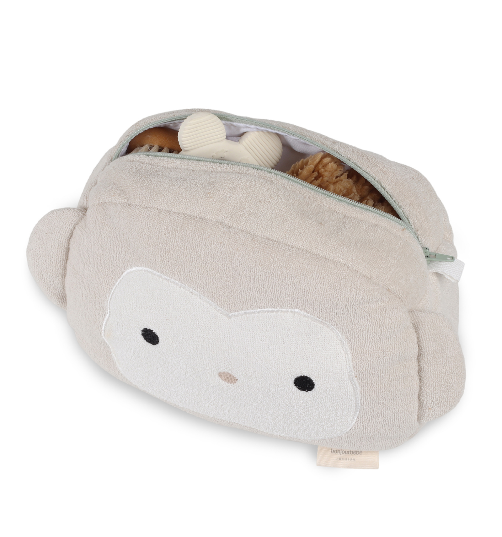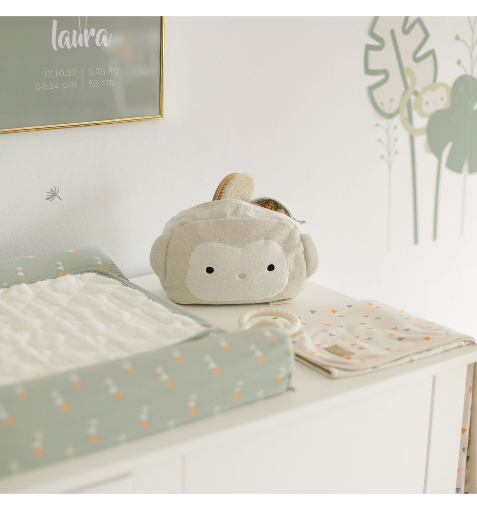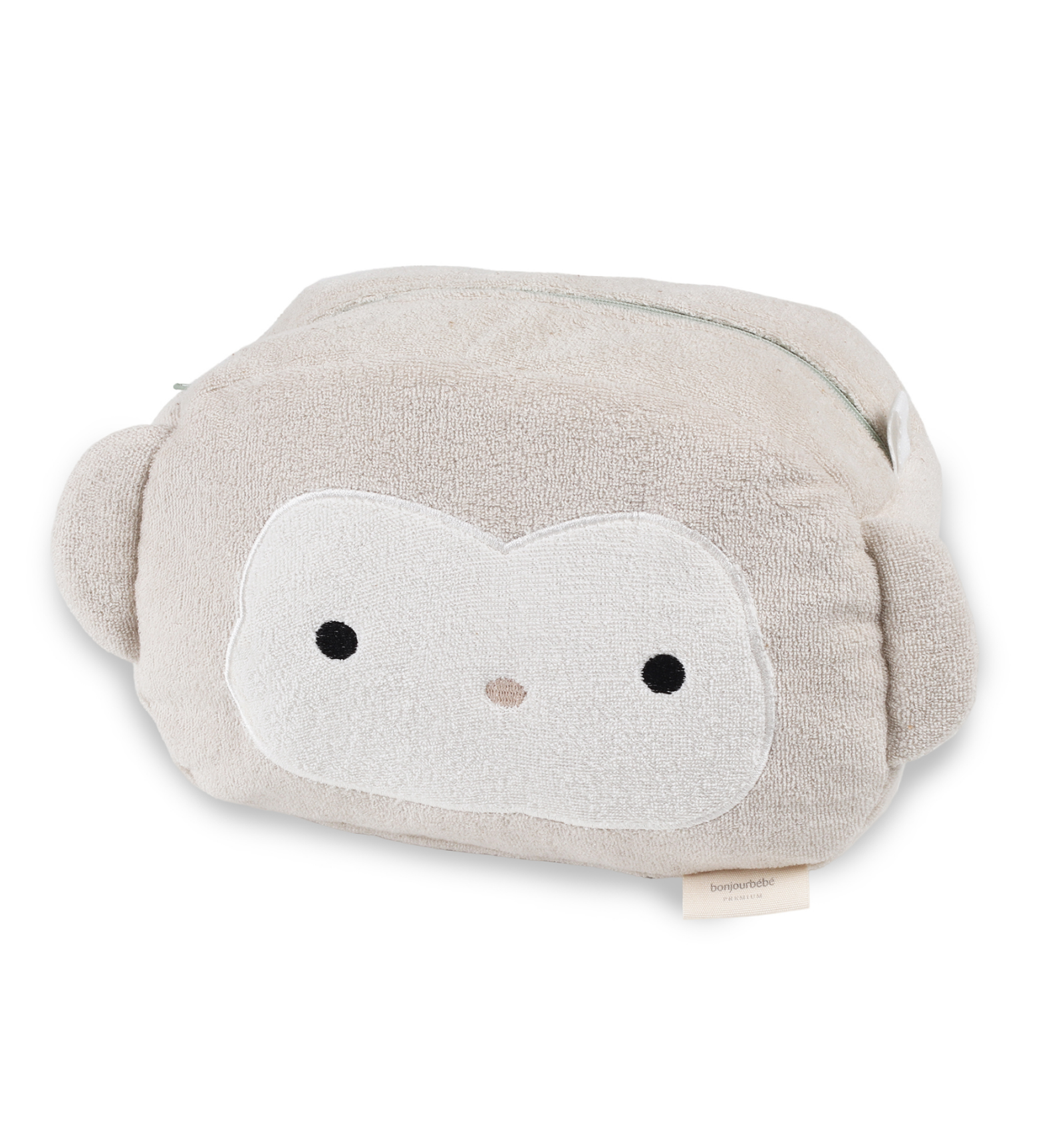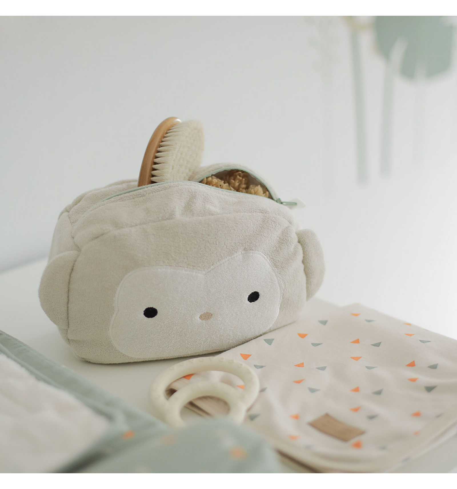 El neceser perfecto para mamás y papás. Un estuche de diseño moderno para que estéis siempre preparados y con todo lo necesario para el bebé localizado y a mano. Su forma de mono lo hace aún más especial y gracias a sus dos bolsillos interiores puedes tener todo más organizado.