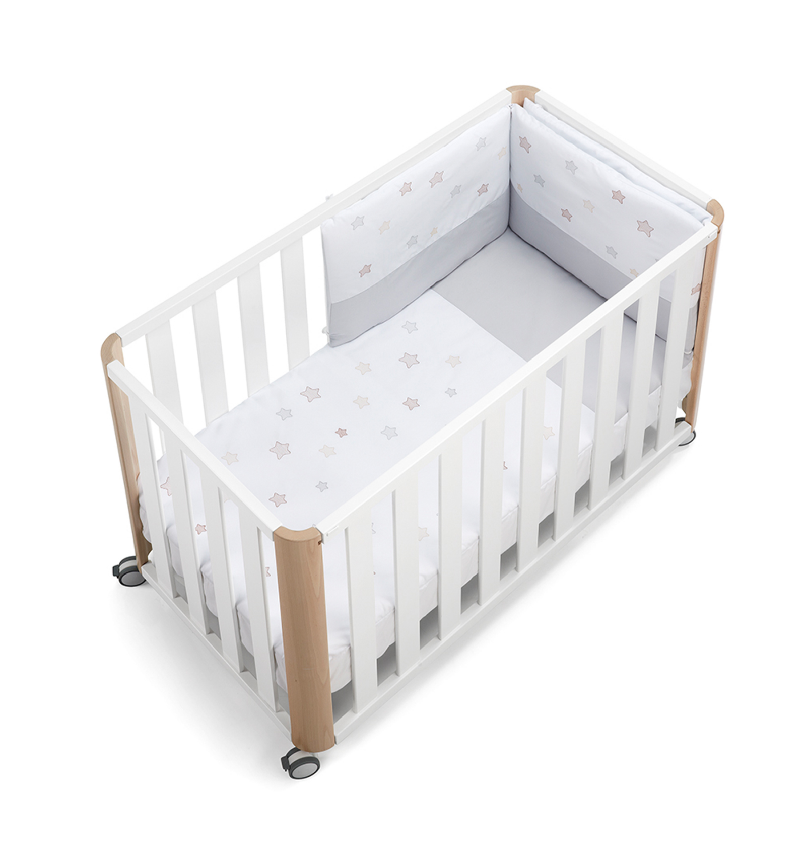 Dispone de un lateral móvil y un lateral fijo, 4 ruedas con freno y somier de láminas de madera con 2 posiciones de altura. Según normativa de seguridad europea UNE-EN-716:2008(+A1:2013).
