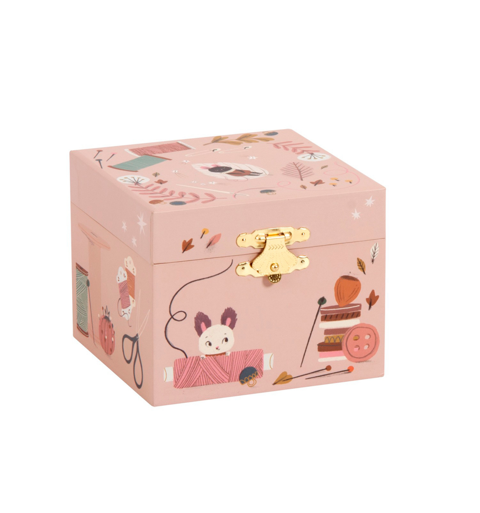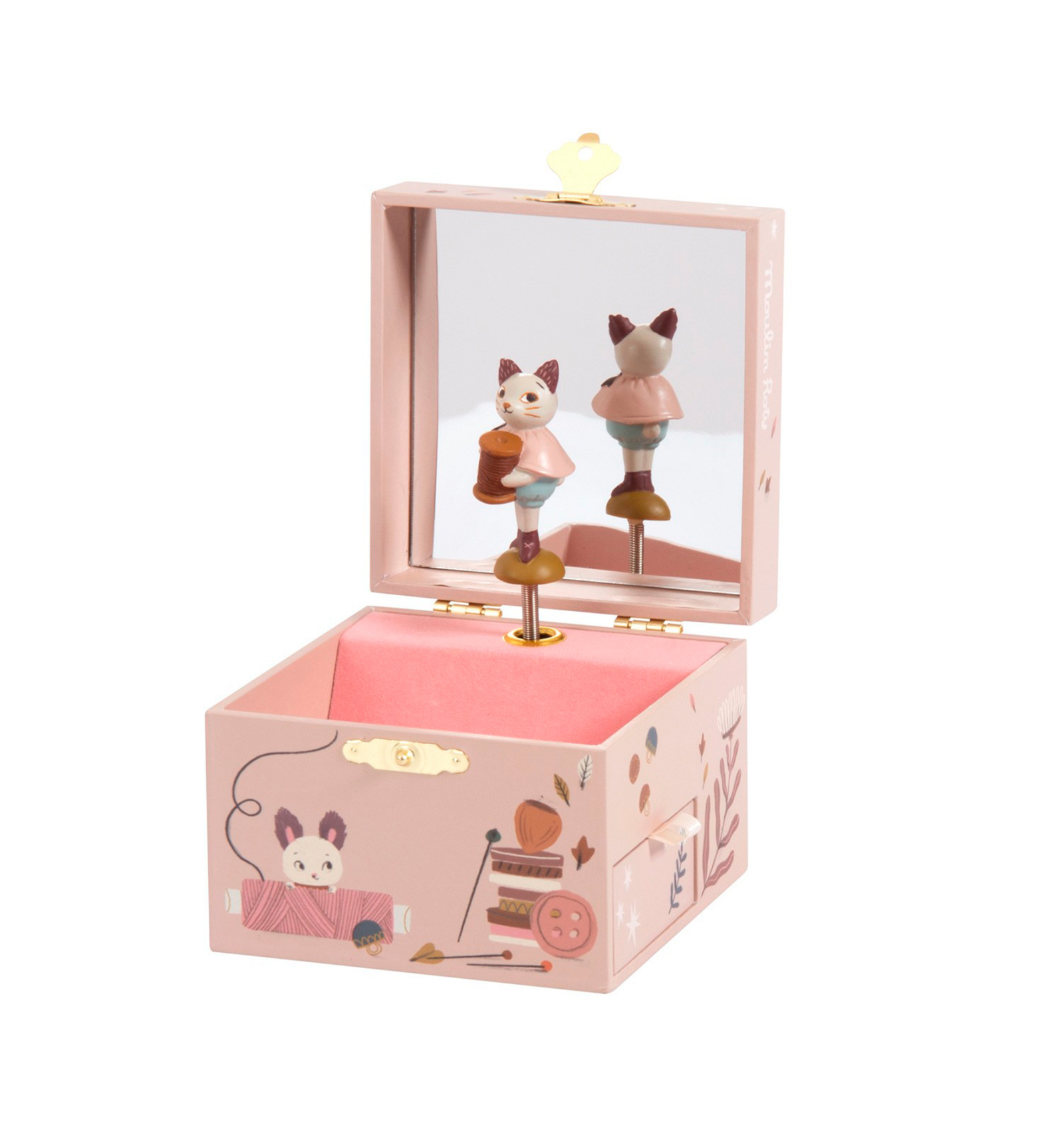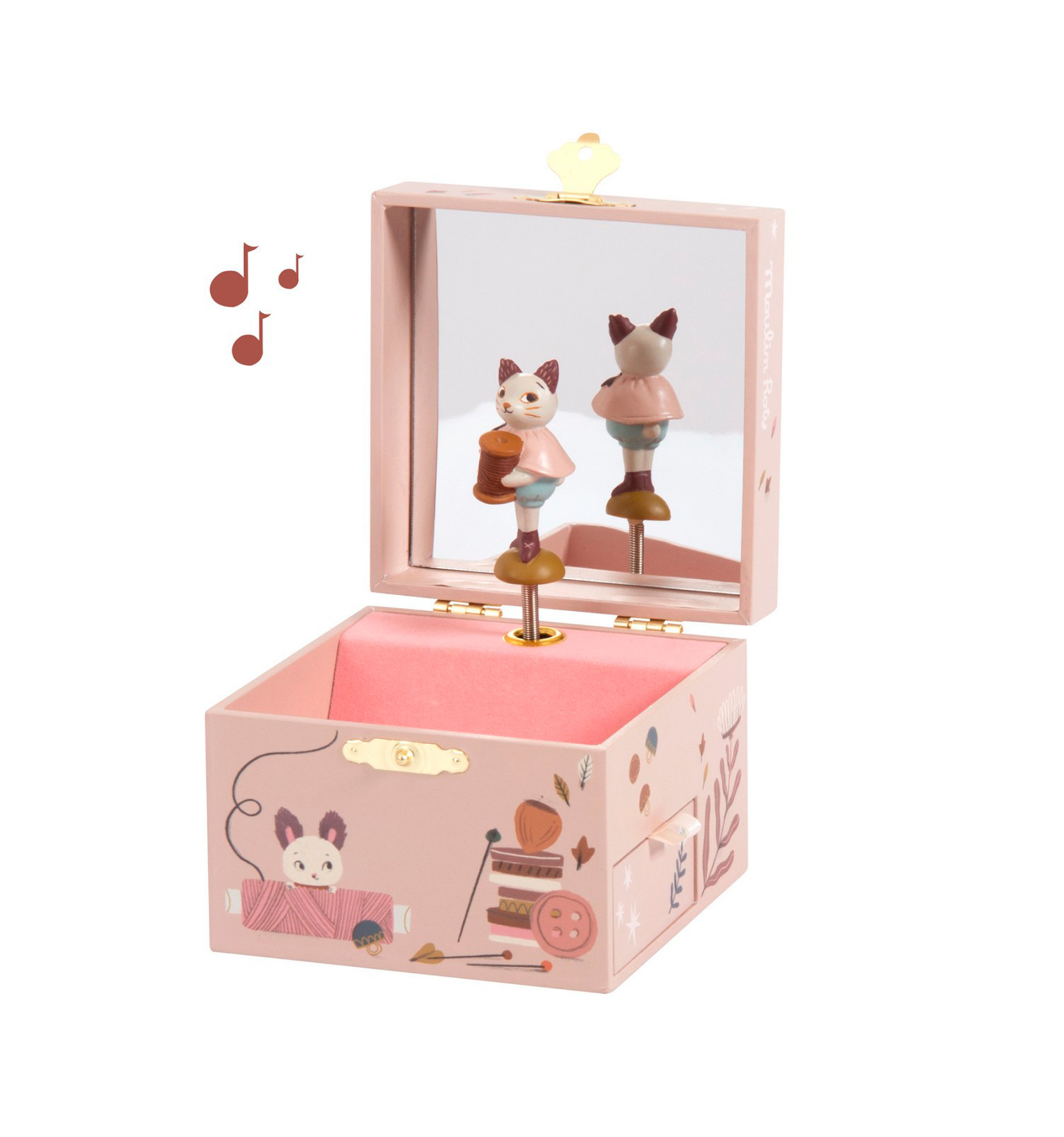 ¿Quién no quiso alguna vez una caja de música? Esta cajita musical de Moulin Roty está bellamente ilustrada con una ratita que gira al son de la música. Hecha de madera y fieltro, tiene un espejo y un cajoncito, para guardar joyas, tesoros o secretos. Tamaño: 10,5 x 10,5 x 8,5 cm.