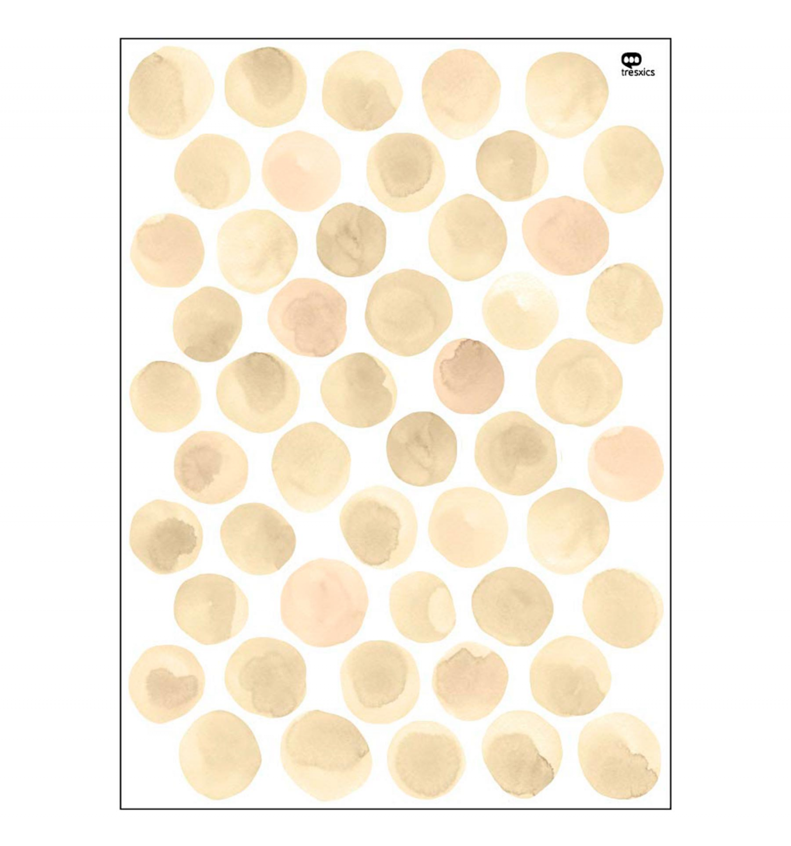 Pequeños detalles que hacen grandes cambios. Preciosos stickers en forma de Puntos y técnica de acuarela. Una lámina con adhesivos decorativos para transformar rincones o habitaciones enteras. Fáciles de aplicar, simplemente despegando las figuras del papel y pegándolas en la superficie. No daña la pared.