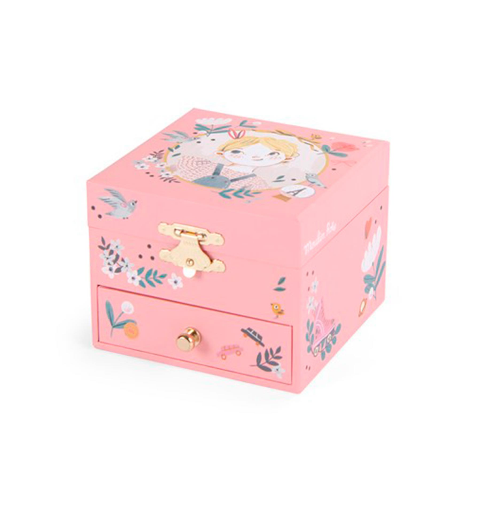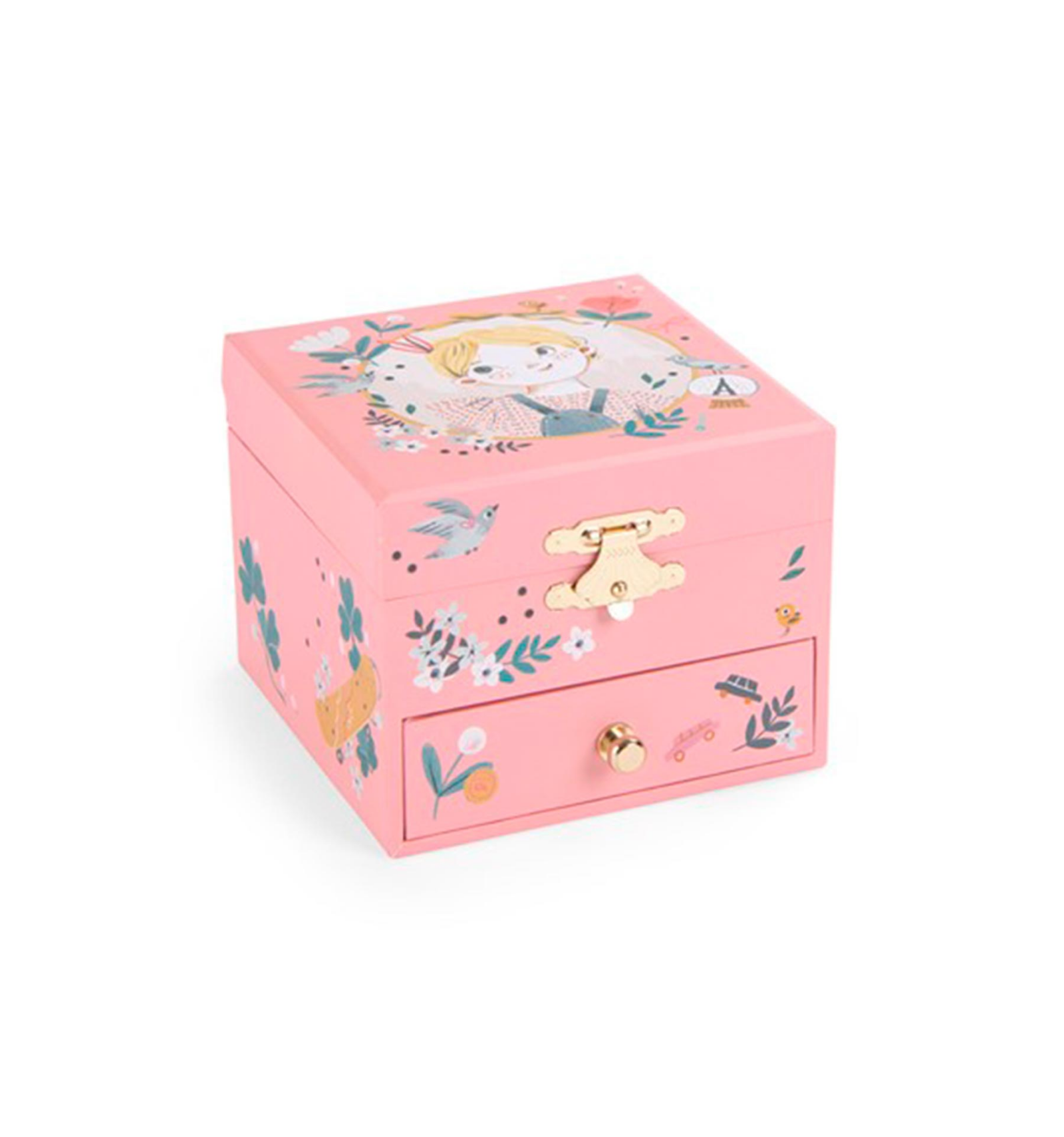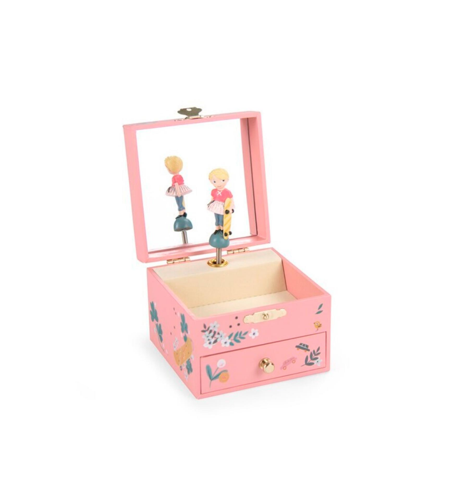 Caja de música "Les Parisiennes" ilustrada por Lucille Michieli. Al abrirla, Églantine gira sobre los tejados de París con su patineta. Incluye un compartimento para guardar joyas y secretos. Fabricada en madera y resina con superficie lavable. Ideal para niños desde 3 años. Dimensiones: 10,5 x 10,5 x 8,5 cm.