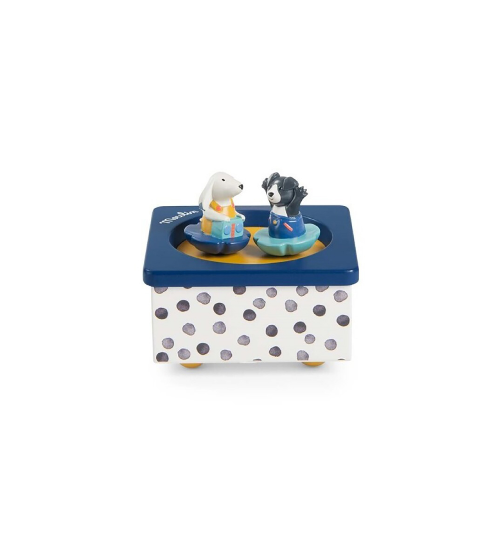 La caja musical Puce & Pilou de Moulin Roty combina música, movimiento y encanto visual en un solo juguete. Al darle cuerda, los personajes ilustrados giran y bailan al ritmo de una melodía suave, creando un efecto hipnótico y relajante para los más pequeños.