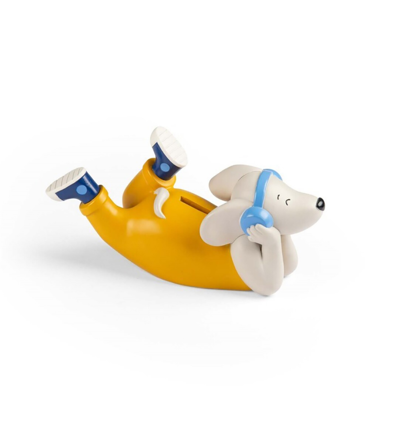 Enseña a ahorrar a tus peques con esta decorativa hucha. Hecha de resina en colores otoñales, pintada a mano, donde el perro Pilou de Moulin Roty escucha música relajadamente. Un excelente regalo para niños y niñas de todas las edades. Dimensiones 13x11x14 cm.
