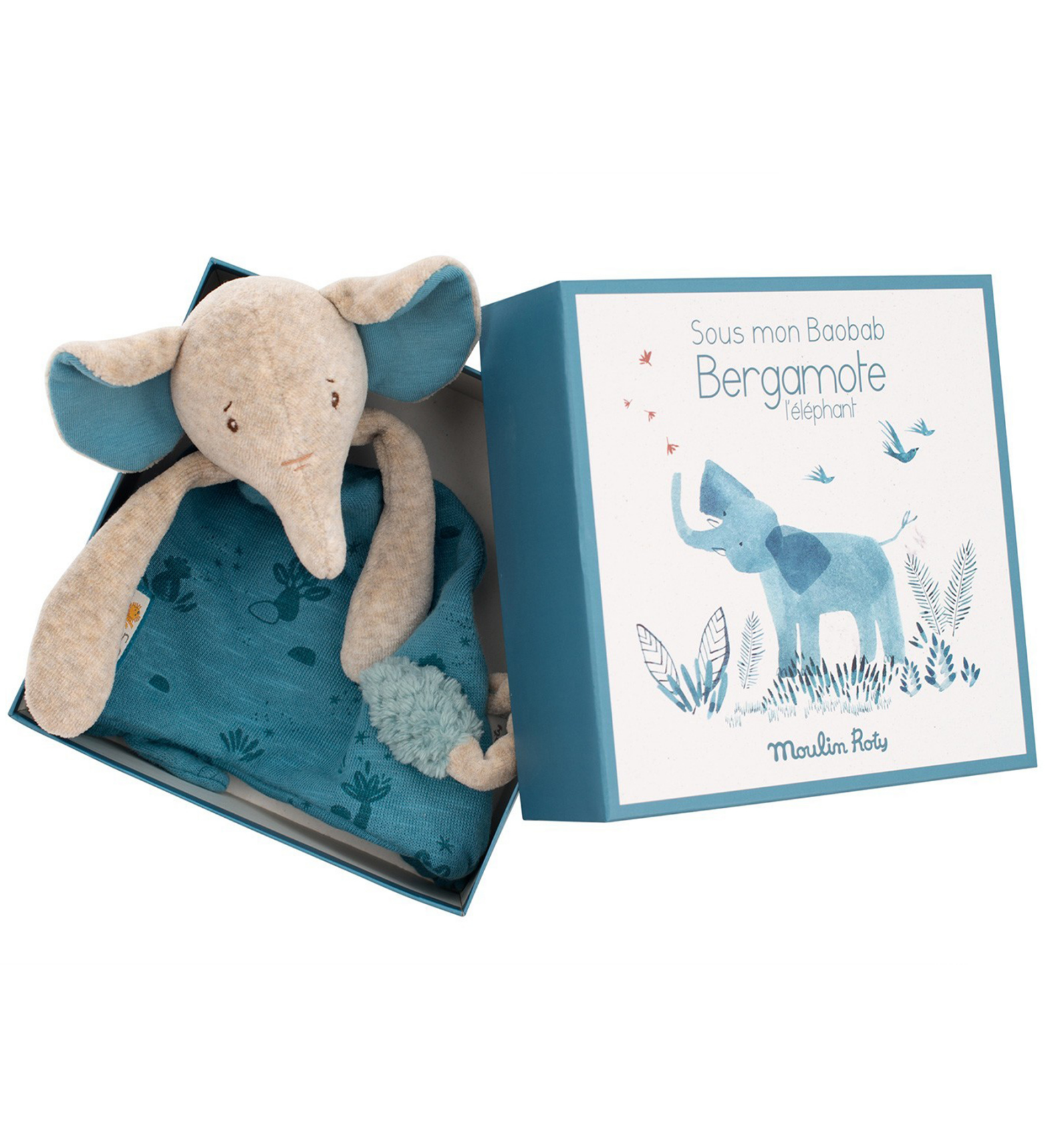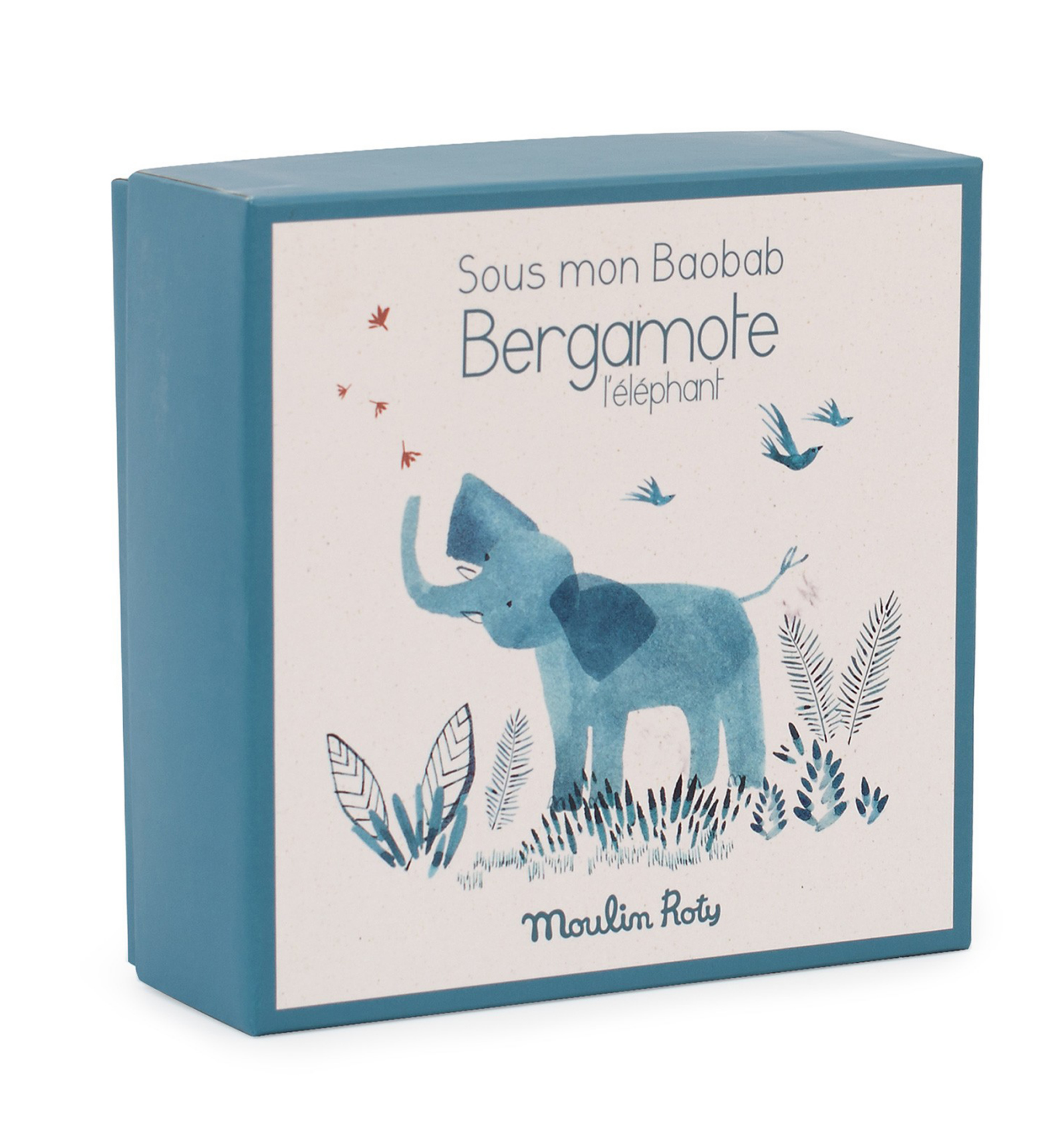 Doudou el elefante Bergamote de la colección "Bajo mi Baobab" de Moulin Roty.